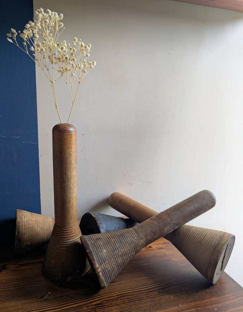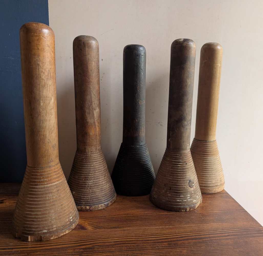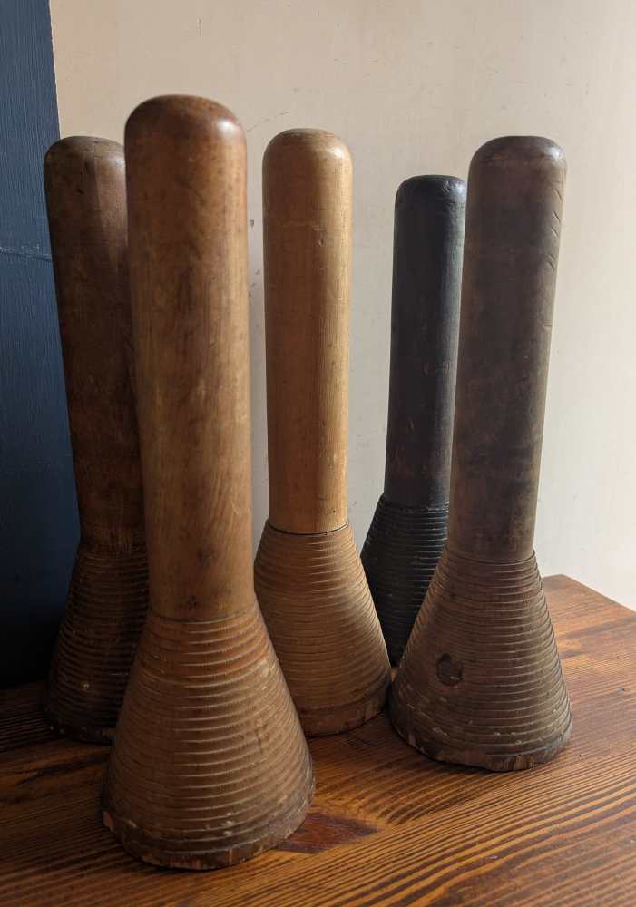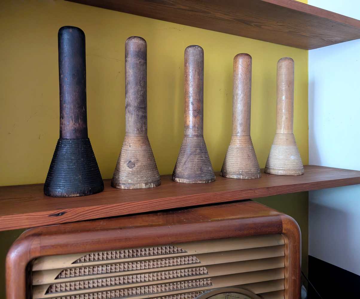 A collection of five large industrial mill bobbins from the early decades of the 1900s.