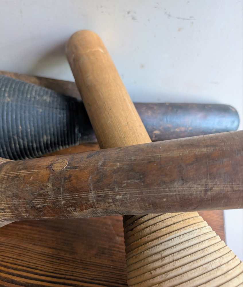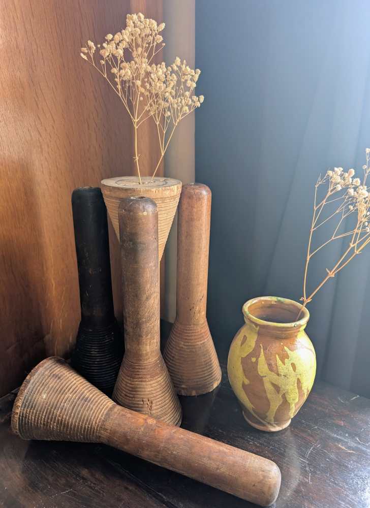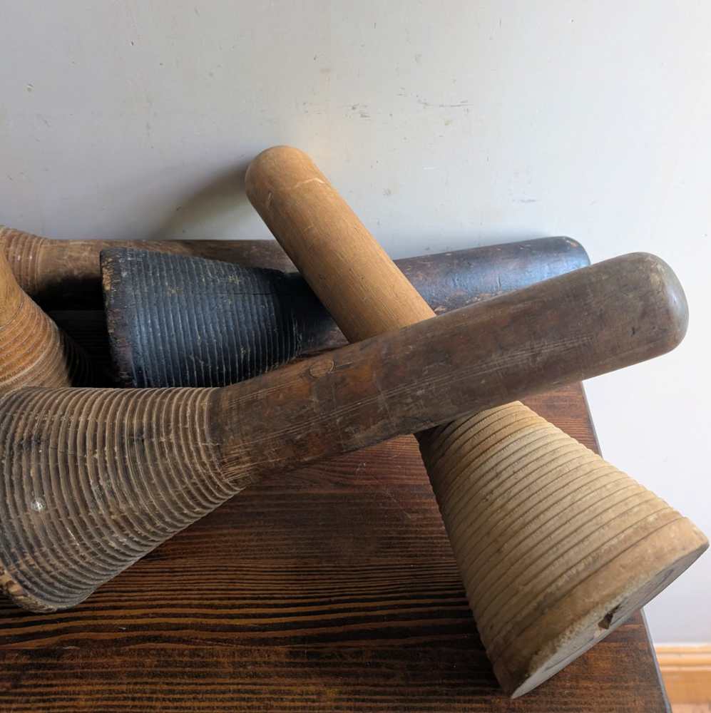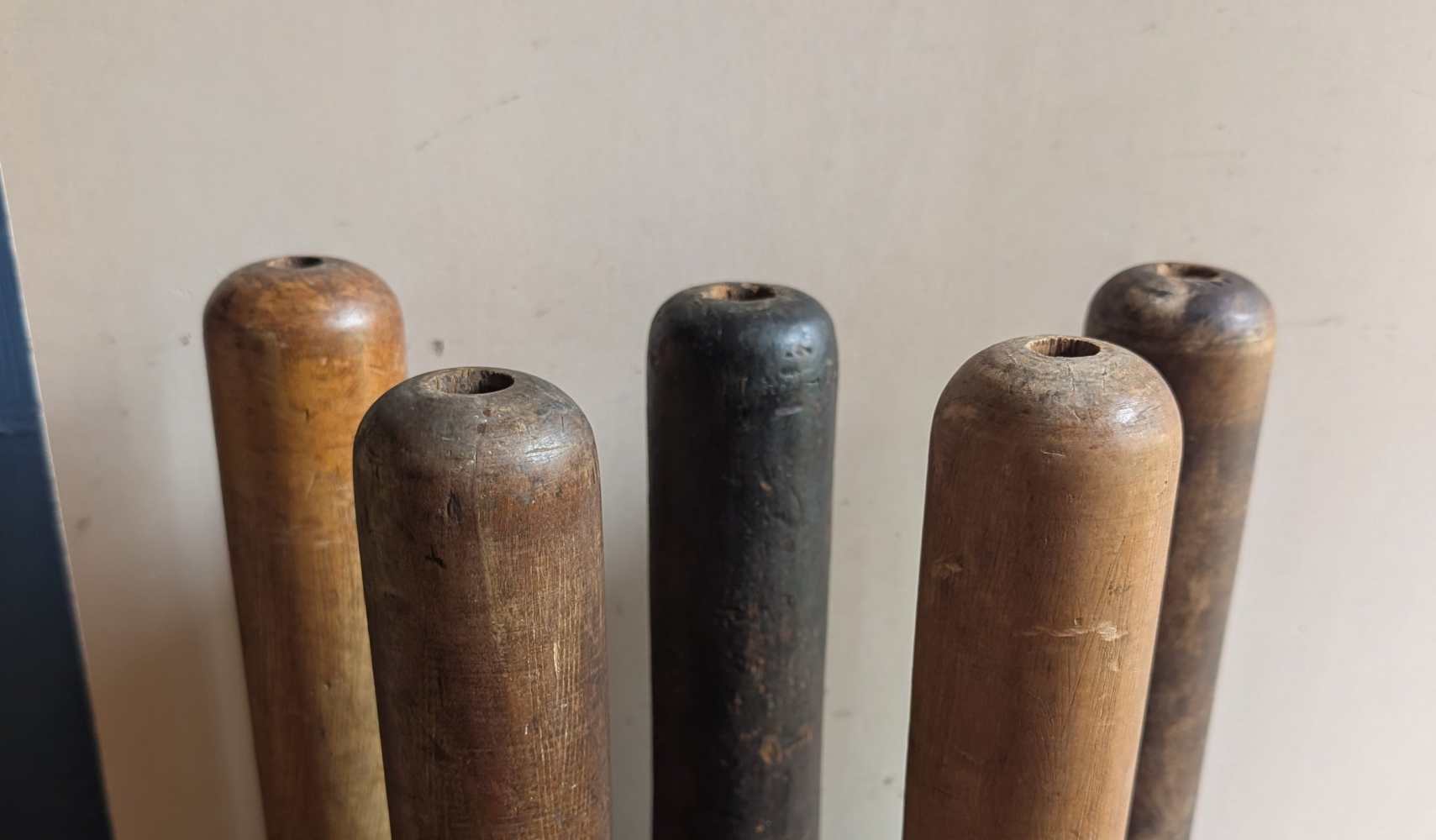 A collection of five large industrial mill bobbins from the early decades of the 1900s.