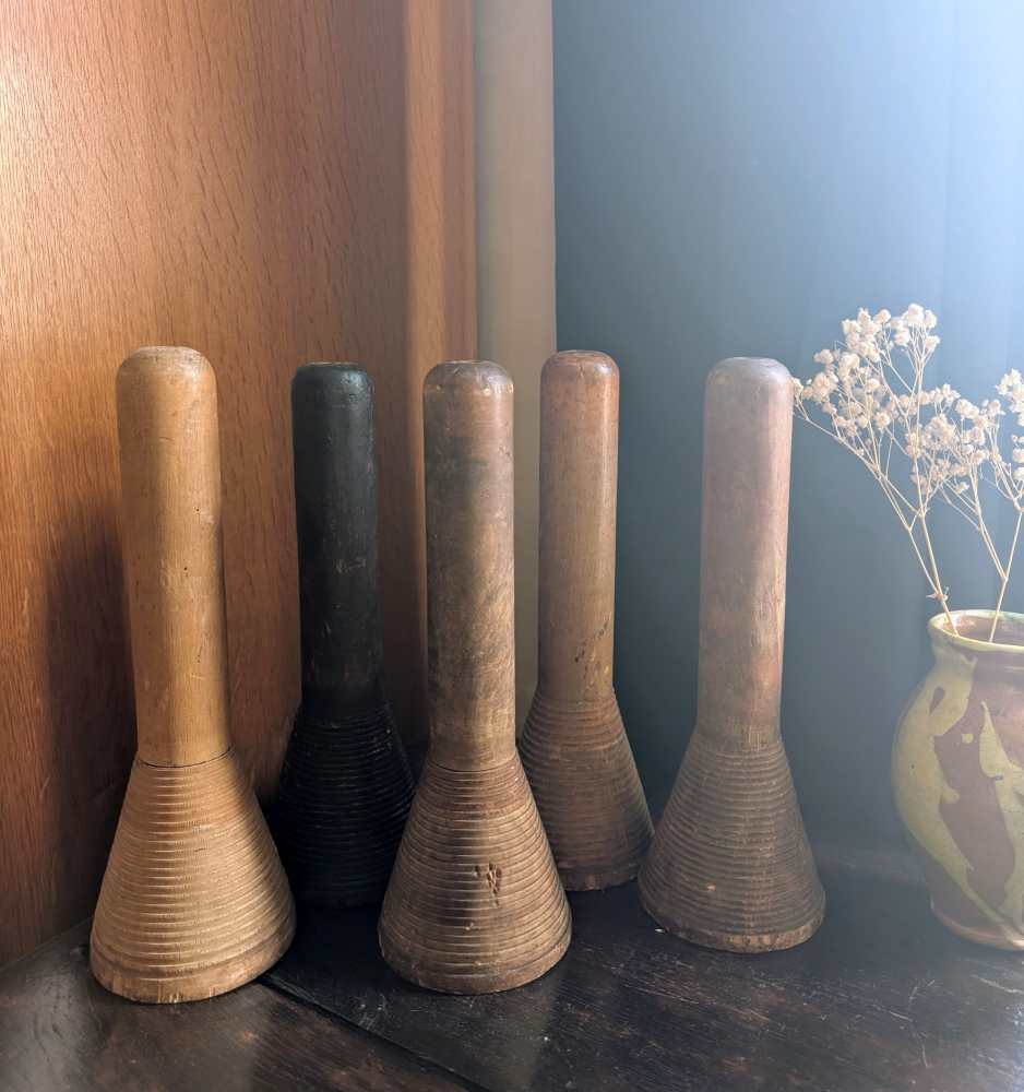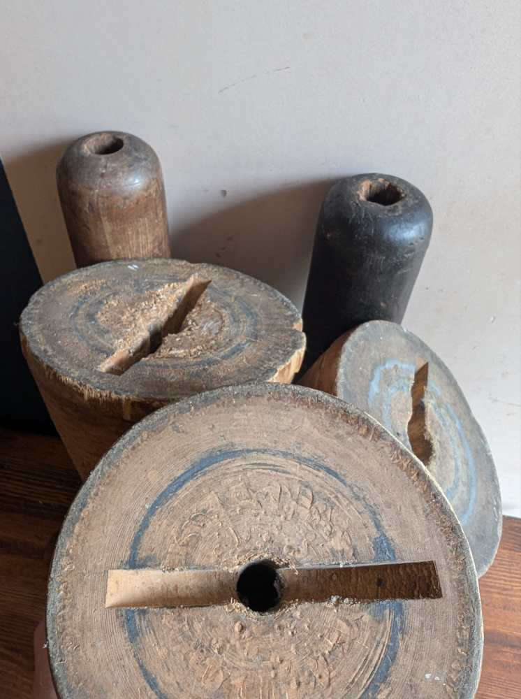 Set of 5 Large early 1900s wooden Northamptonshire mill bobbins