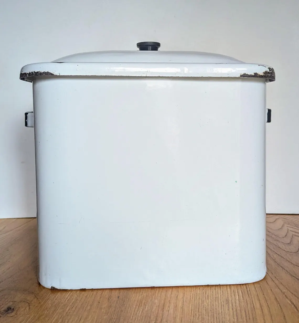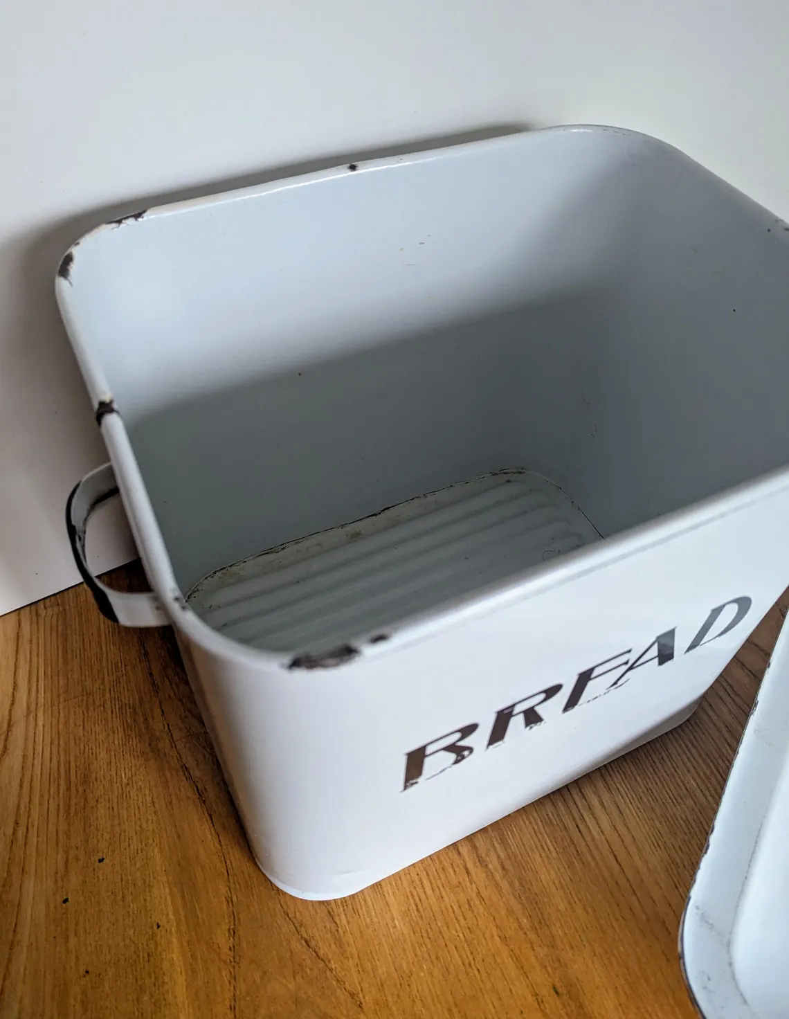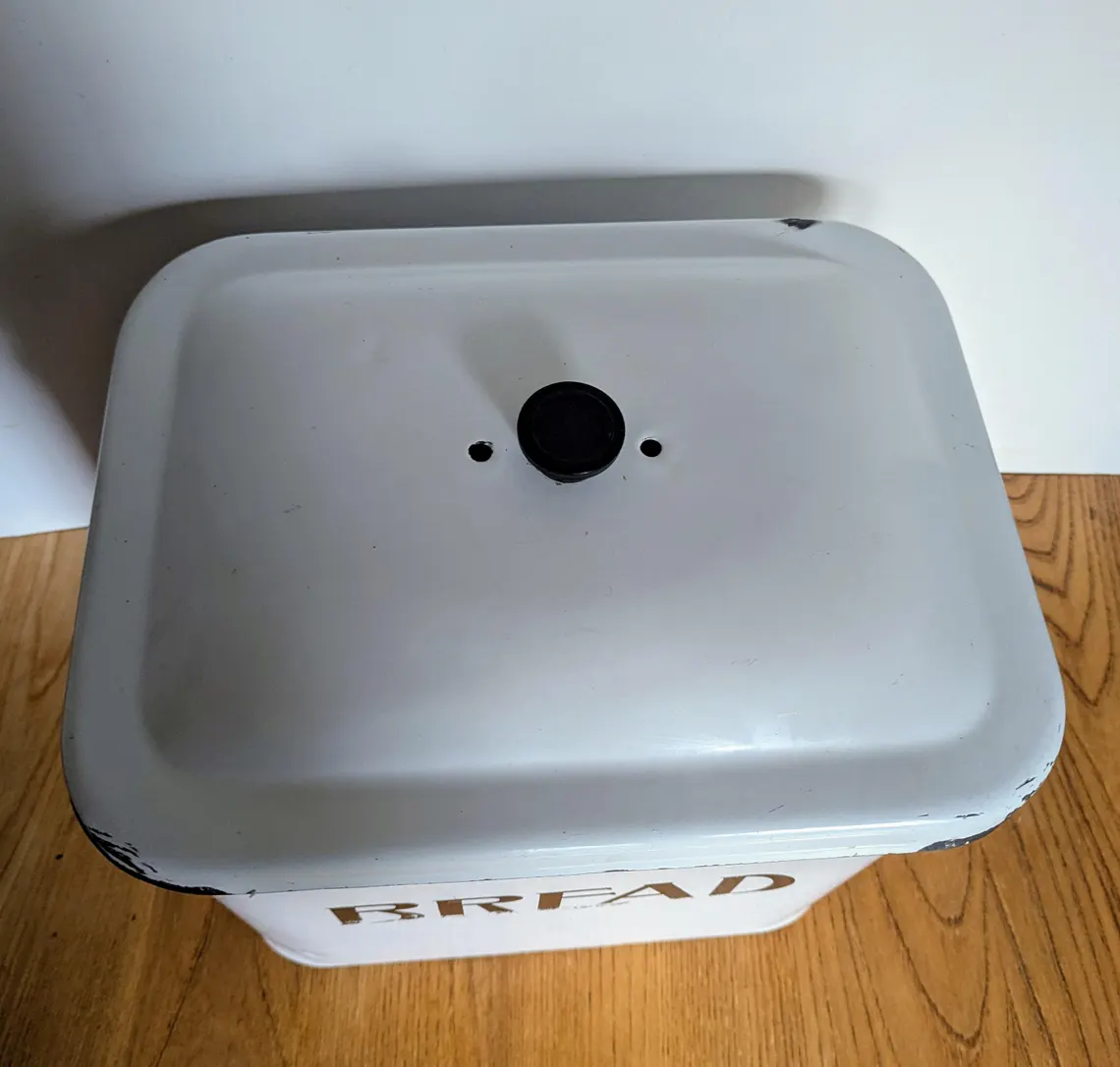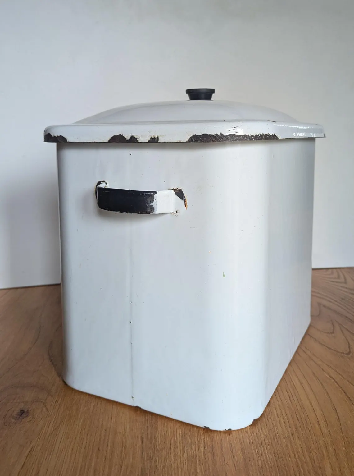 A rustic mid century large, farmhouse type white enamel bread bin.