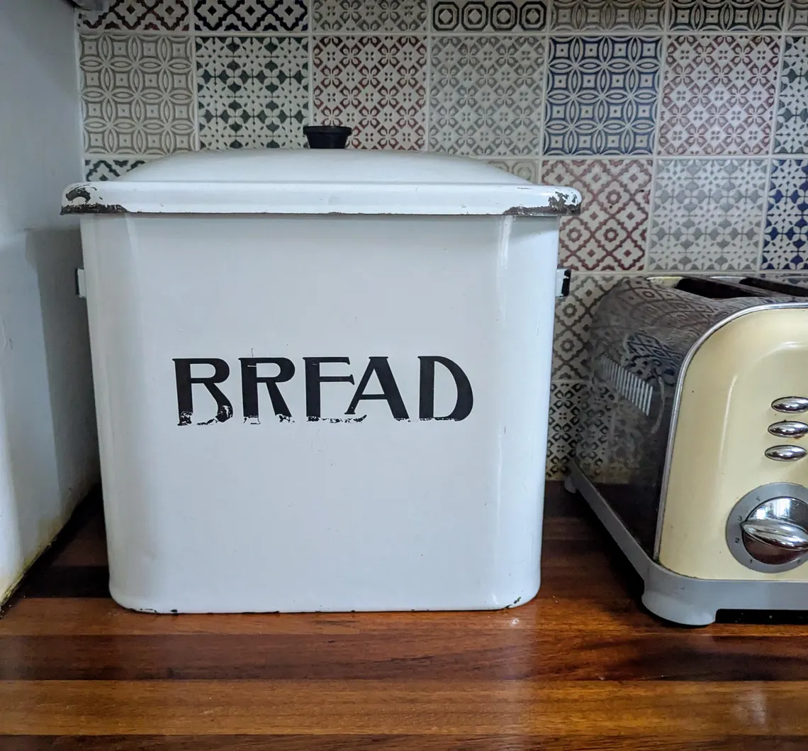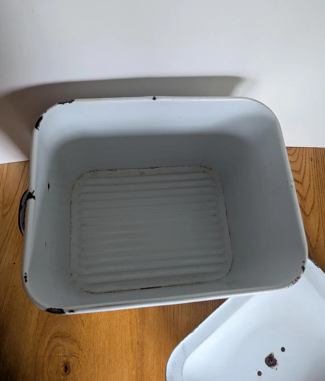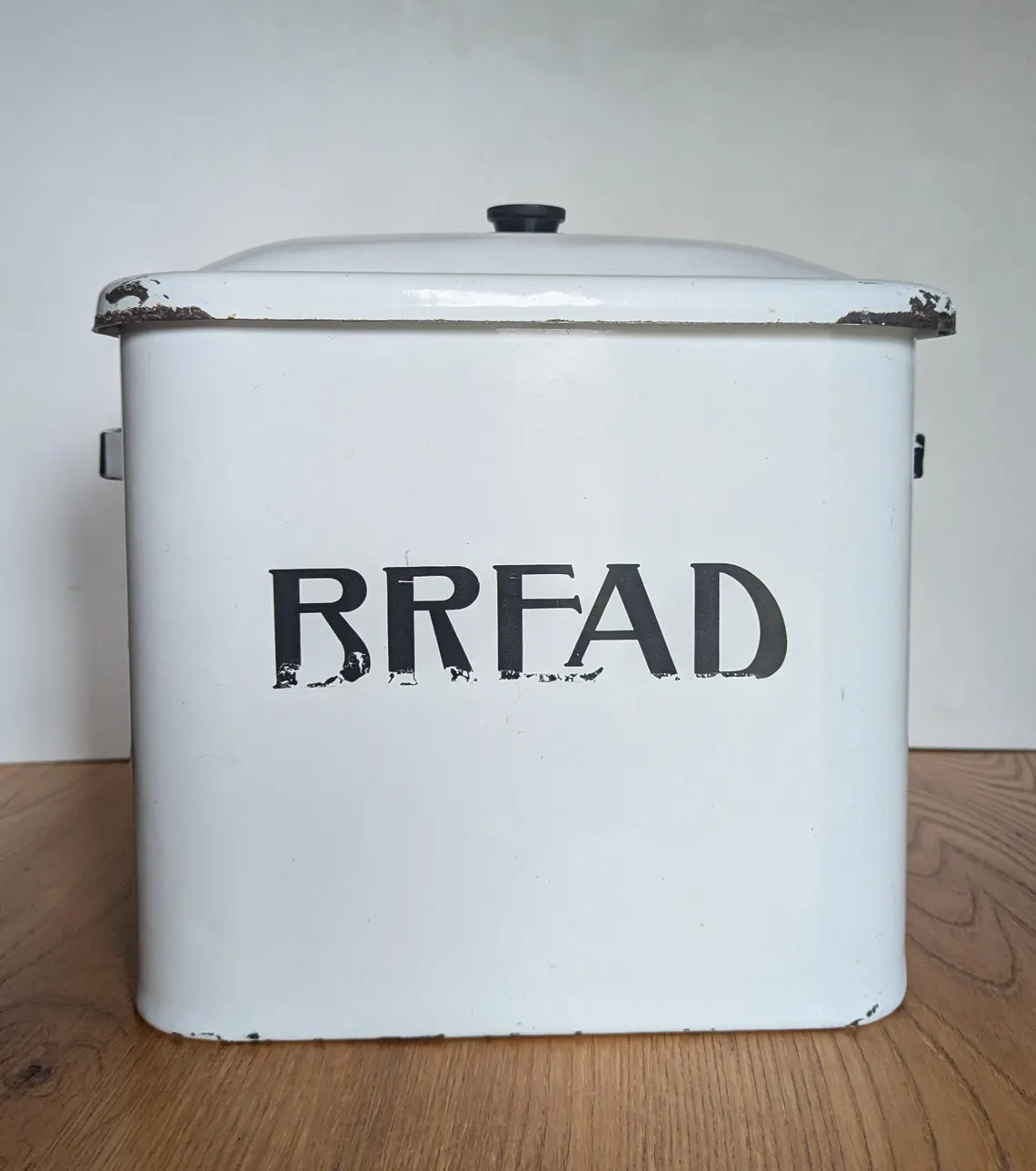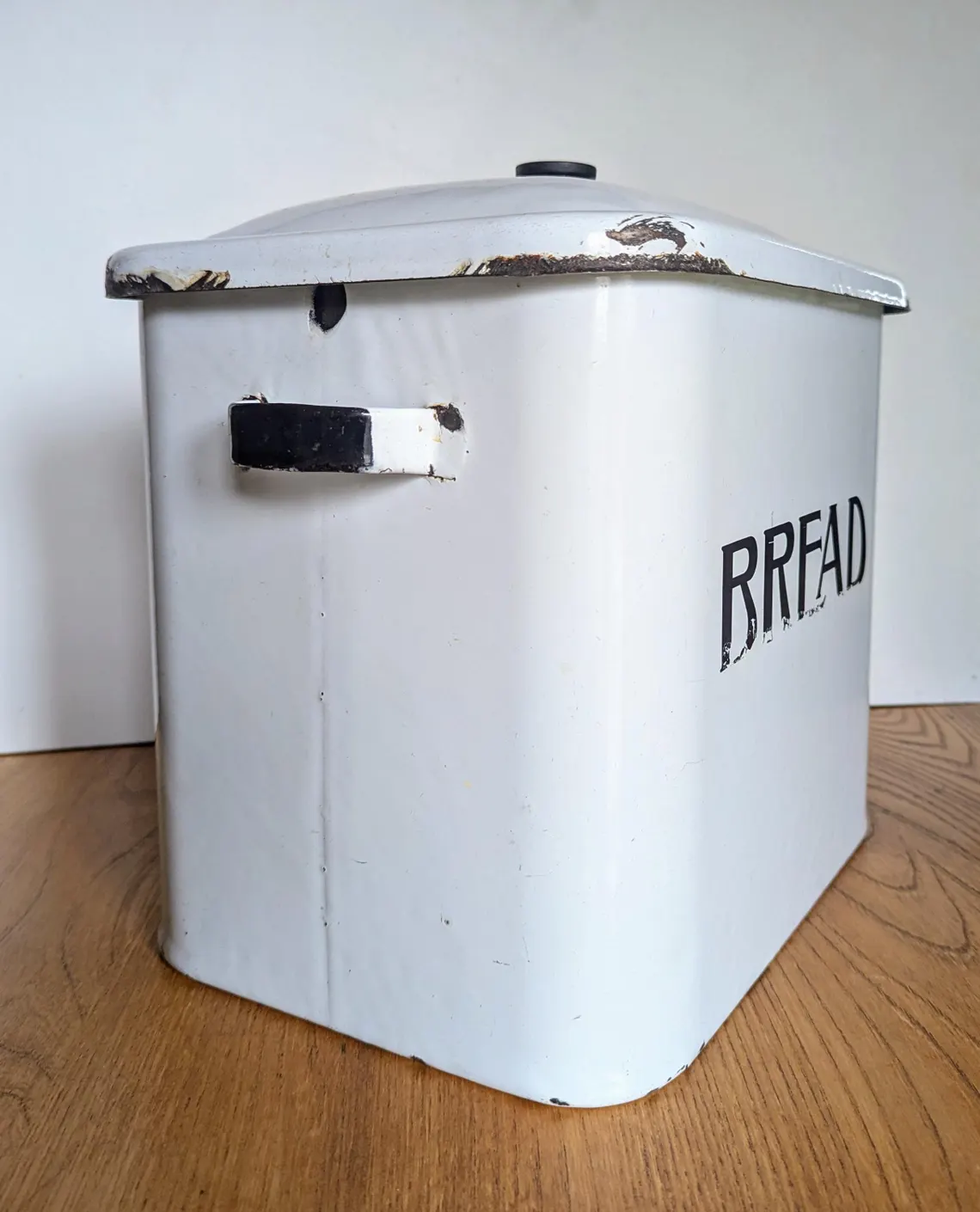 A rustic mid century large, farmhouse type white enamel bread bin.
