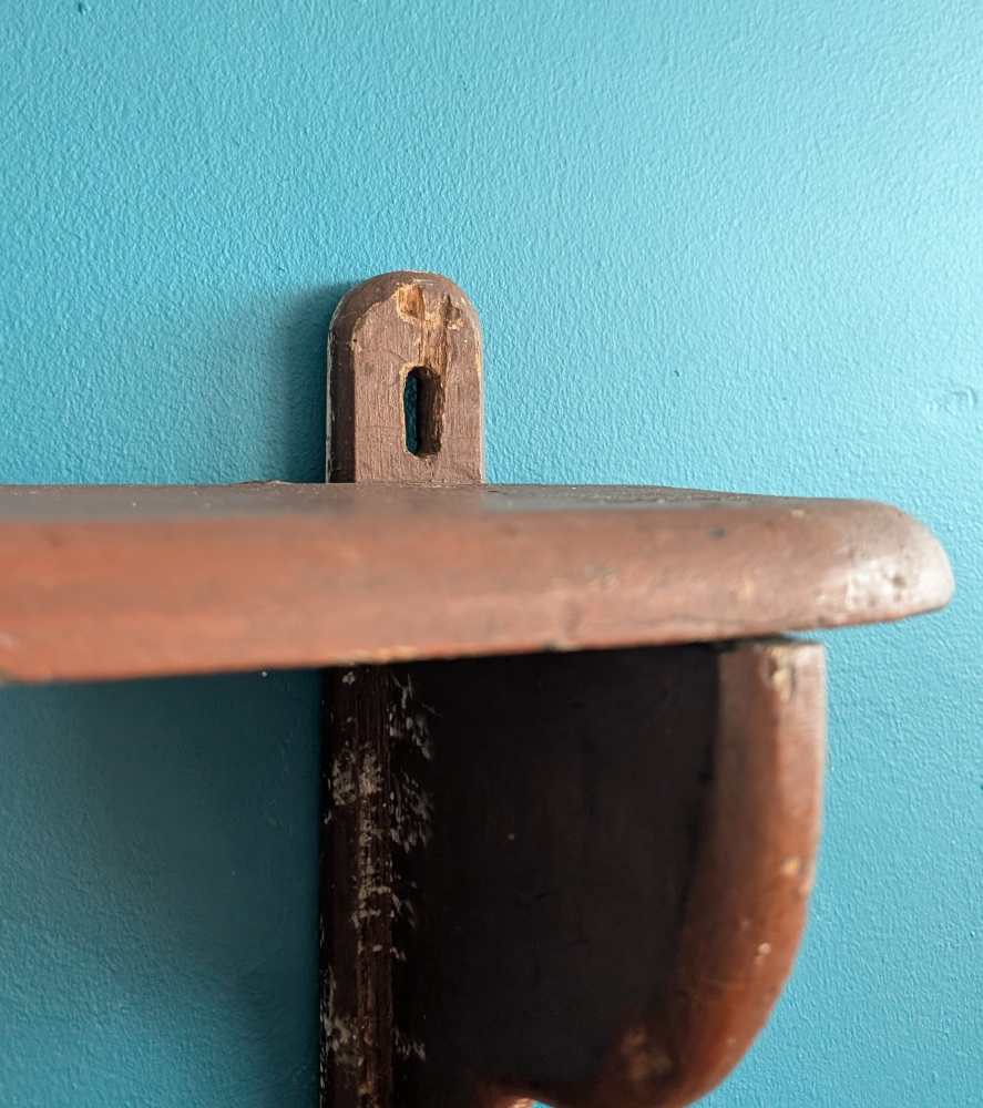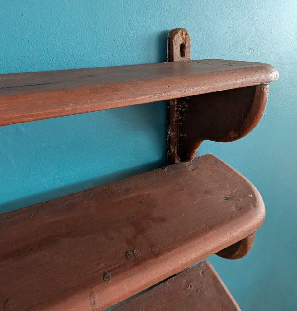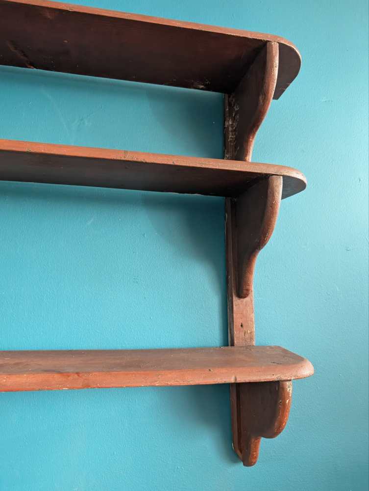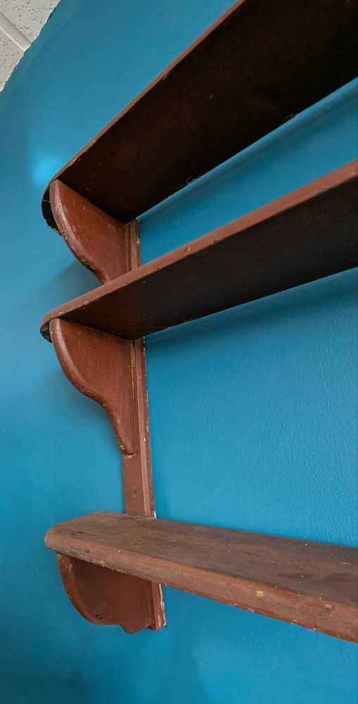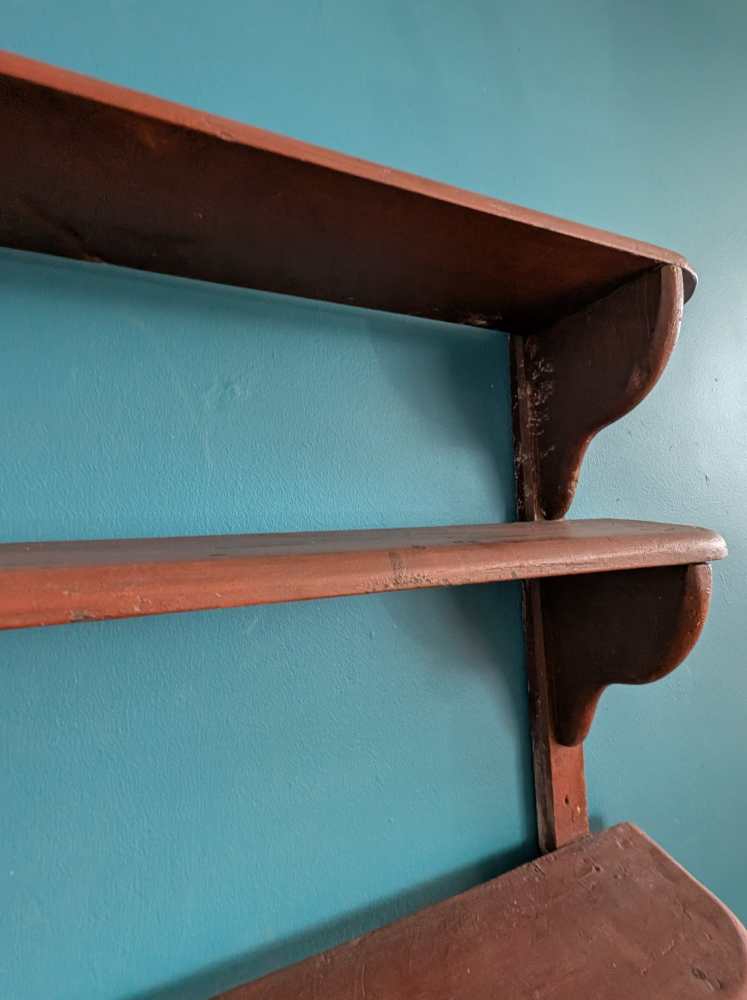 In its original brown paint, this large pine wall shelf dating from the early decades of the last century was sourced in France from a cottage in the countryside.
