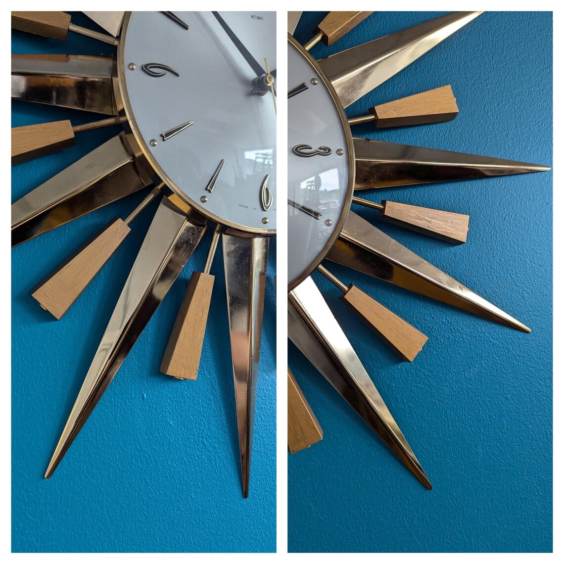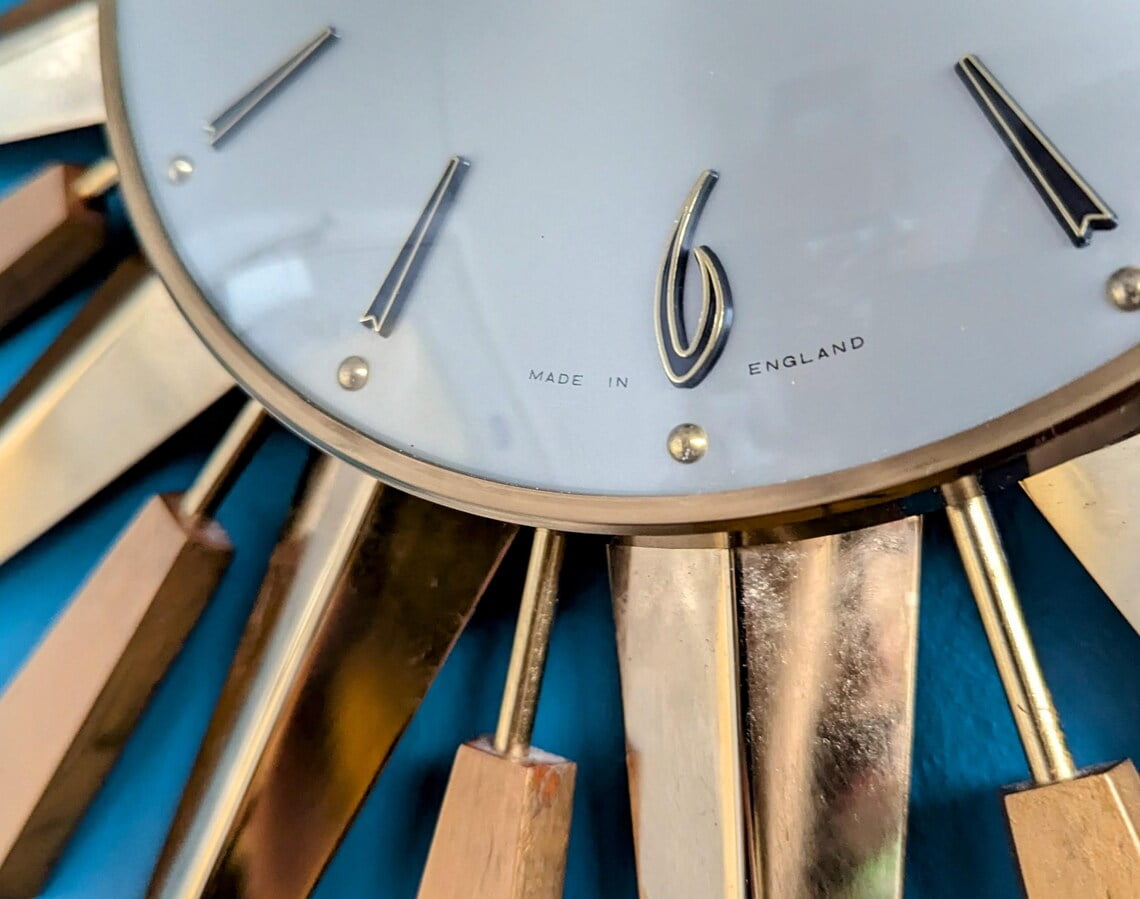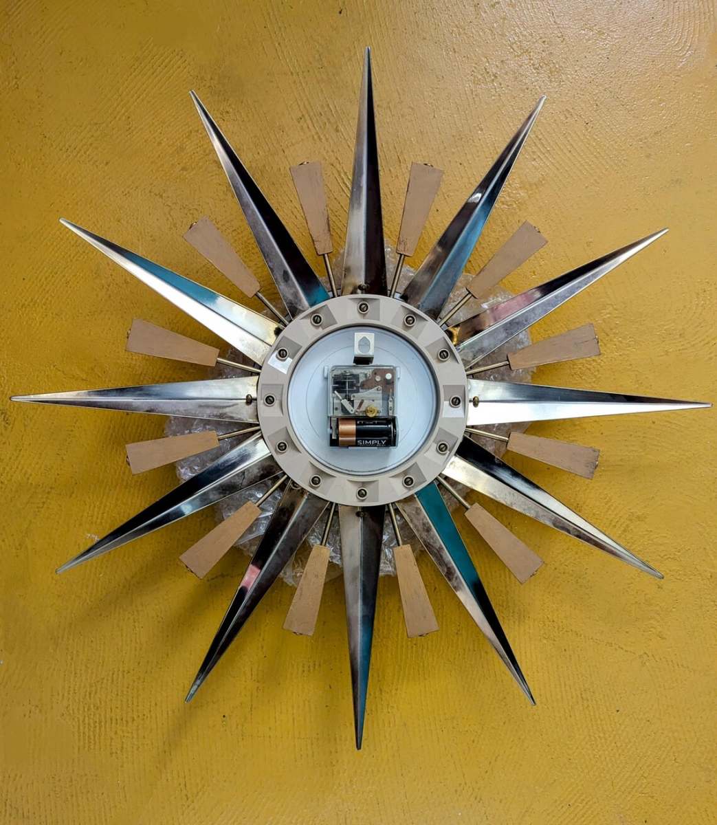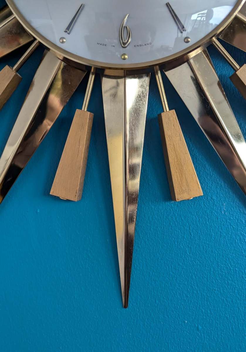 I cannot overstate what wonderful condition this piece is in, with no damage, chips or noticeable scratches to the teak wood wedges, and no bends or scratches in the metal spears. If you have been searching for the perfect Starburst, you will notice there’s often a piece missing from these. This clock is completely…complete!