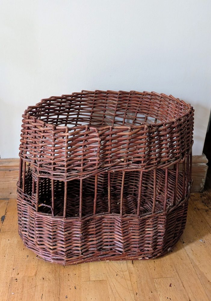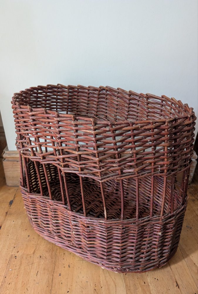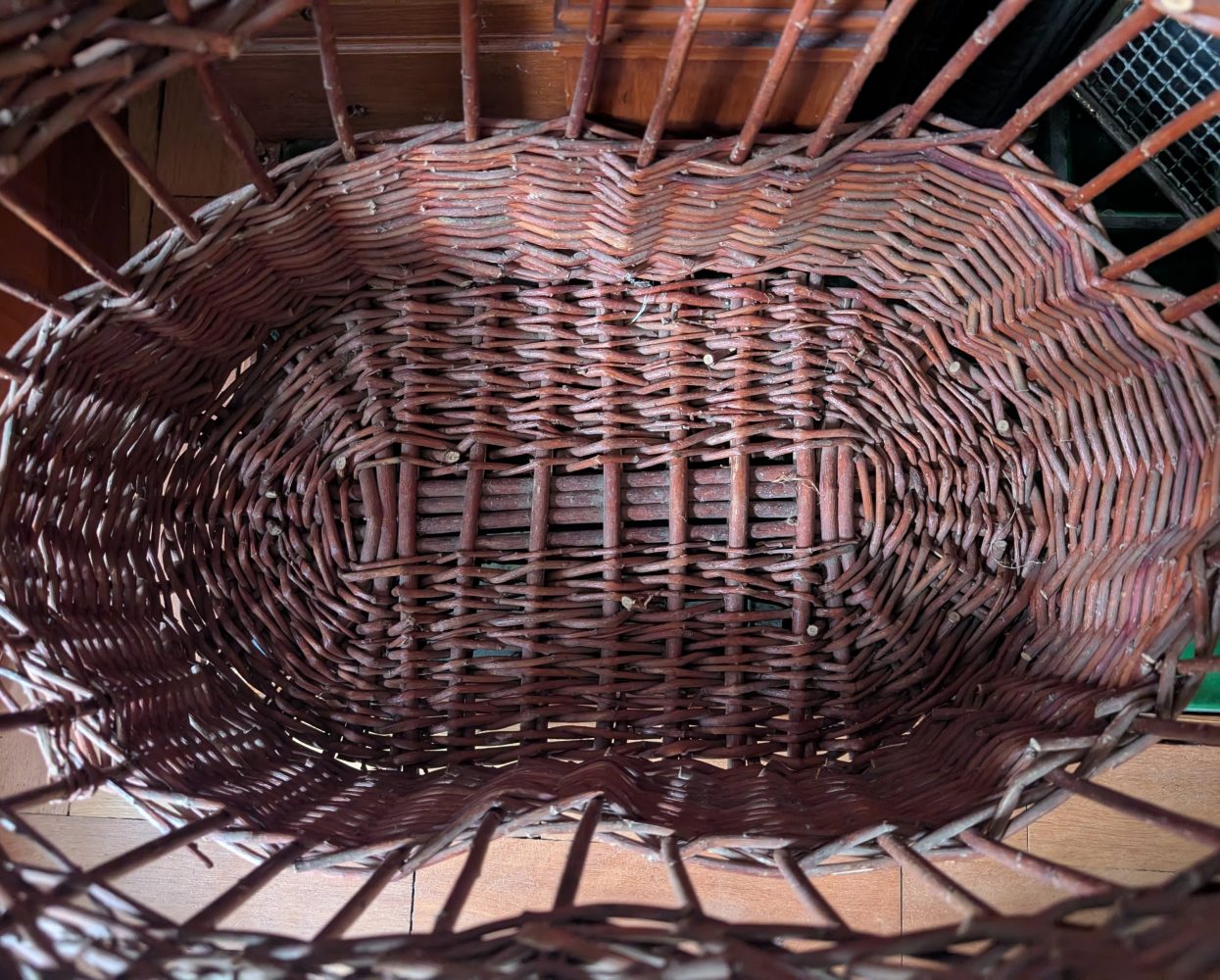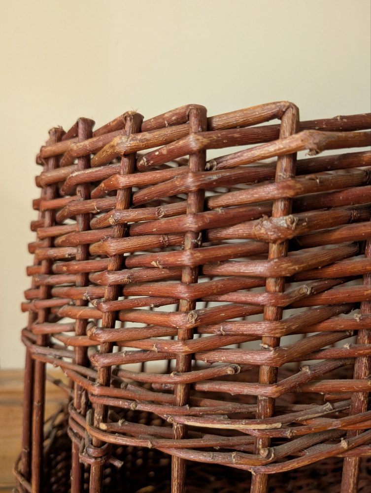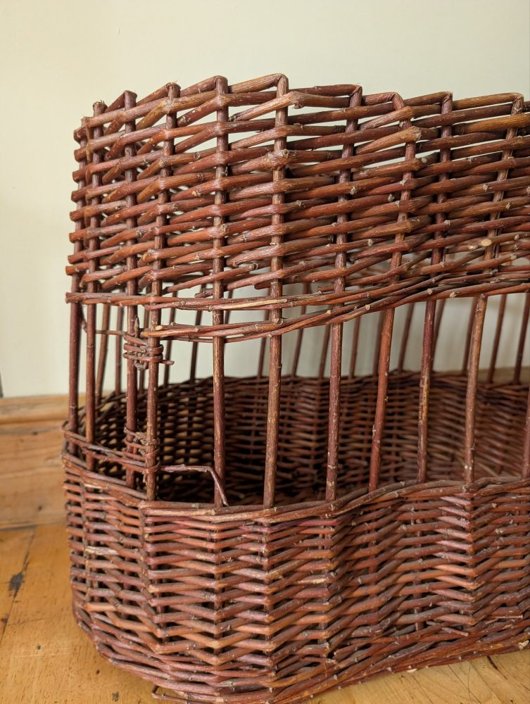 A nice, large, dark brown handmade Welsh woven wicker-work basket.