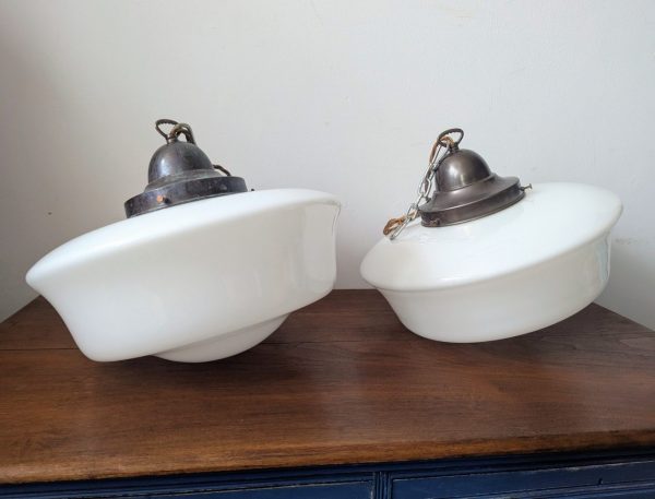 Matched pair of c.1930s large opaline glass Art Deco pendant lights with nickel galleries