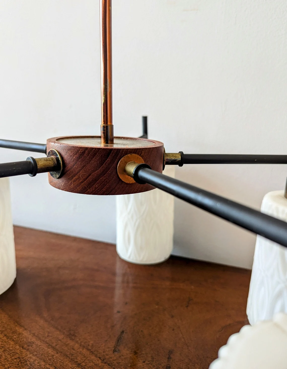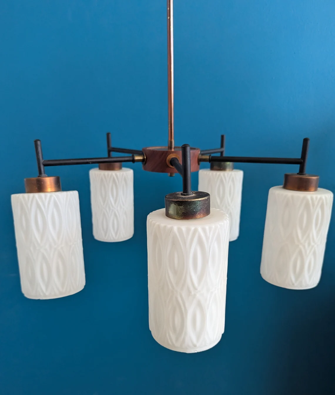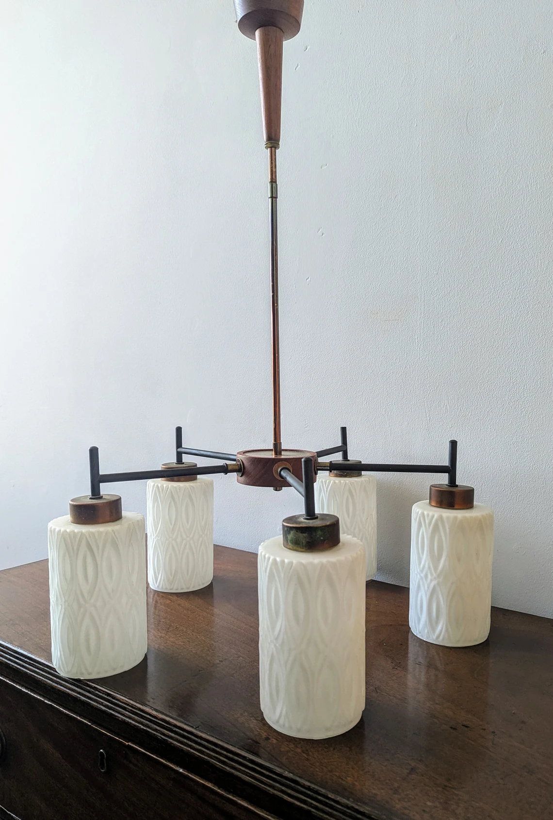 Mid century teak and milk glass five arm chandelier, teak and white glass vintage pendant light