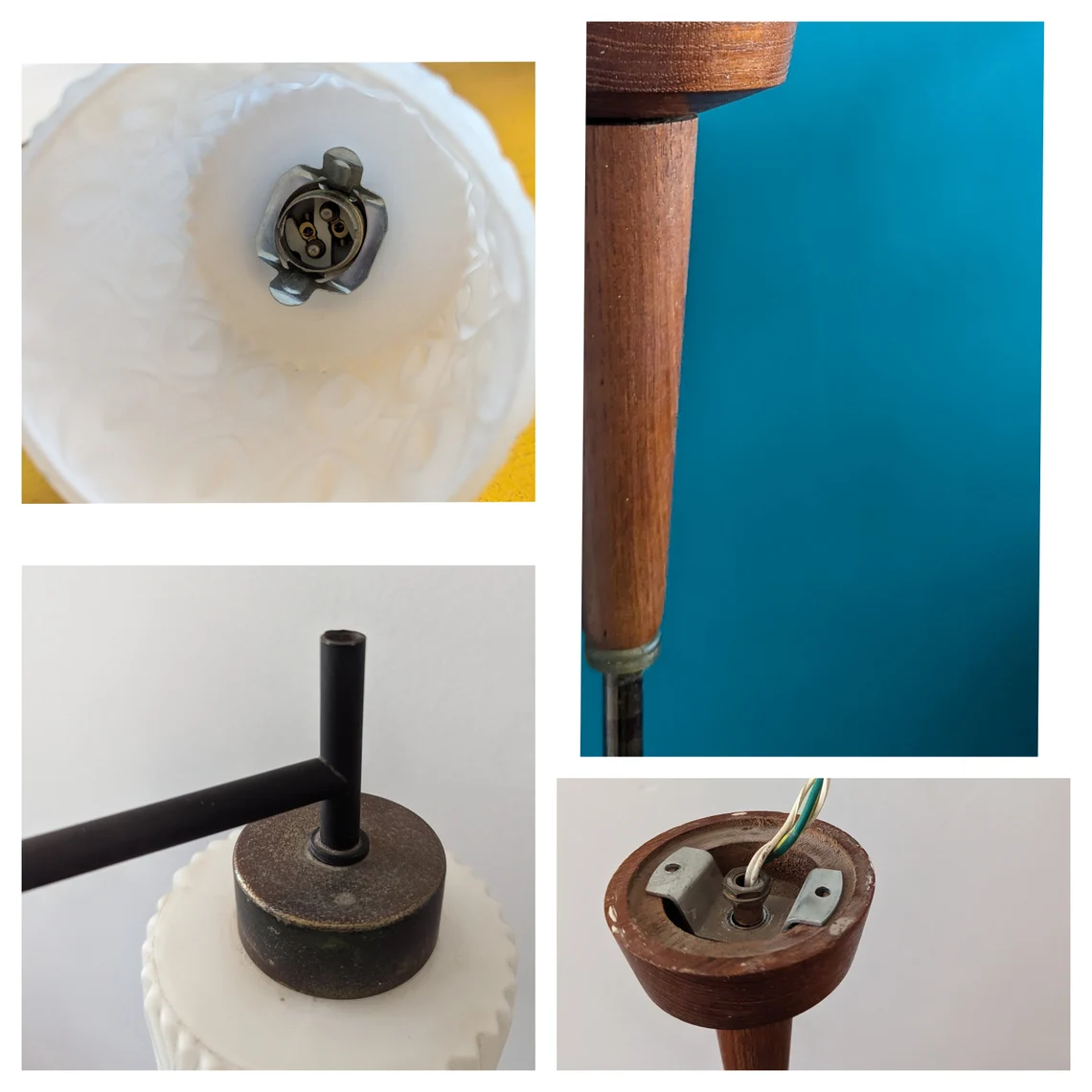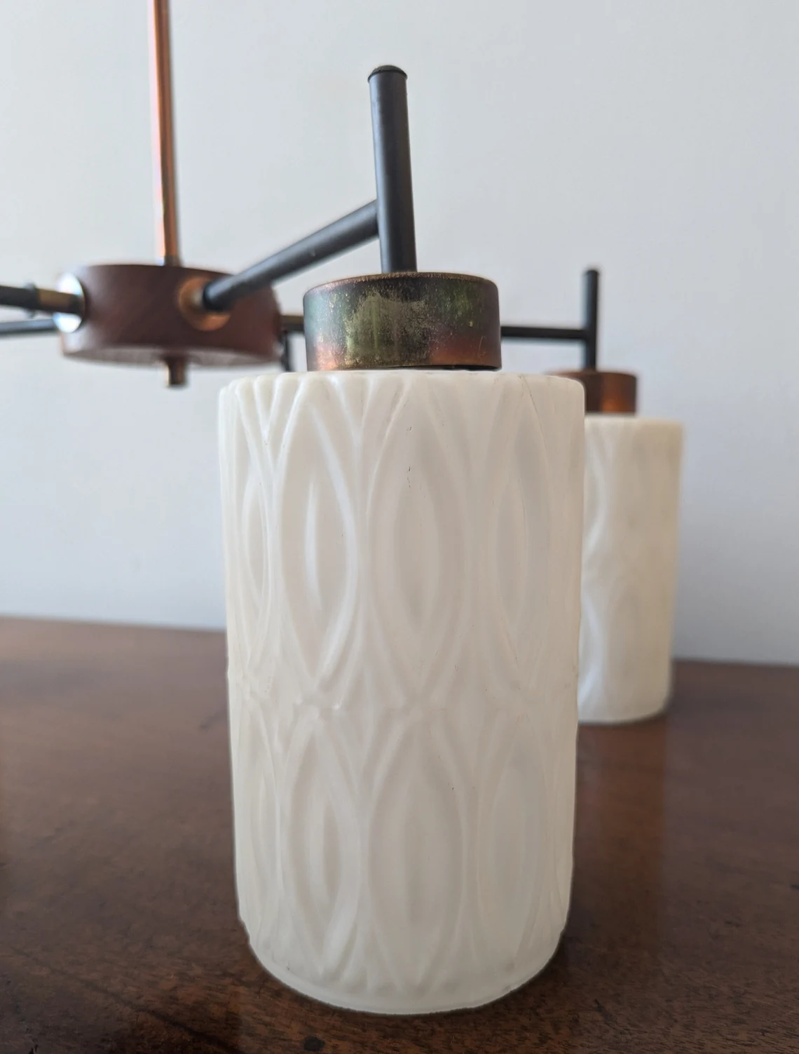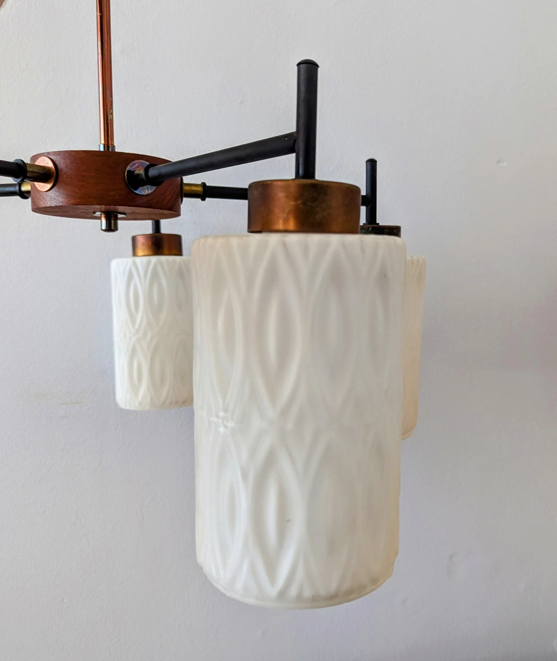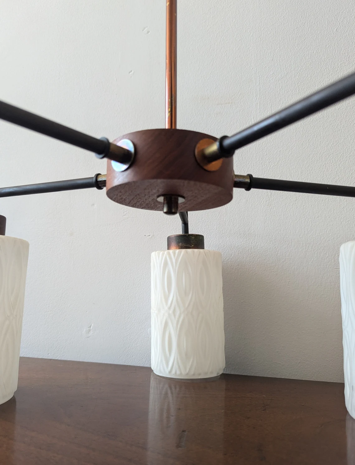 Mid century teak and milk glass five arm chandelier, teak and white glass vintage pendant light