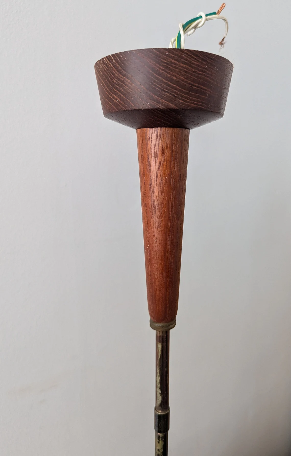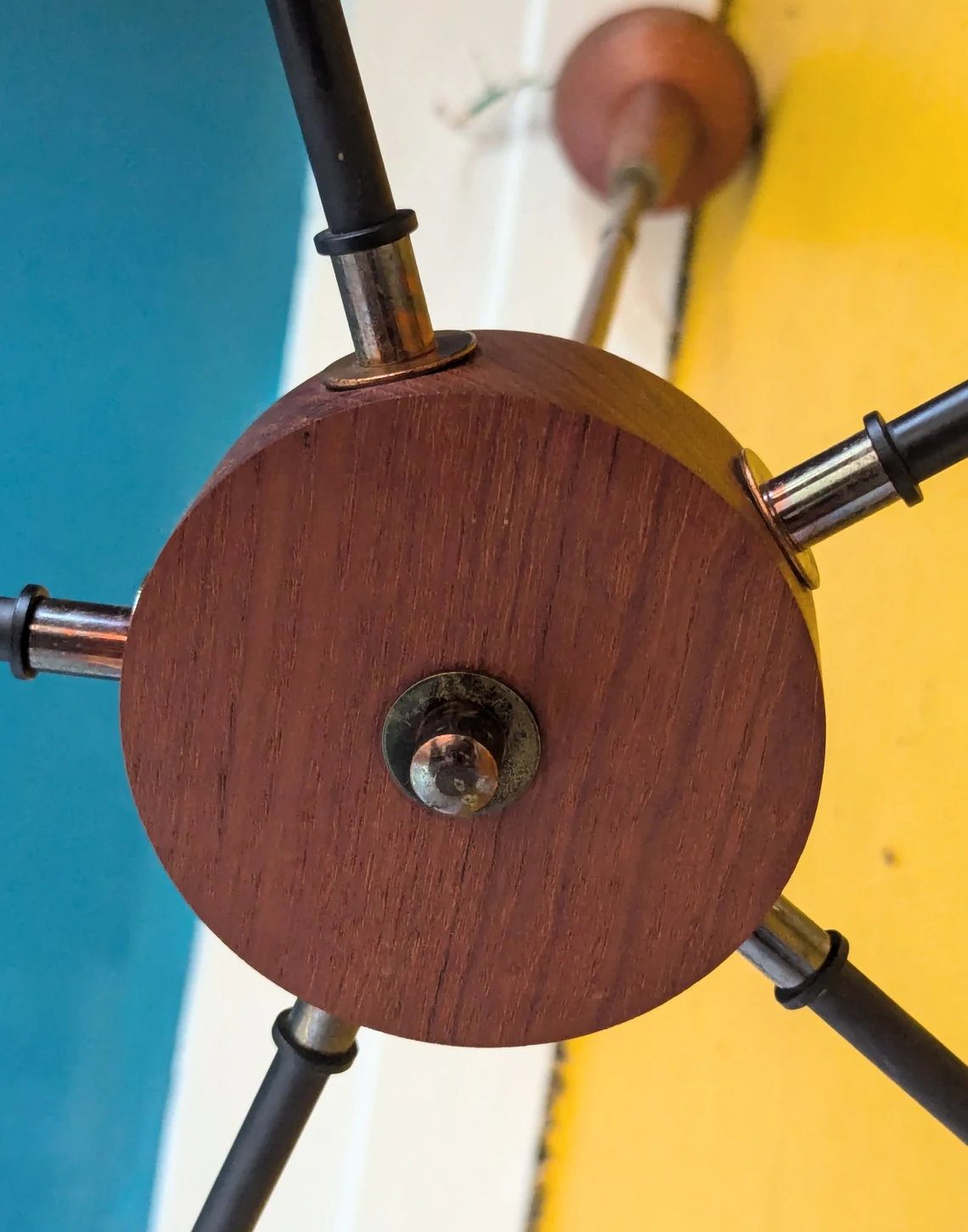 Five slender black arms merge at a circular teak centerpiece and the hanging pole is in age-muted brass. The overall effect is incredibly stylish.