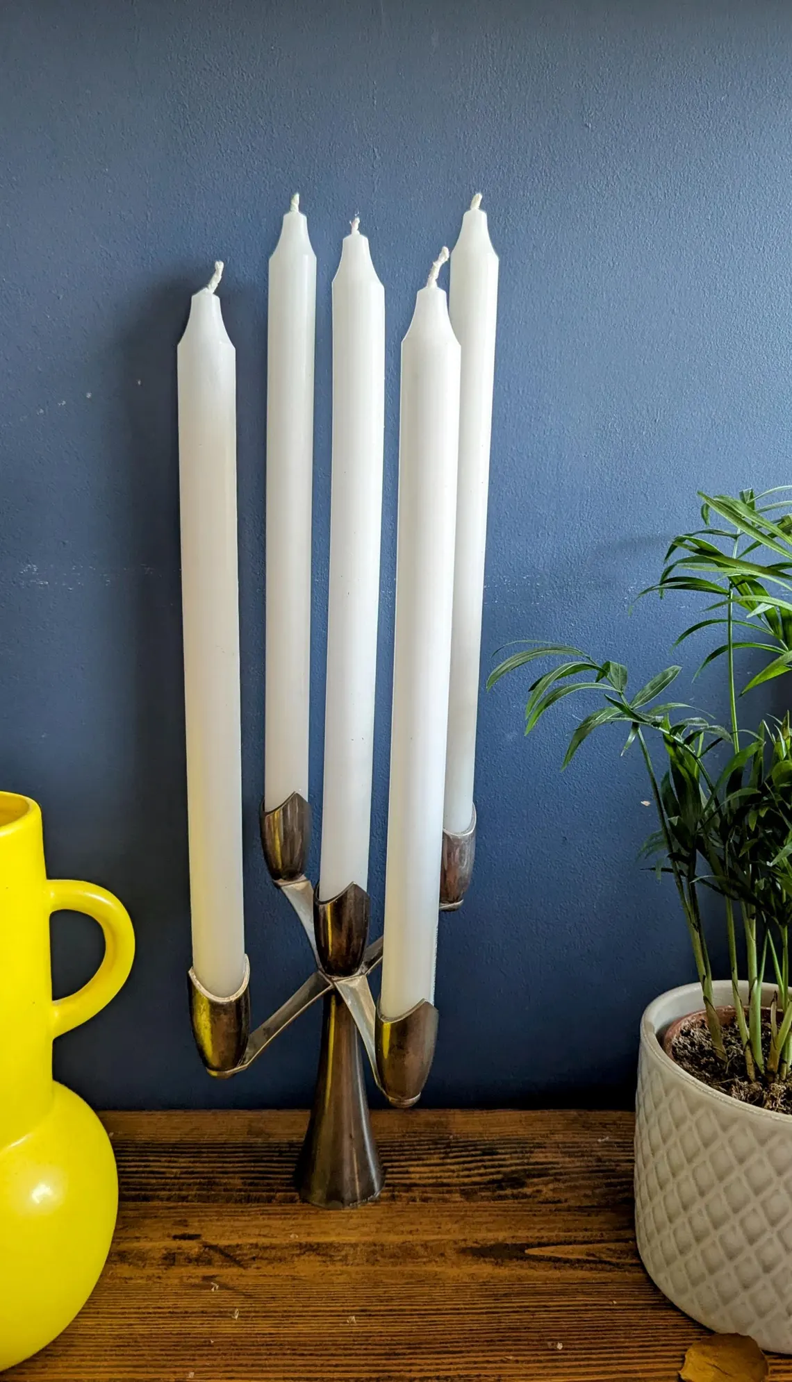 With stylish twin pointed capitals, a flared base, this will light any space beautifully with its give arms holding candles across three levels.