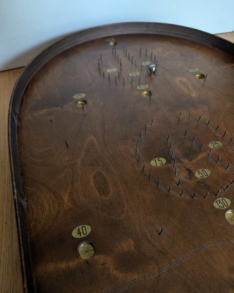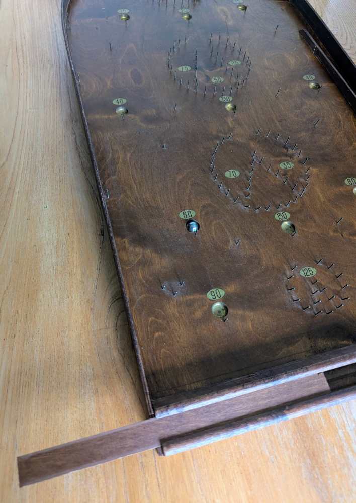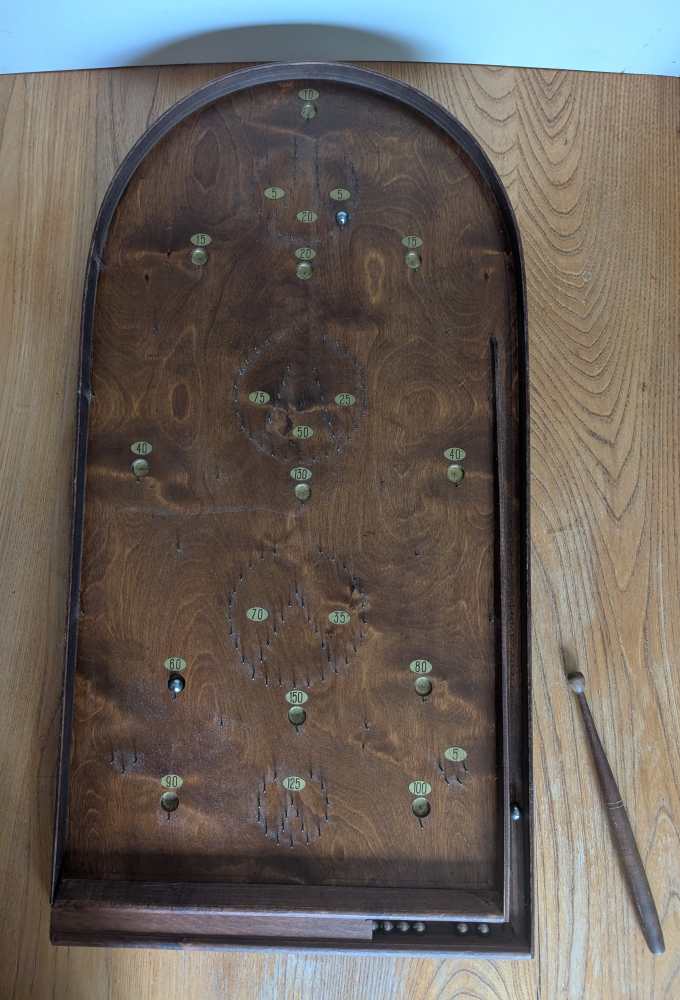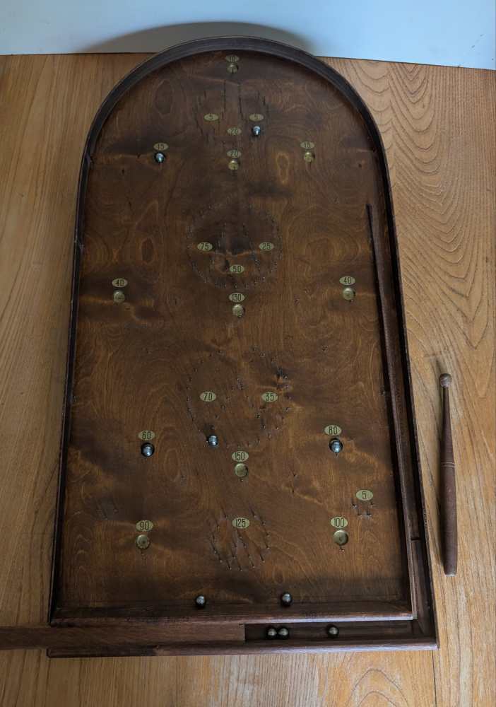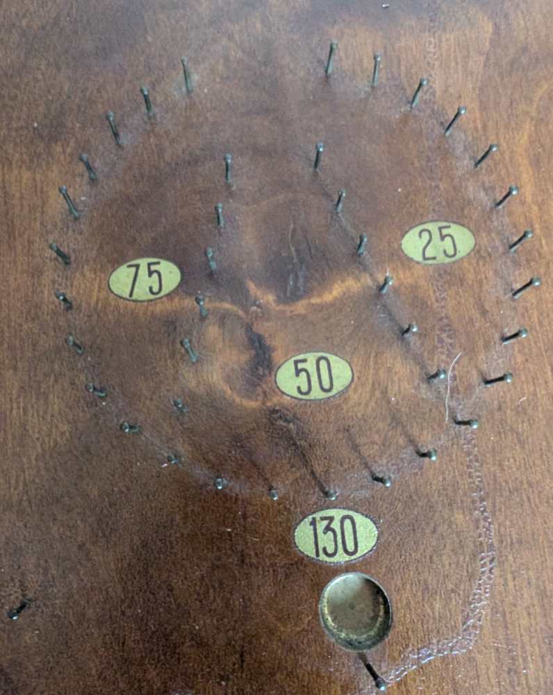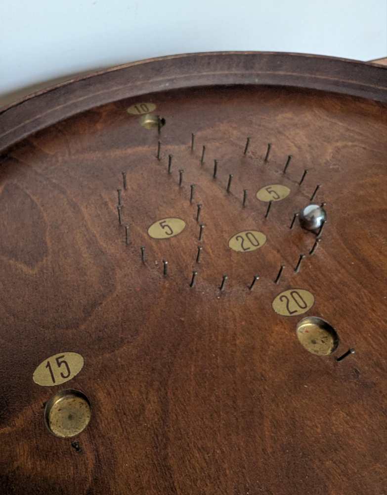 A forerunner of pinball, you can see where that arcade game got its name, with simply produced cups and bumpers for the ball to land in or be redirected by, made from an array of pins or nails.