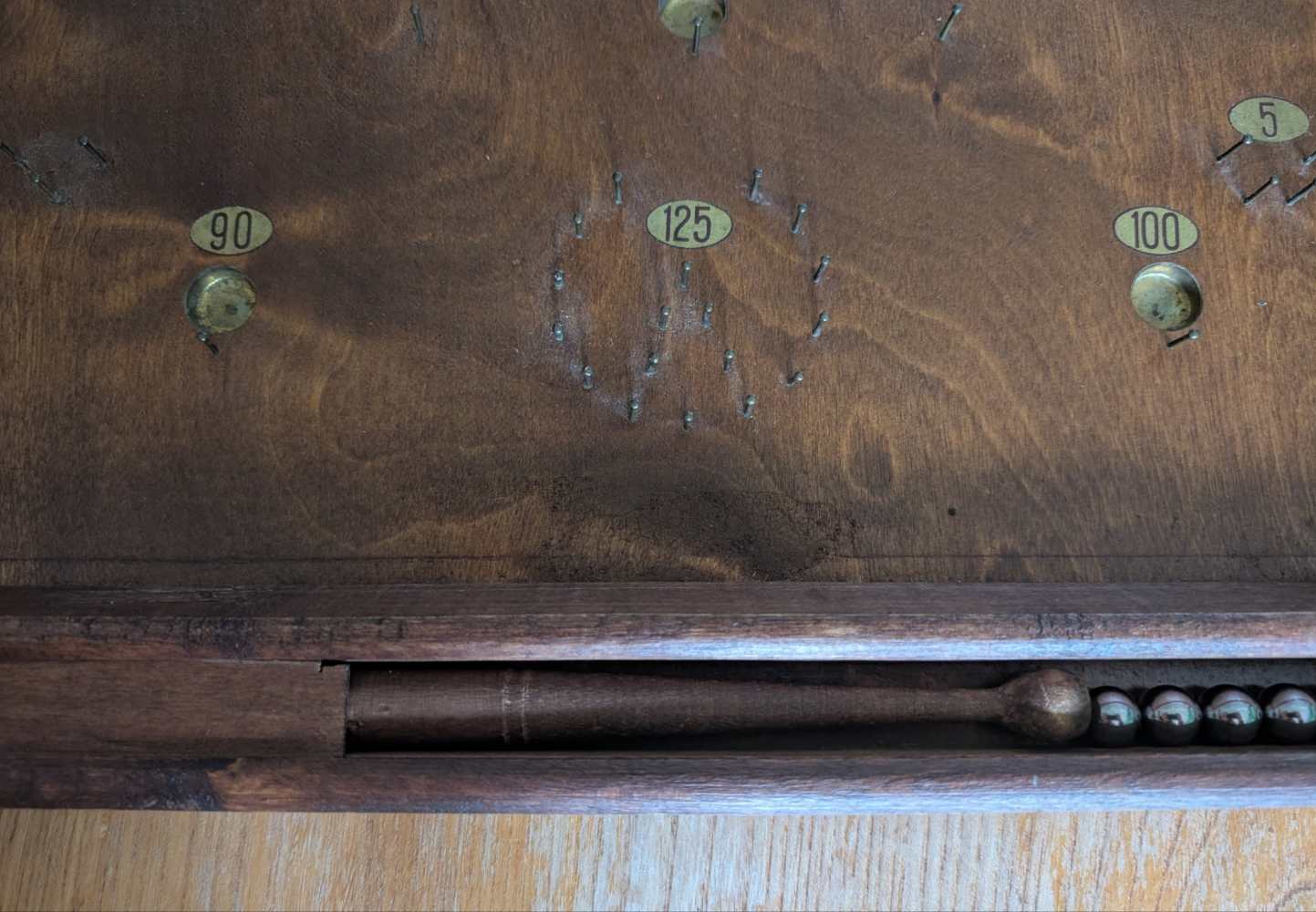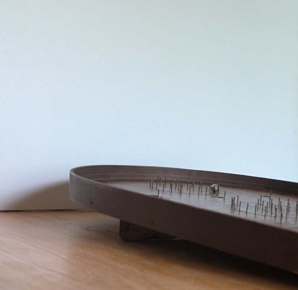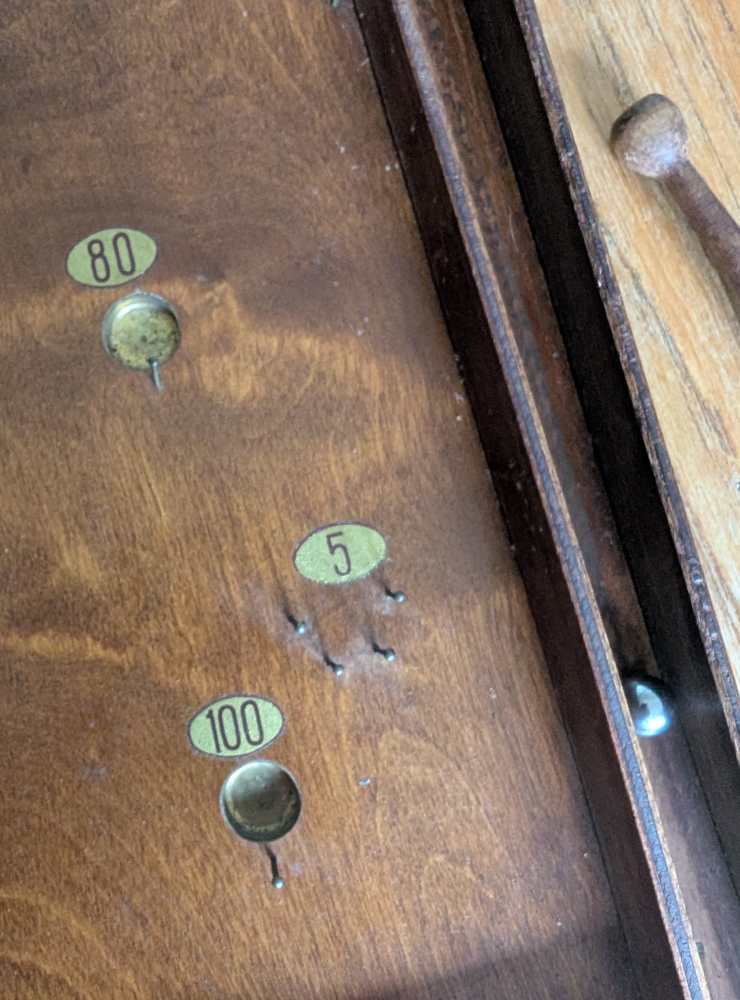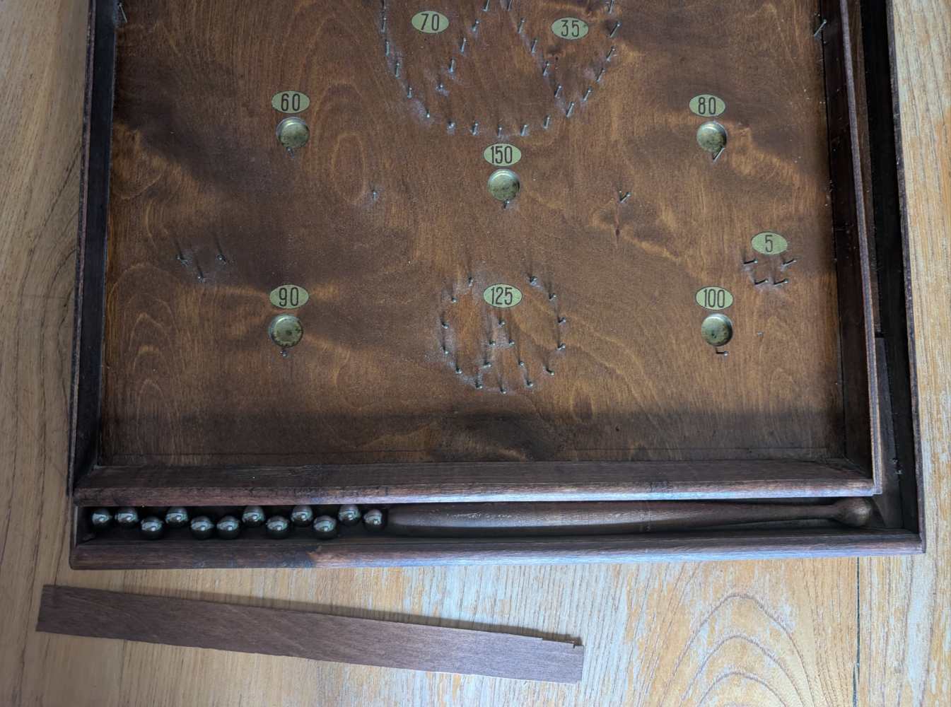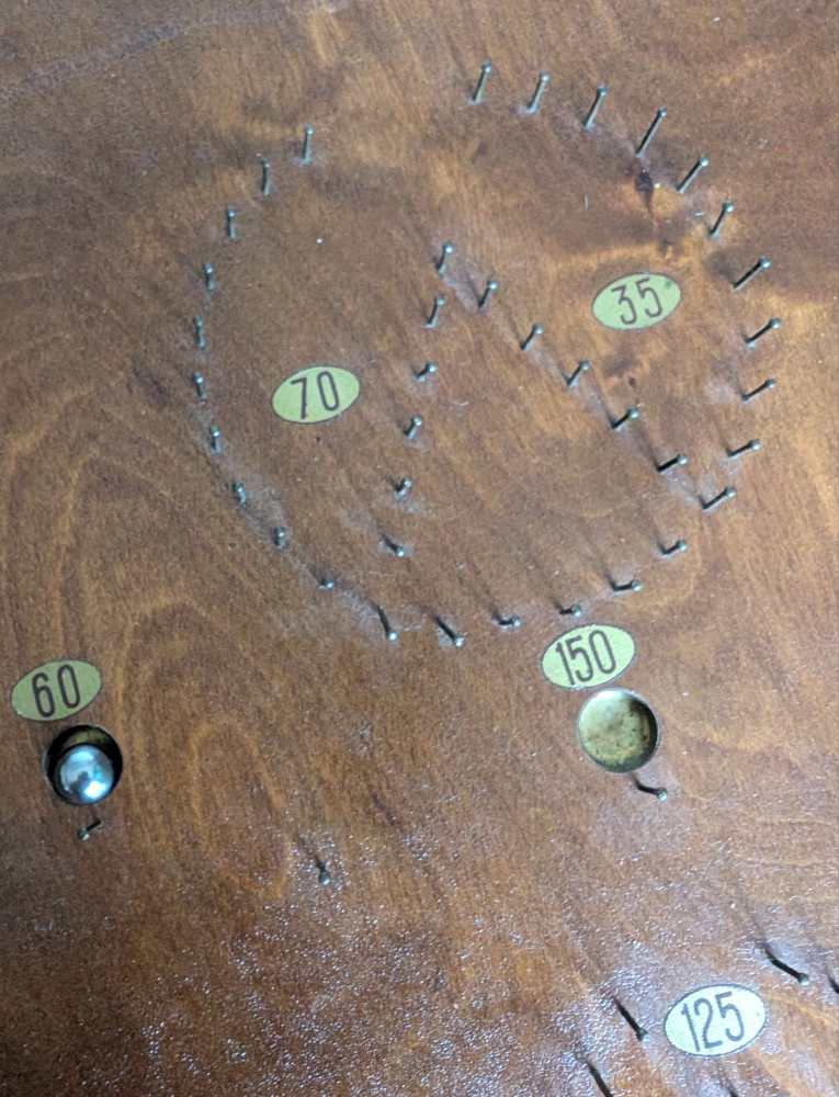 A forerunner of pinball, you can see where that arcade game got its name, with simply produced cups and bumpers for the ball to land in or be redirected by, made from an array of pins or nails.