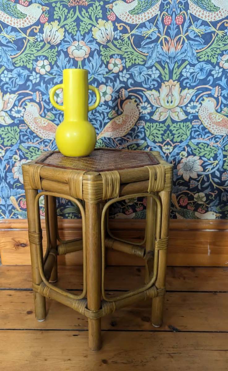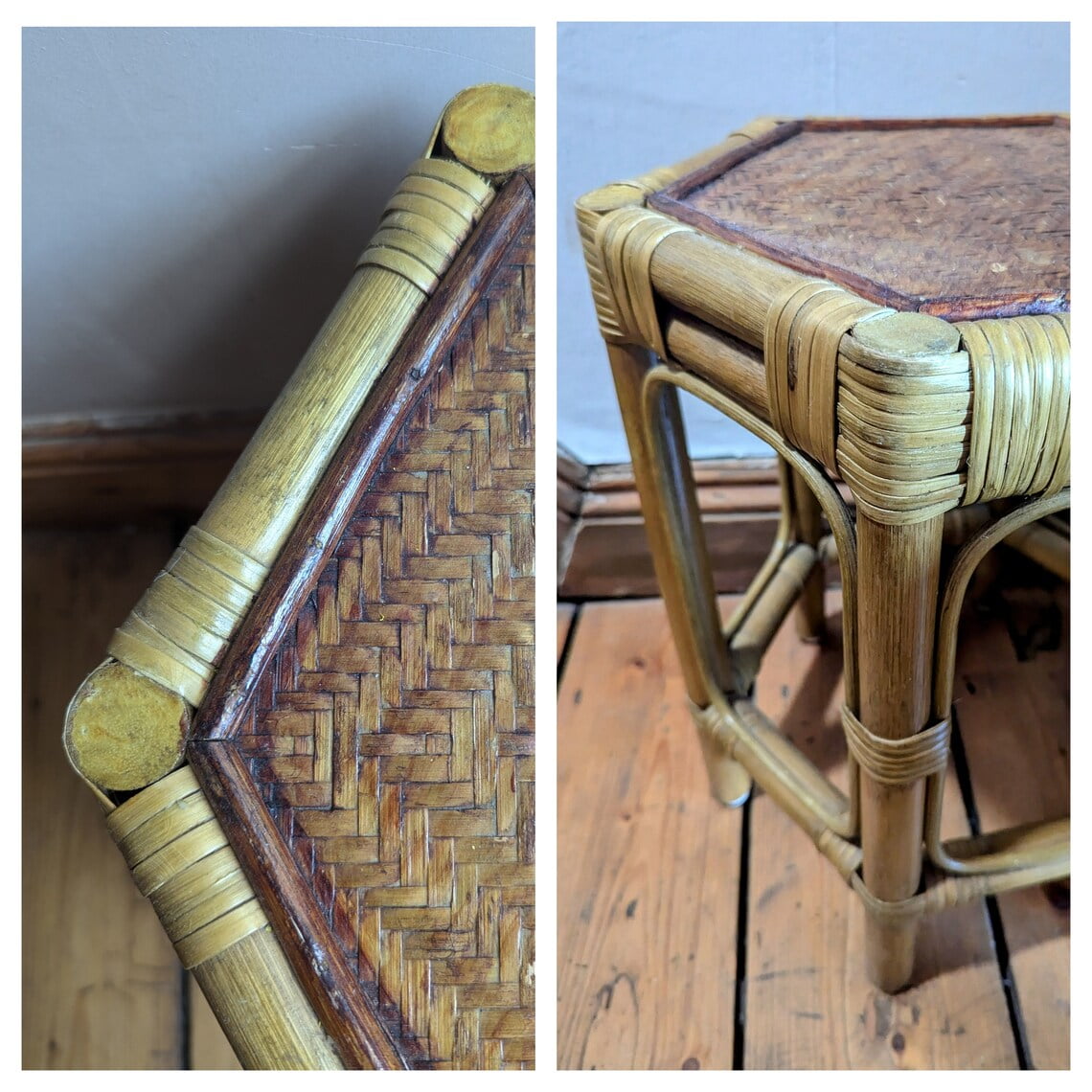 A lovely little midcentury hexagonal bamboo and wicker side / coffee table.