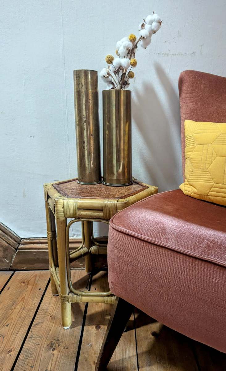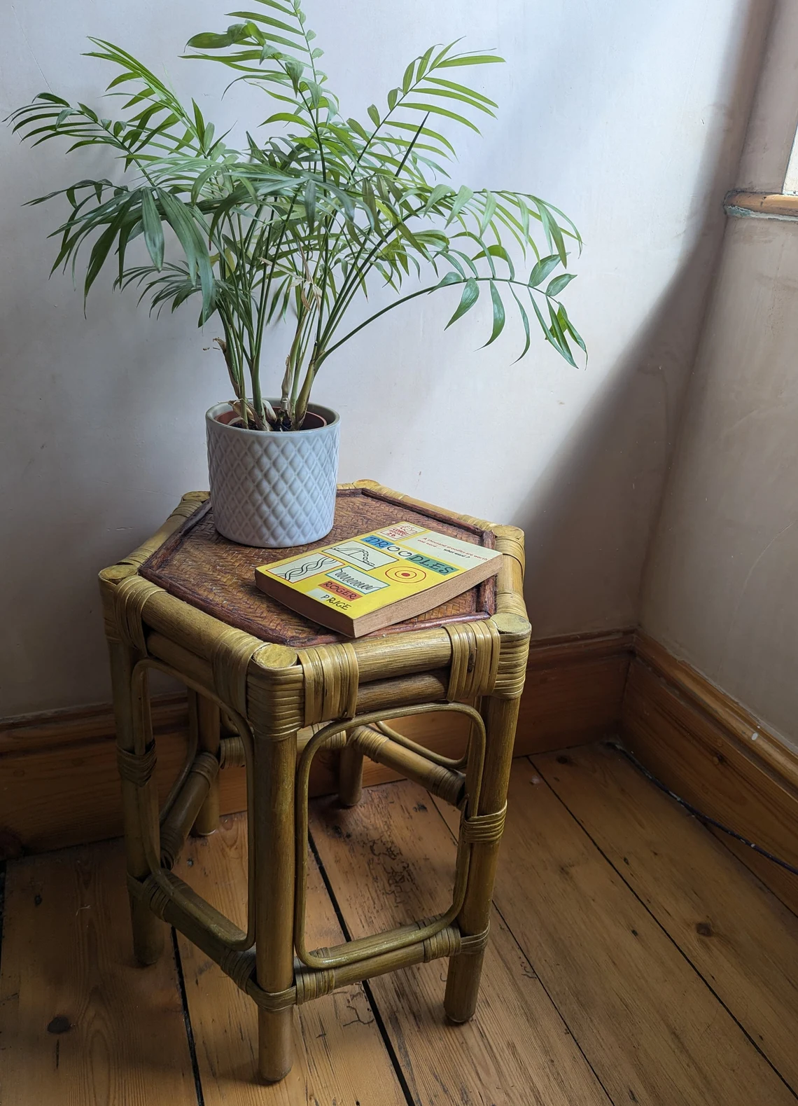 With its cross hatch bamboo top, and bamboo legs wound in wicker, with a stylish online hoop design to the outside of the leg frame, this piece has plenty of homely vintage charm.