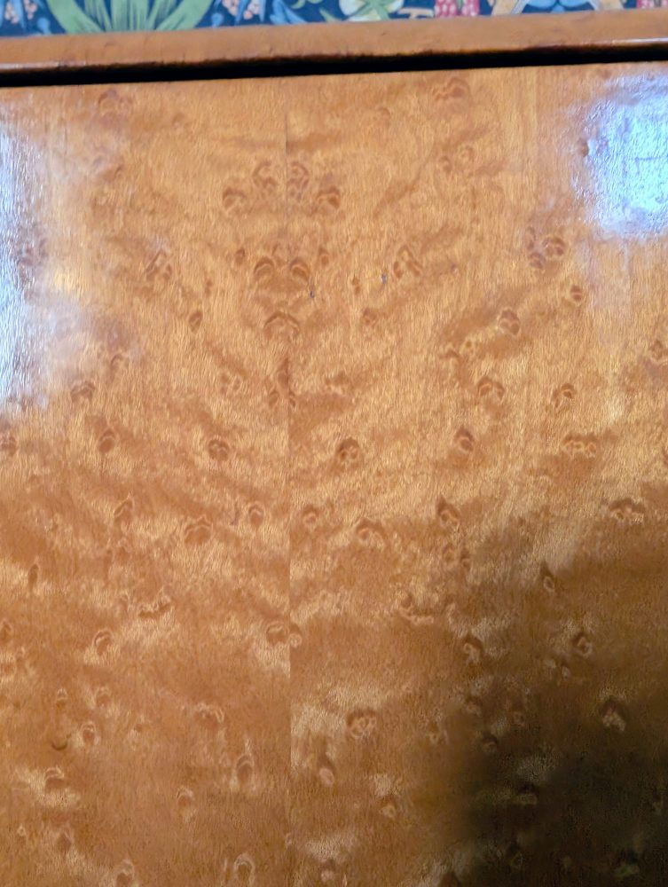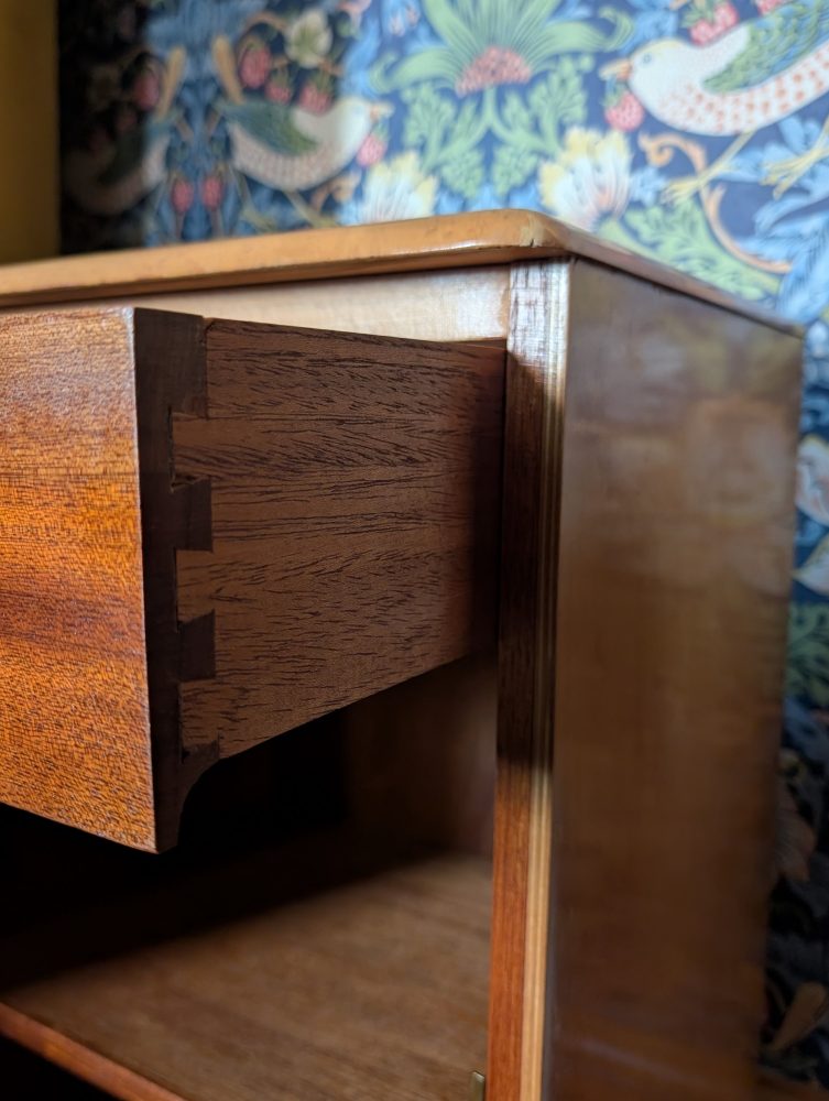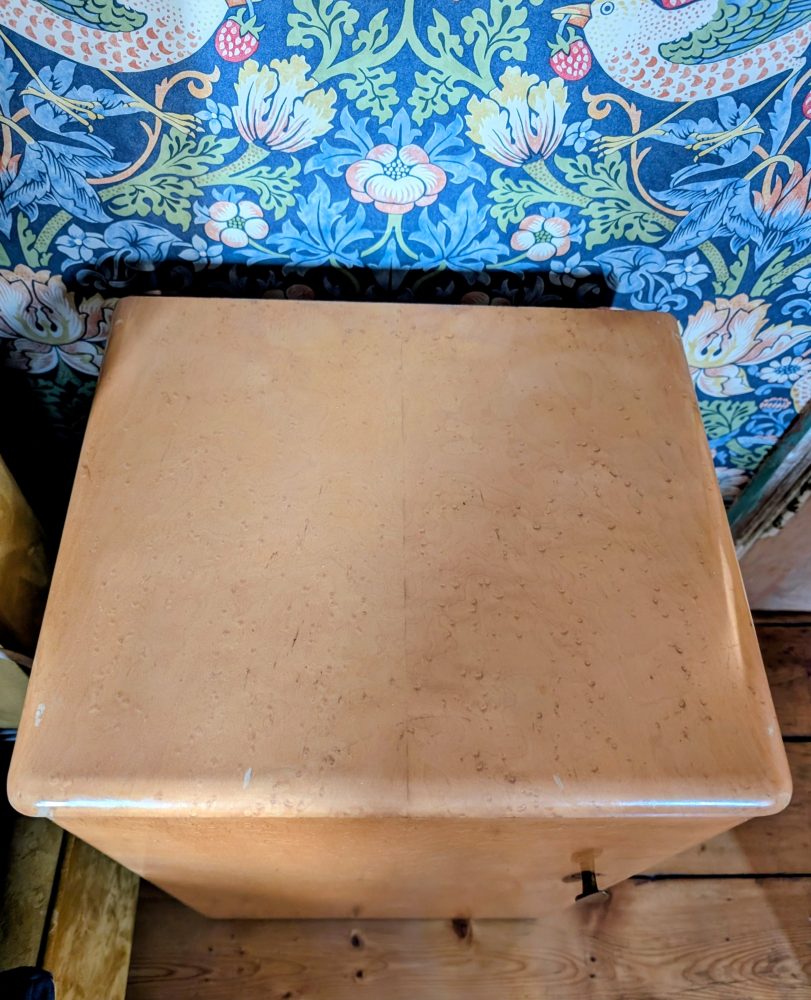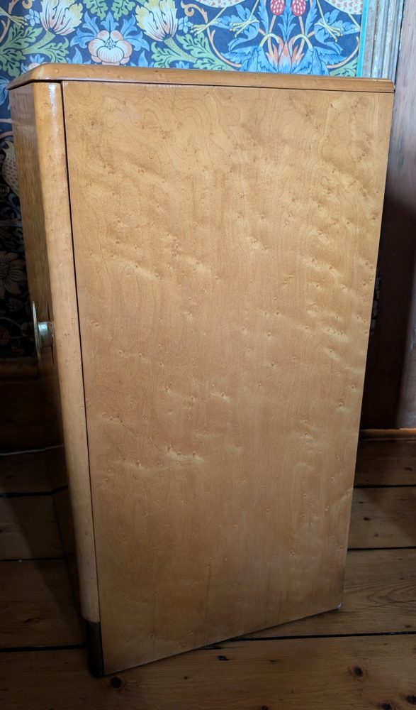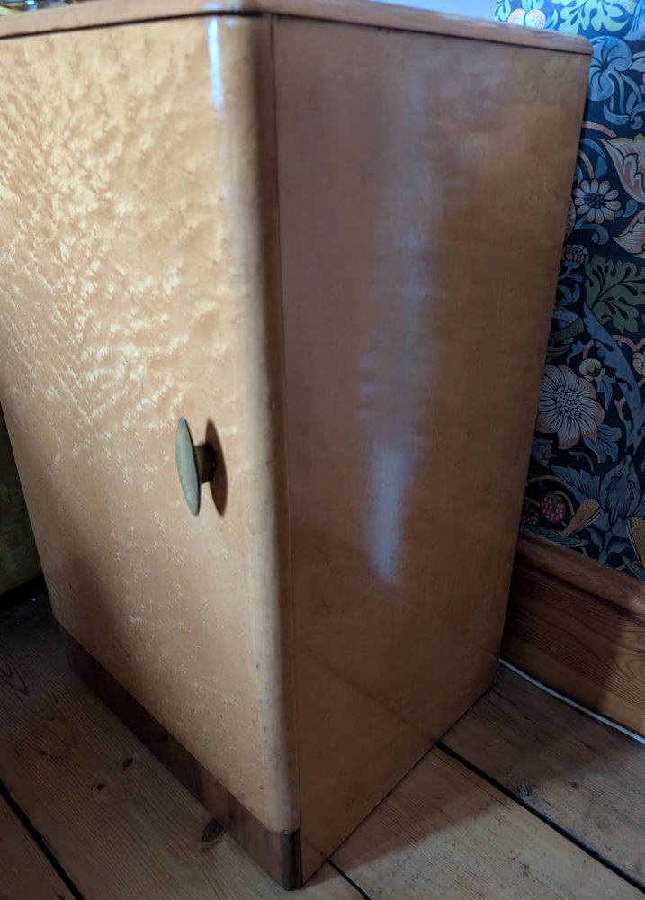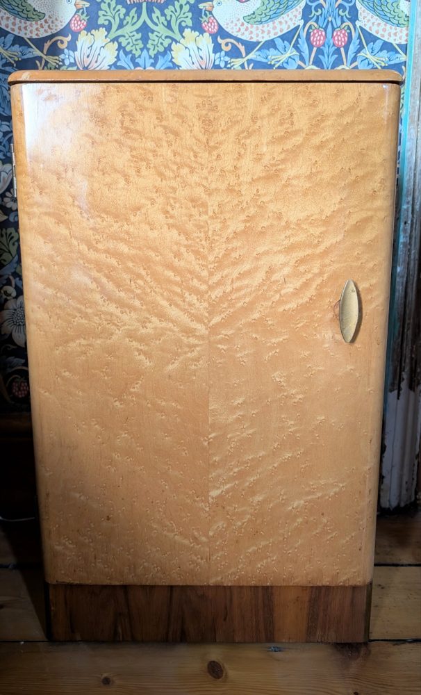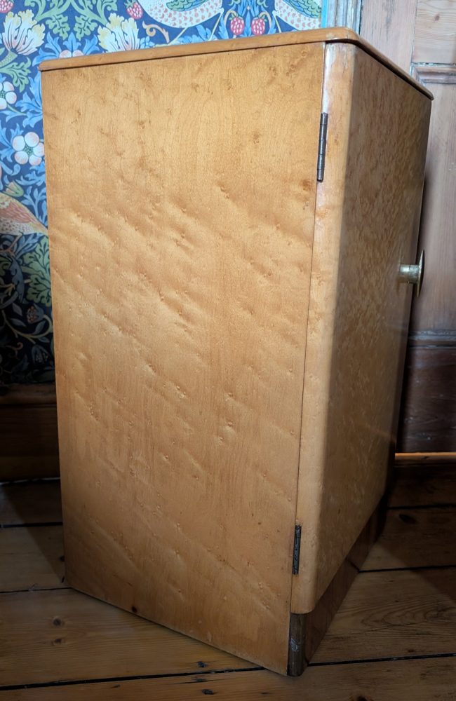 A stylish c.1950s bird’s eye maple veneered small cabinet with inner shelf and secret drawer.