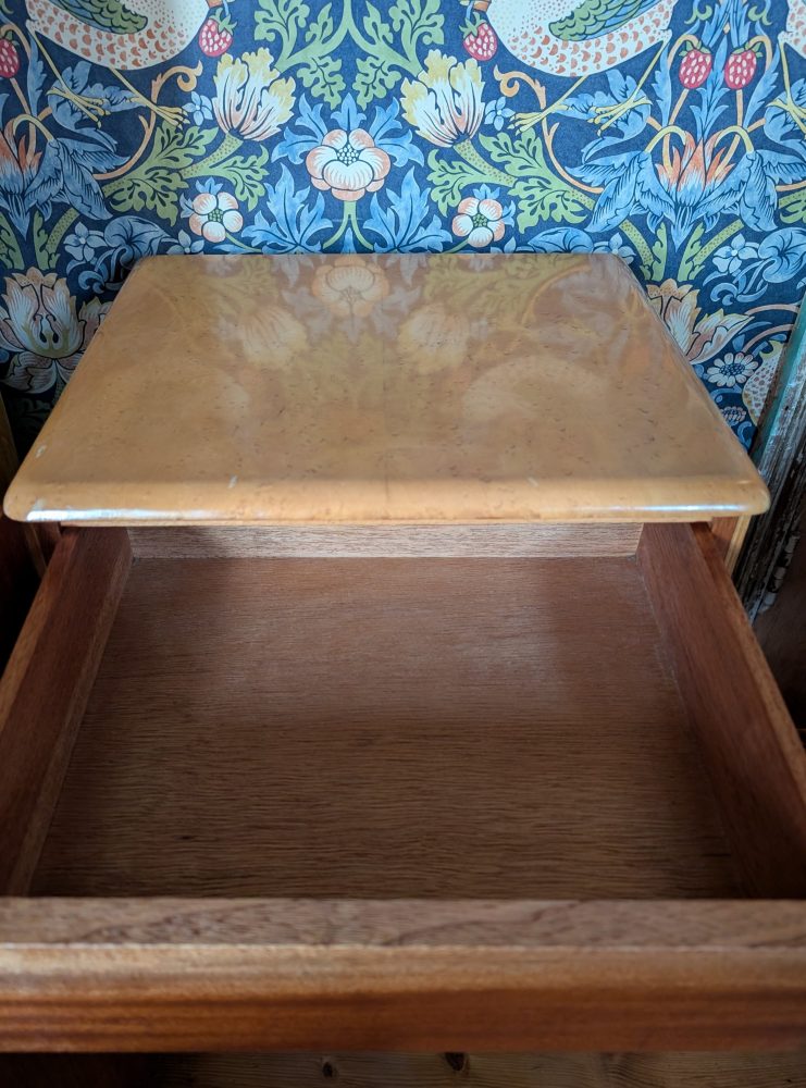 Teak inside, in great vintage condition with a secret drawer whose front resembles a plain piece of structural moulding but pulls out at the bottom.