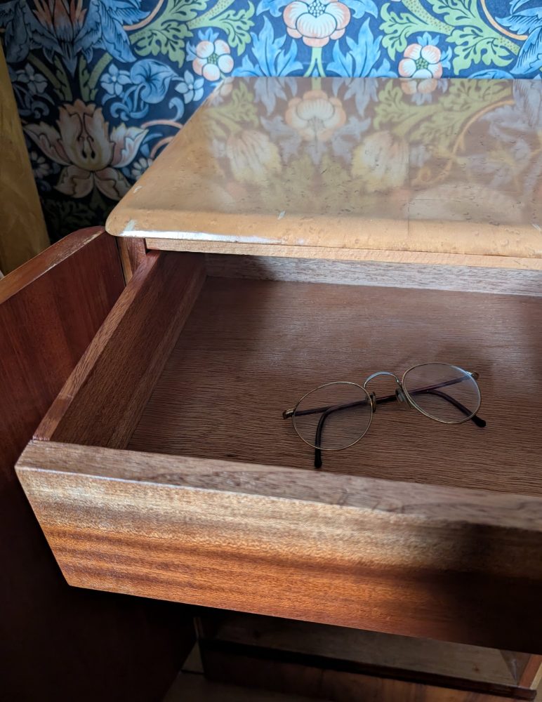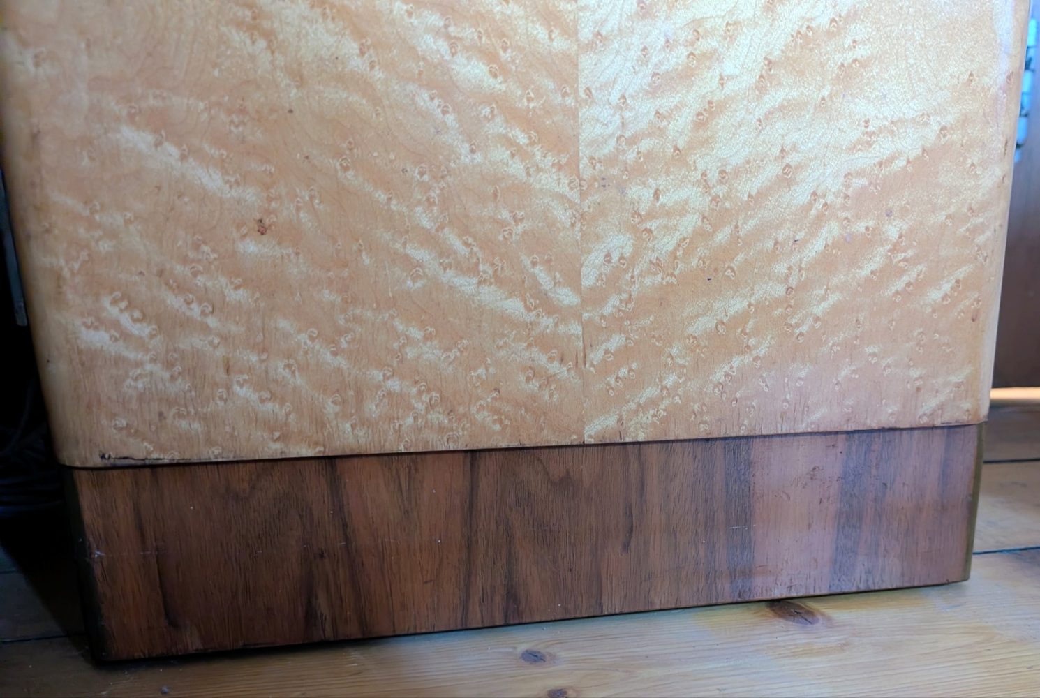 Midcentury bird’s eye maple and teak bedside cupboard or side table