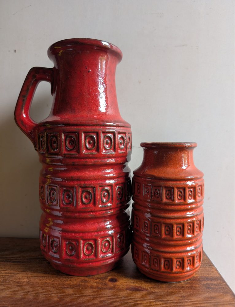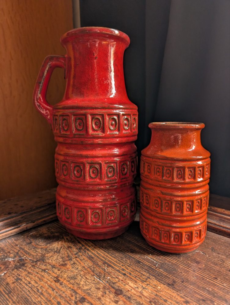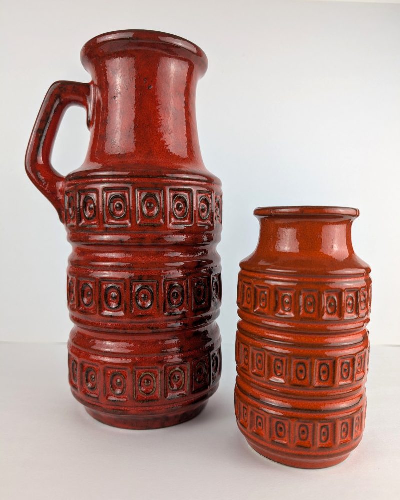 A fantastic pair of complimentary midcentury vases produced in West Germany in the 1960s. One with a longer neck and handle, the second a shorter version with the same narrower neck and dropping straight down, with the same pattern.