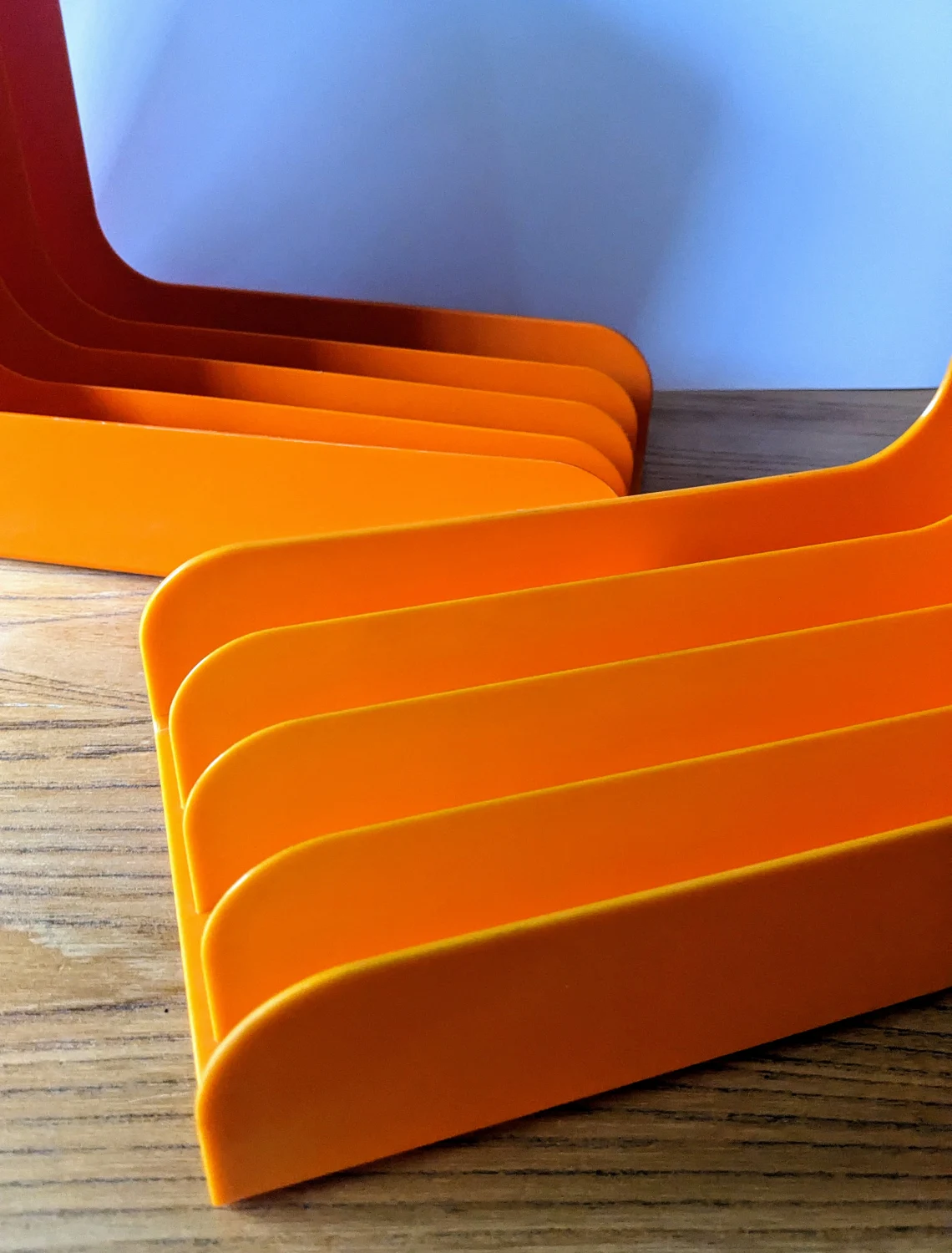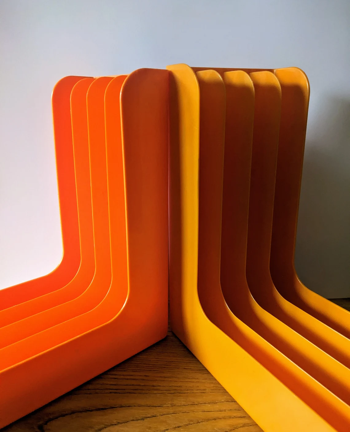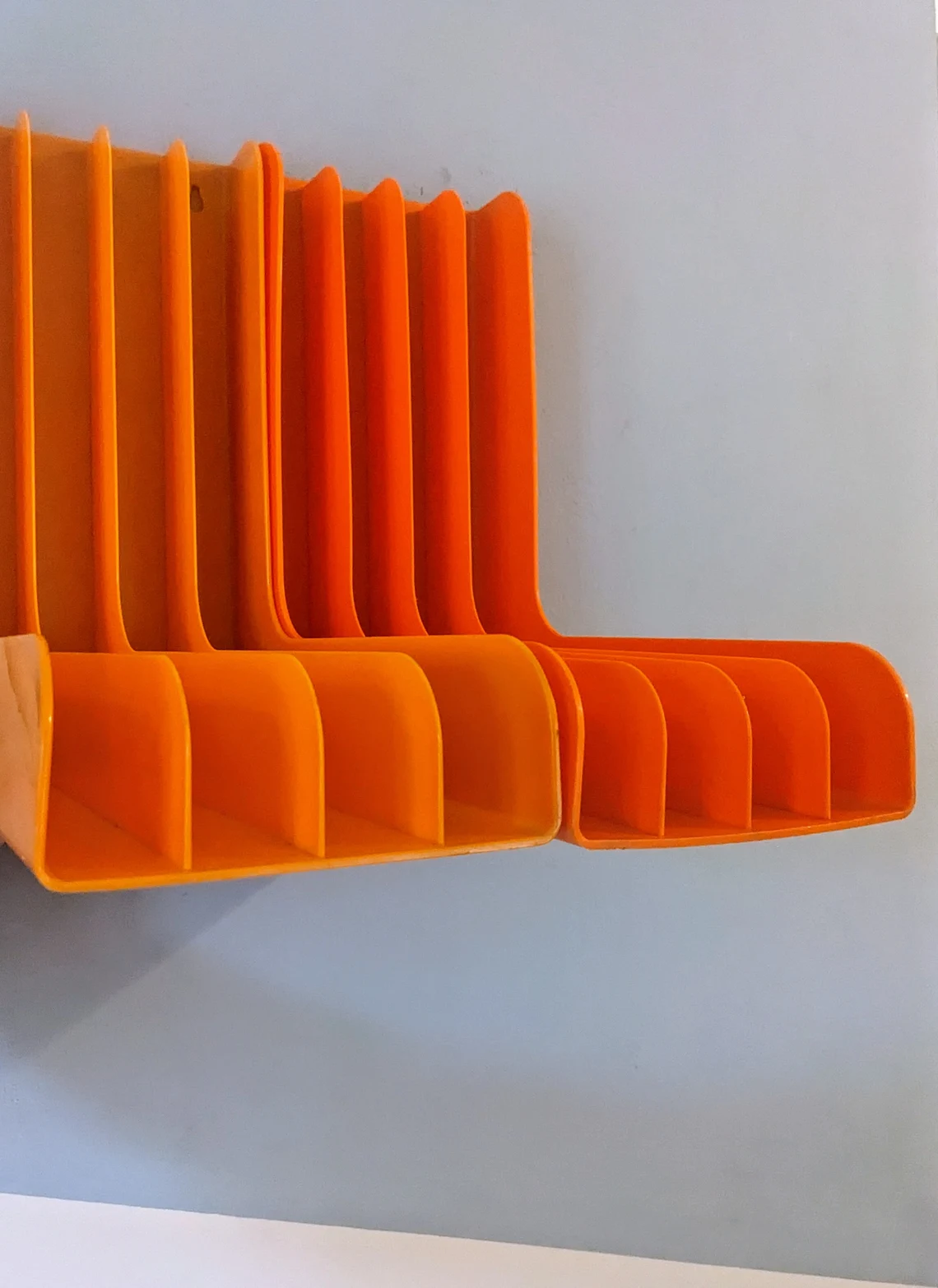Pair of 1970s orange plastic record racks, with storage for 12″ LPs