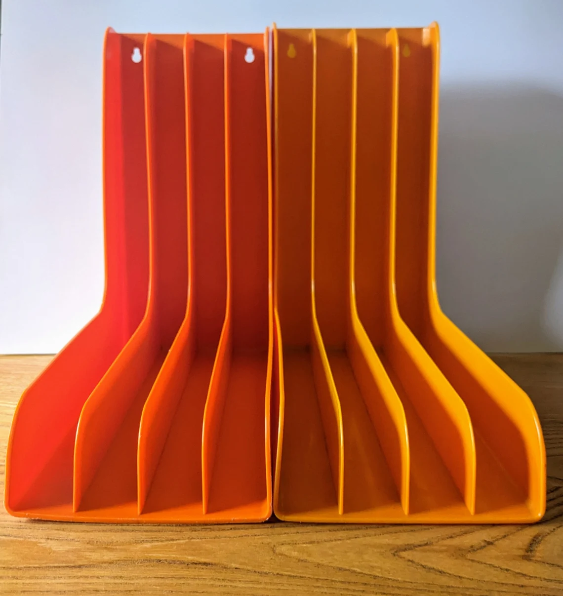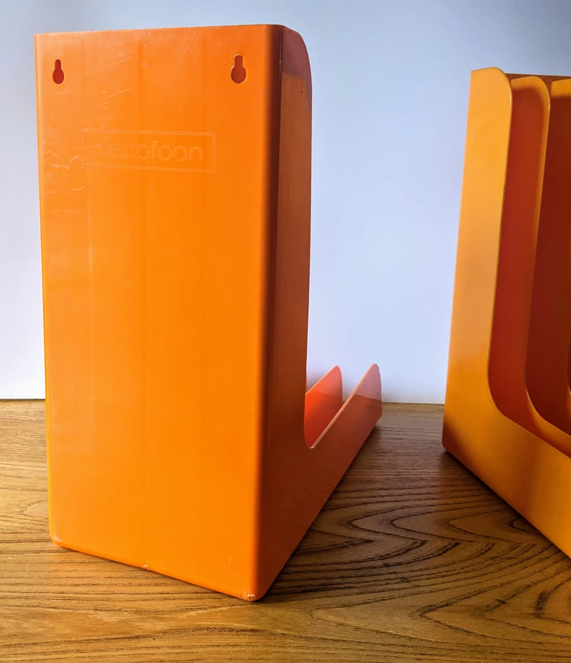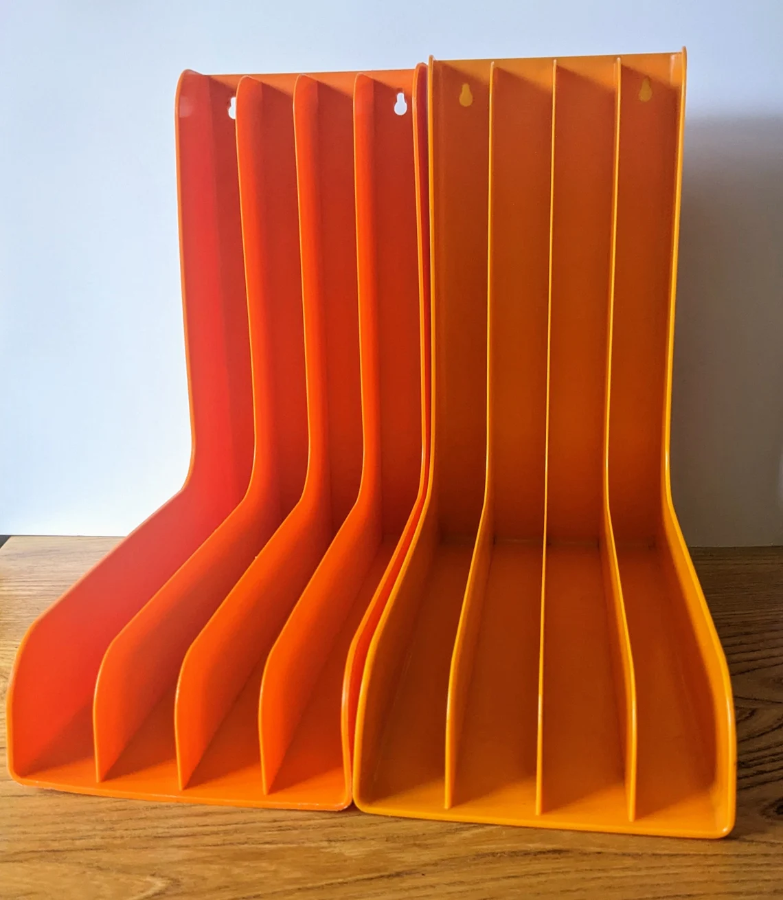 A fantastic pair of 12″ record racks in classic 1970s oranges, for wall mounting or resting on a sideboard.