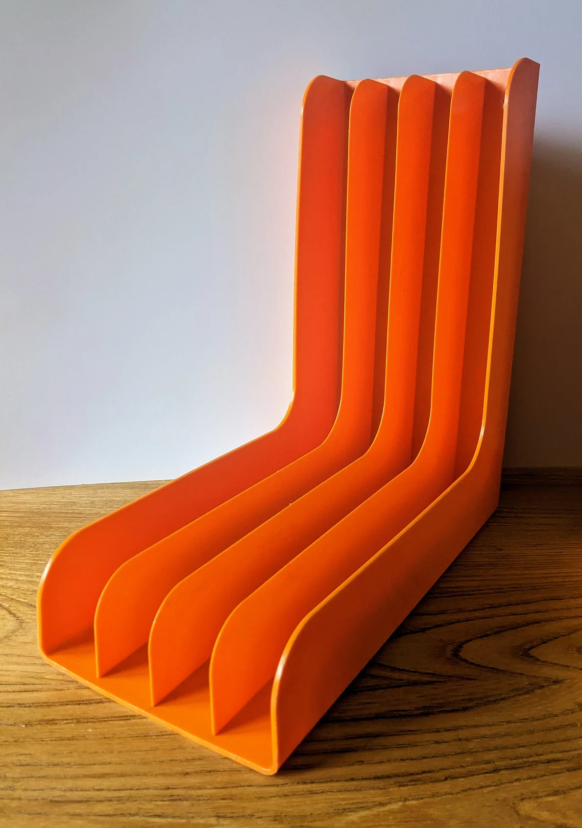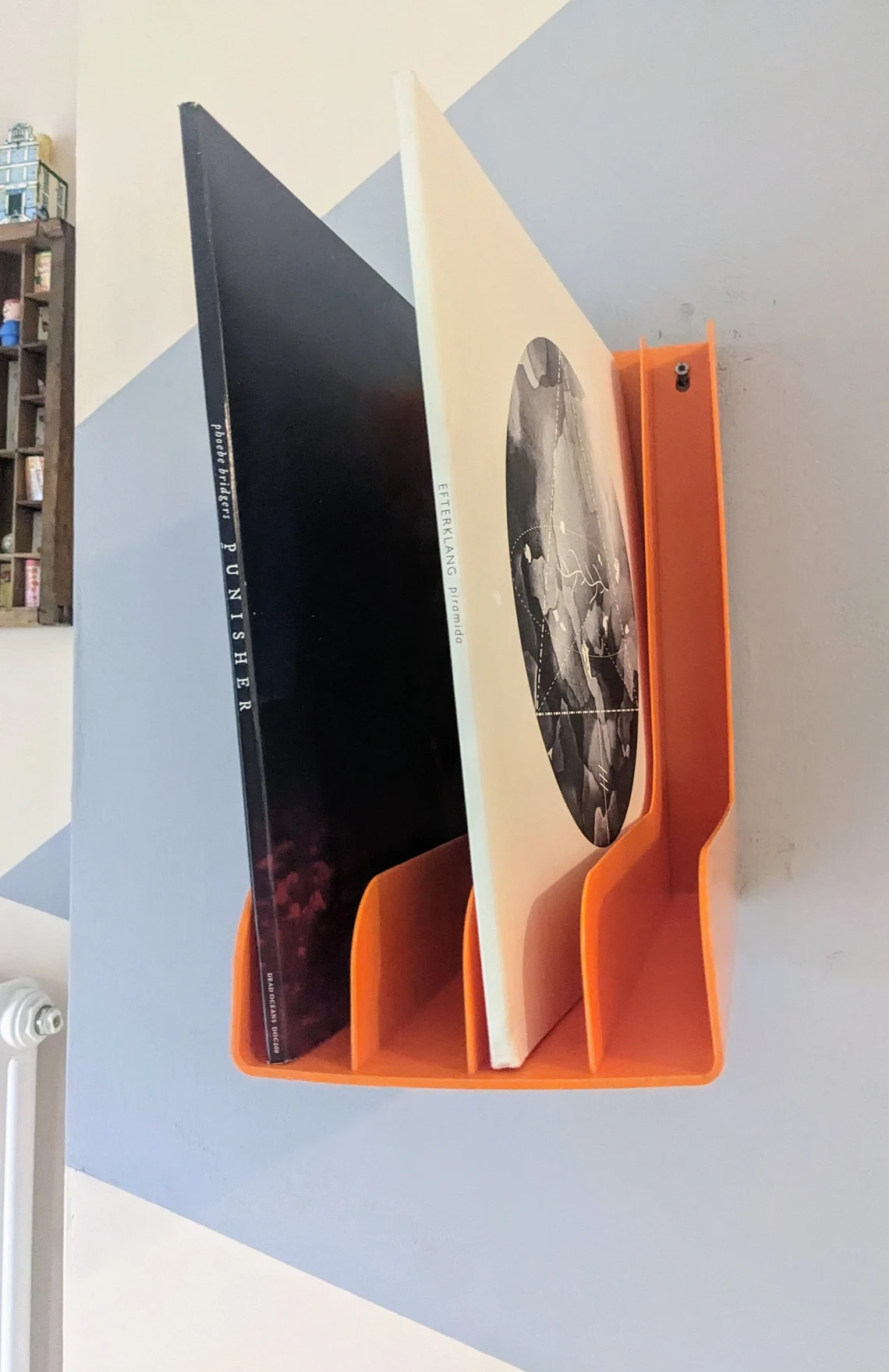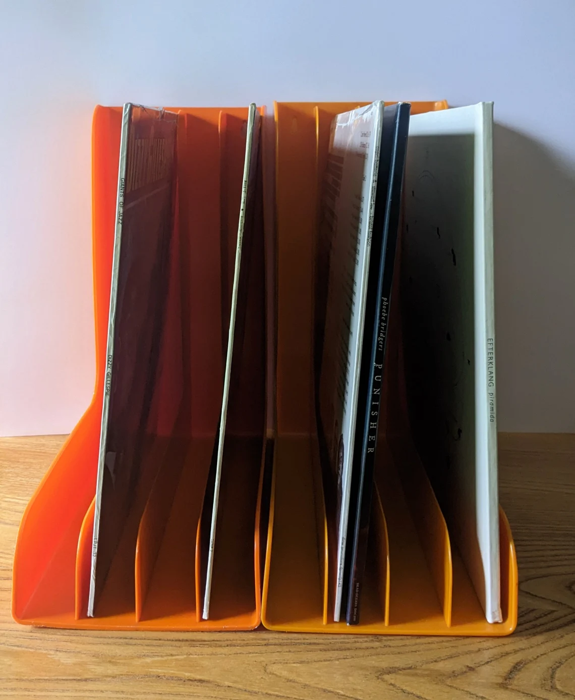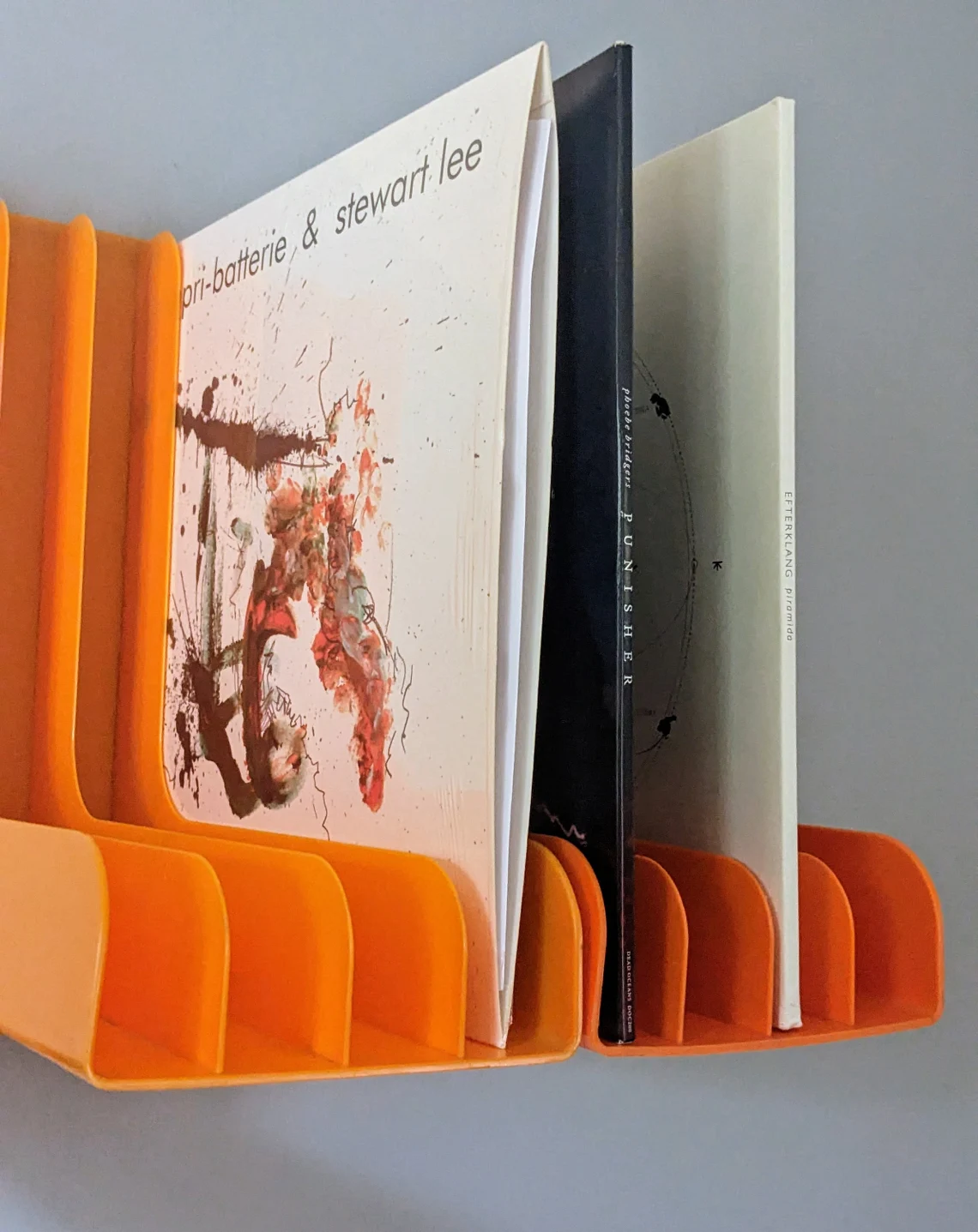 A fantastic pair of 12″ record racks in classic 1970s oranges, for wall mounting or resting on a sideboard.