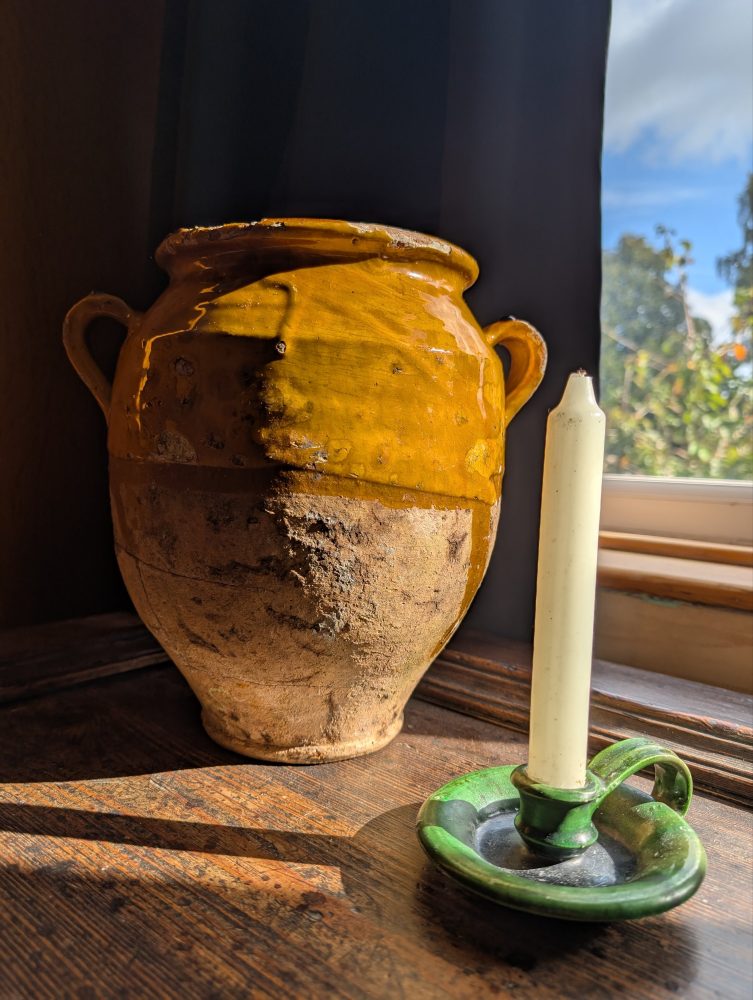 With layers of colours varying over the pot, with the typical yellow-ochre glaze to the top and plain earthenware below.
