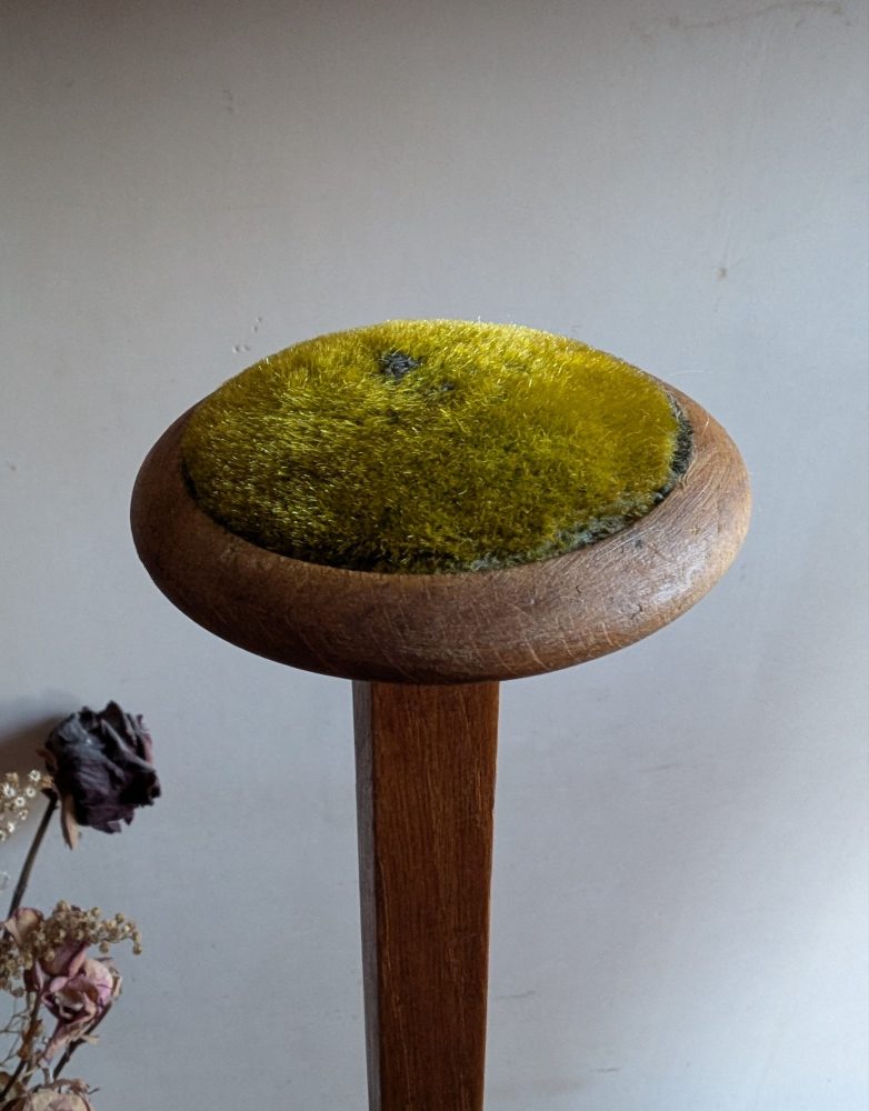With a gold colour velvet round pad for gripping gently the hat or wig.