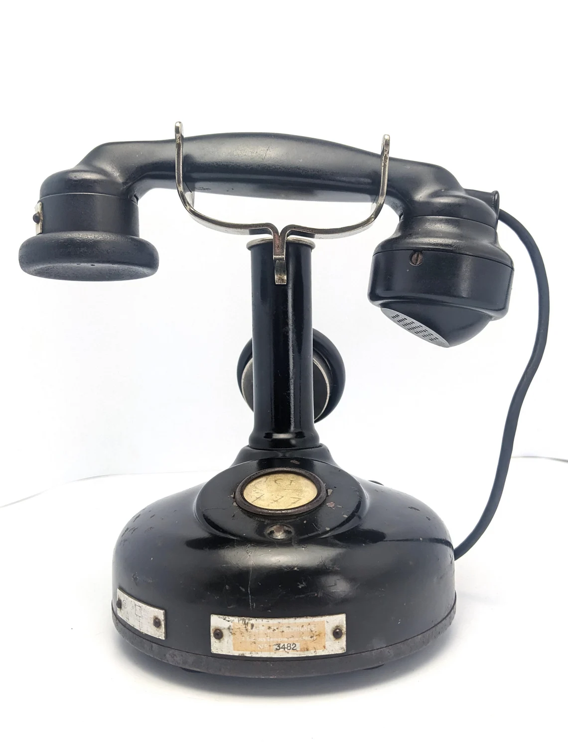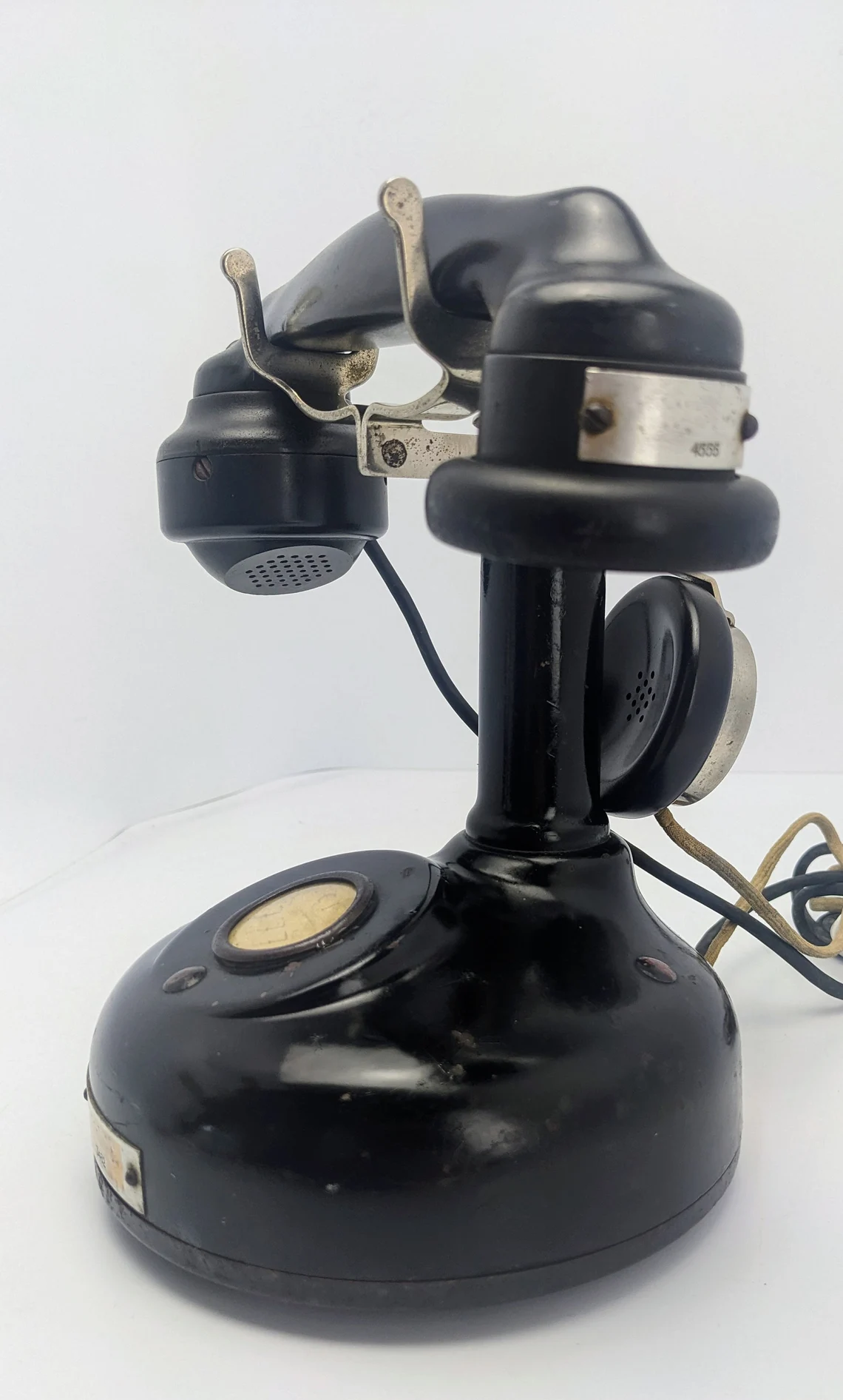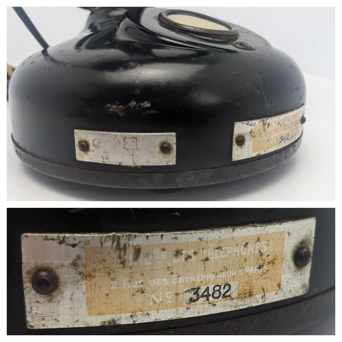 The metal plate to the base, along with the serial number shows feintly the original seller of three telephone with their Paris address: ‘Melle des Télephones’* 2, rue des Entrepreneurs, Paris’.