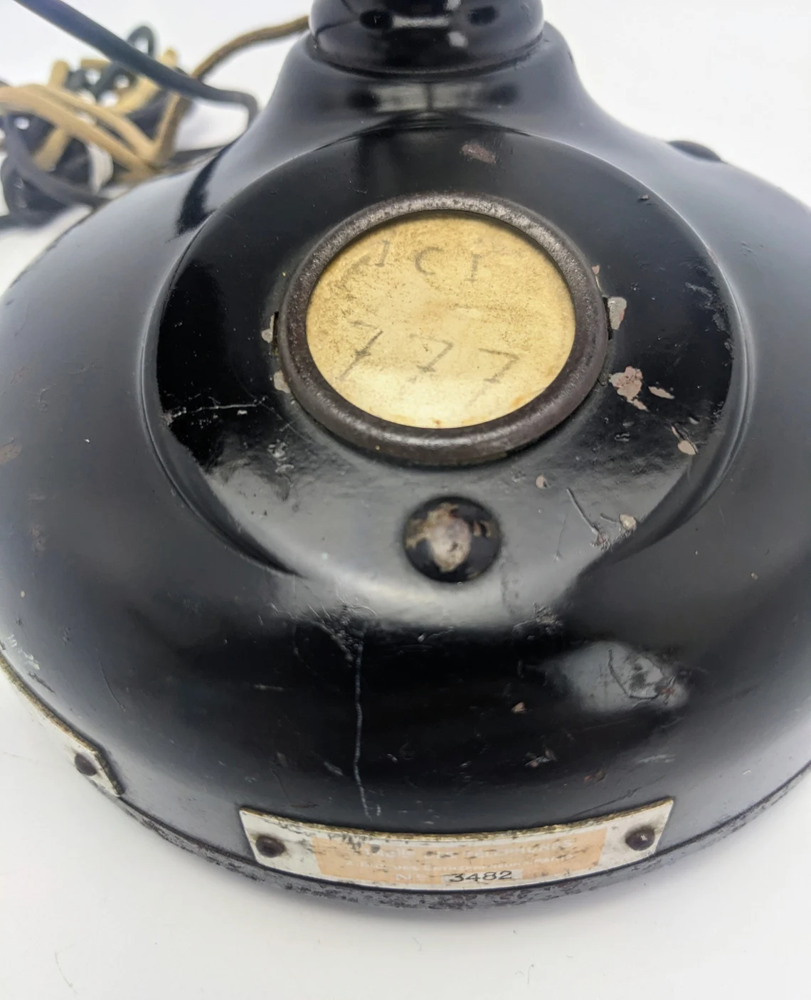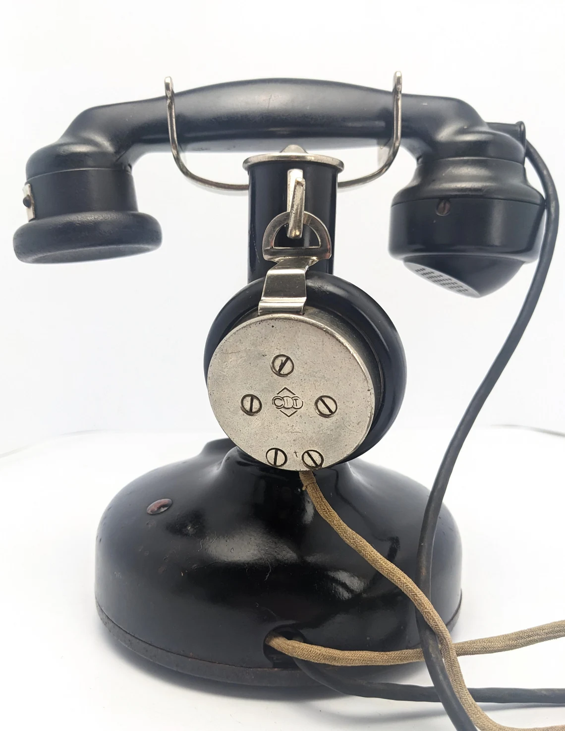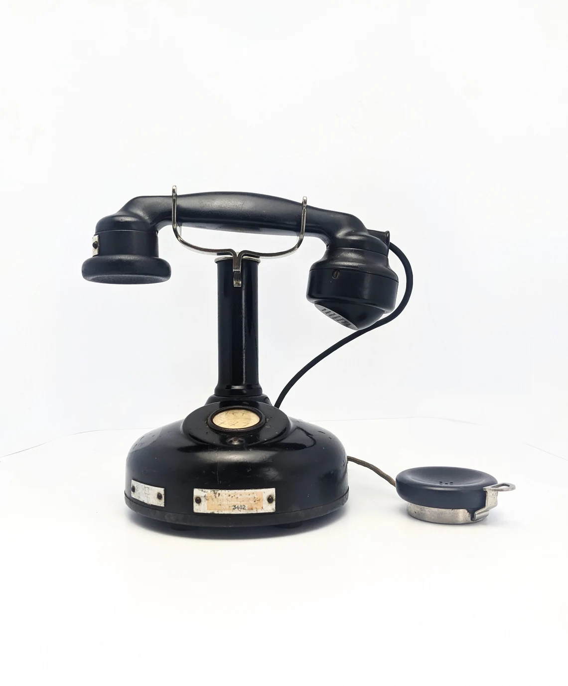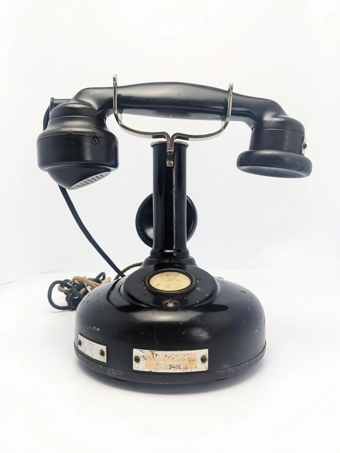 The metal plate to the base, along with the serial number shows feintly the original seller of three telephone with their Paris address: ‘Melle des Télephones’* 2, rue des Entrepreneurs, Paris’.