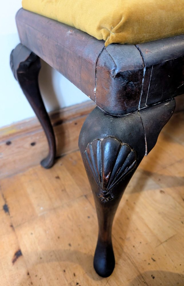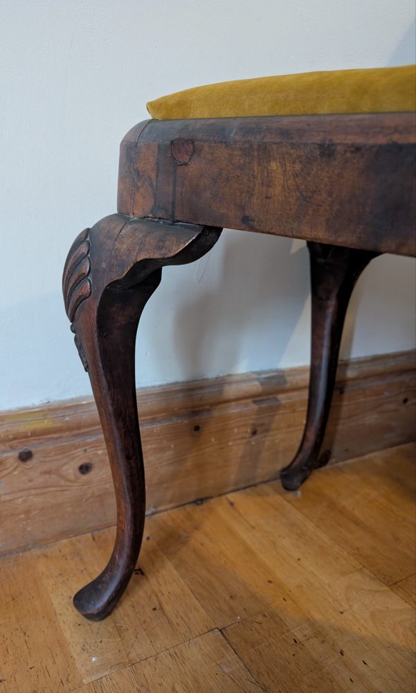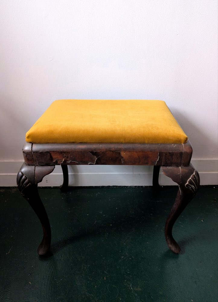 With elegant cabriole legs decorated with carved shell motifs, and a drop in seat newly reupholstered in mustard yellow velvet fabric.