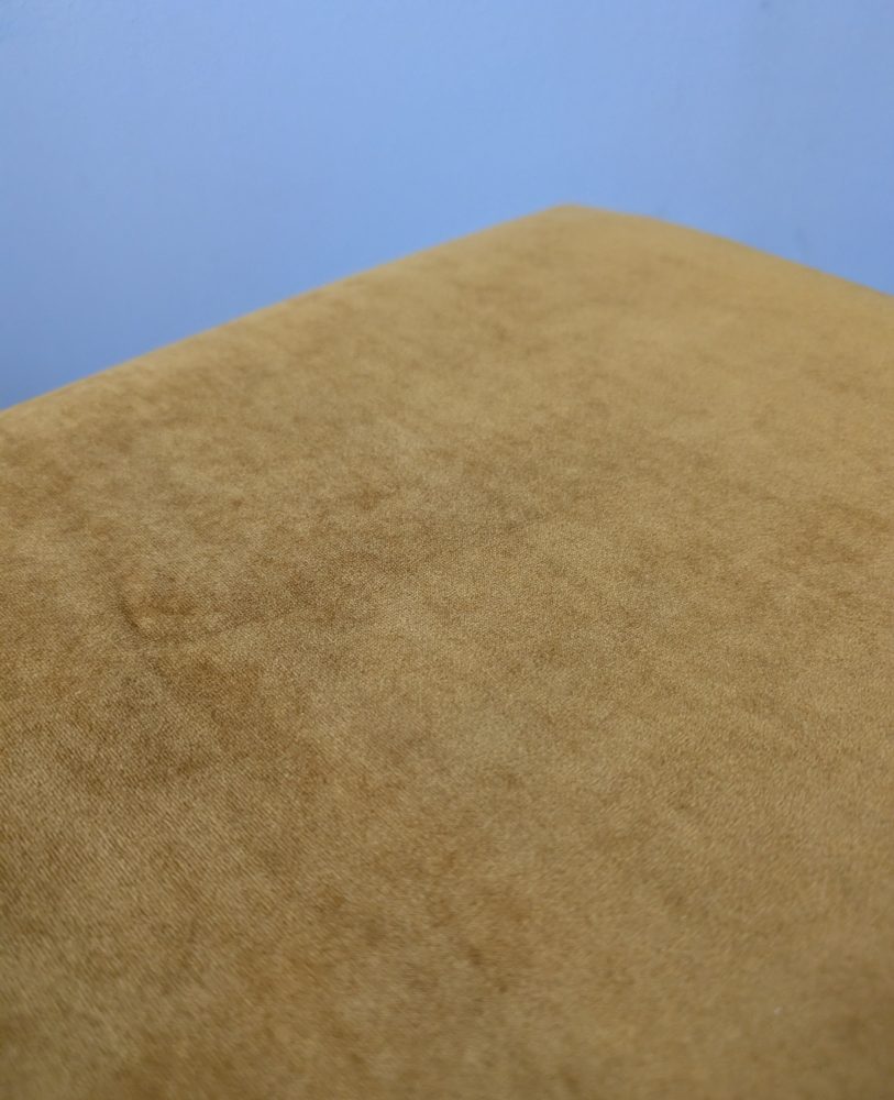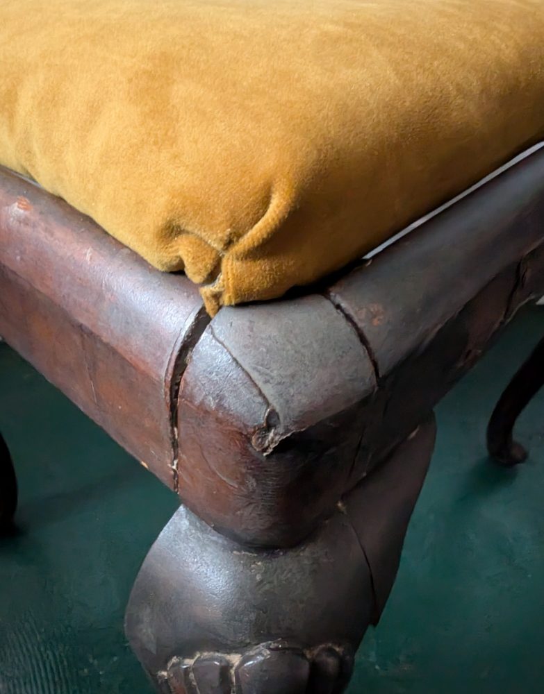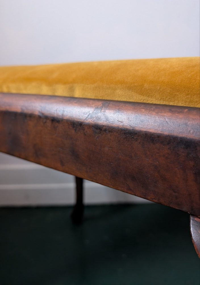The cushioning is tired and not full beneath the new velvet however, and the veneer has broken away along many parts of the sides. A corner piece joining leg to end is missing. The joints have been mended and are not all tight, though they are now all fixed firmly and are stable.