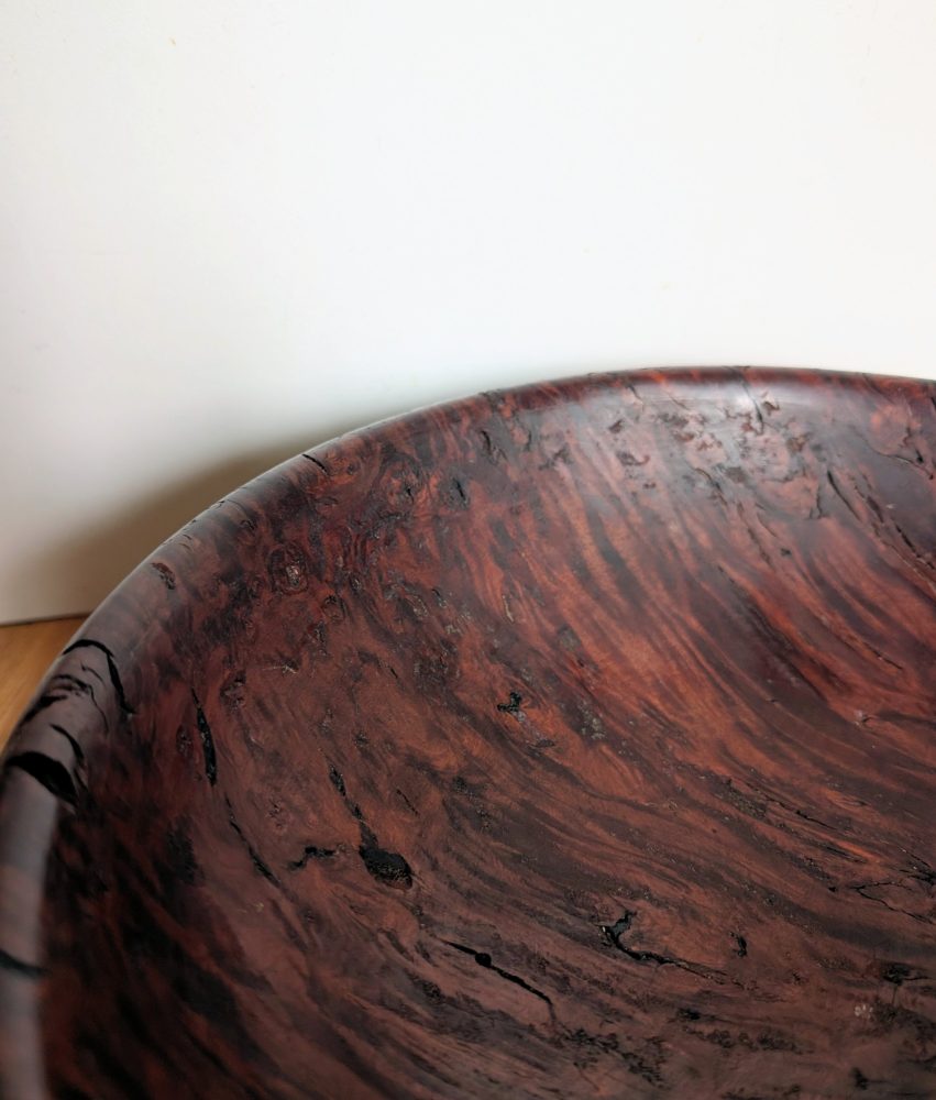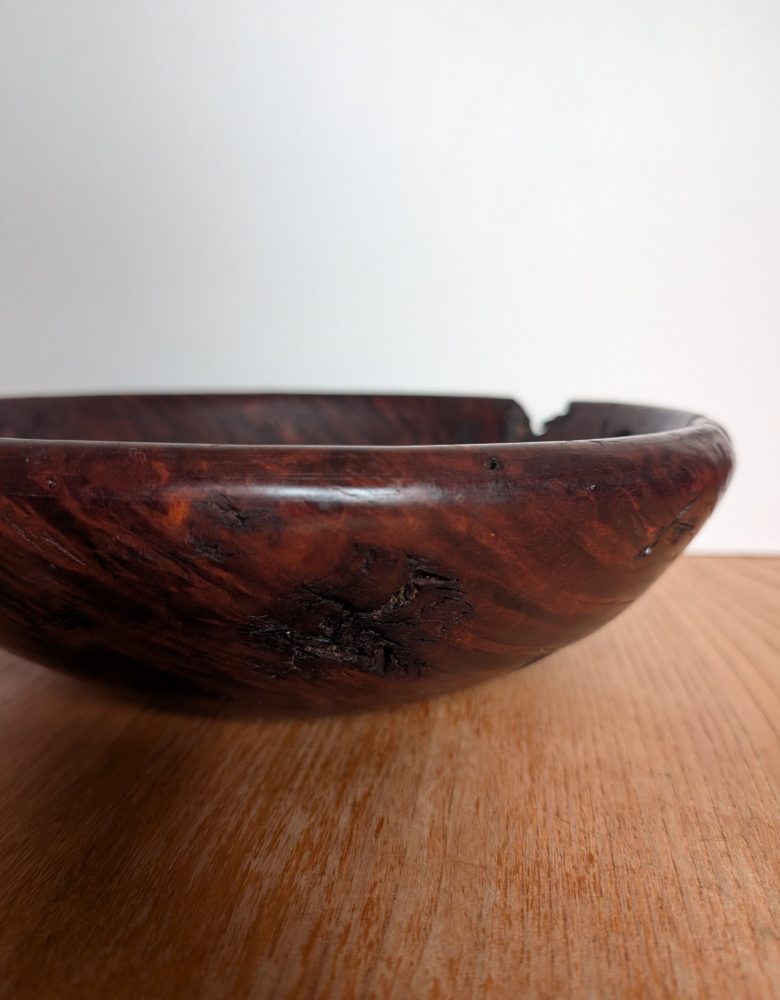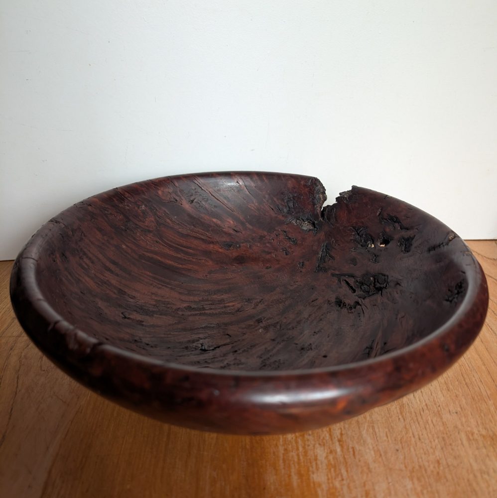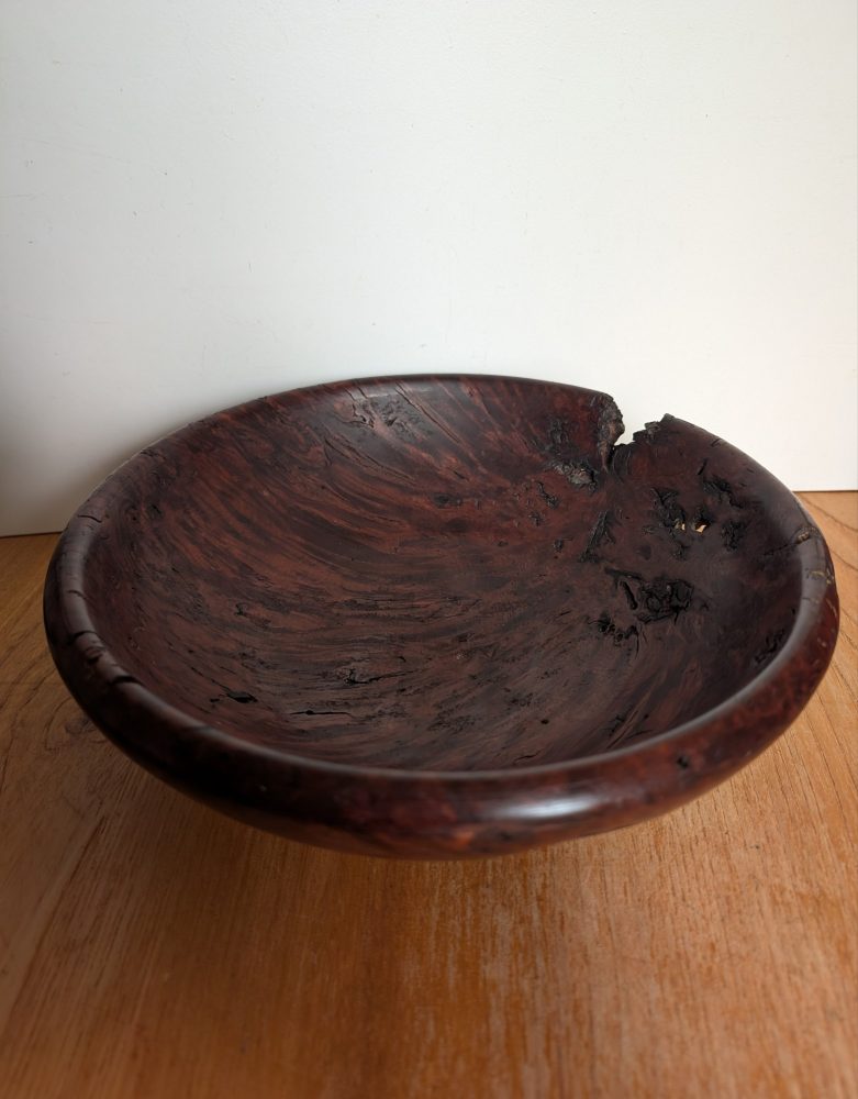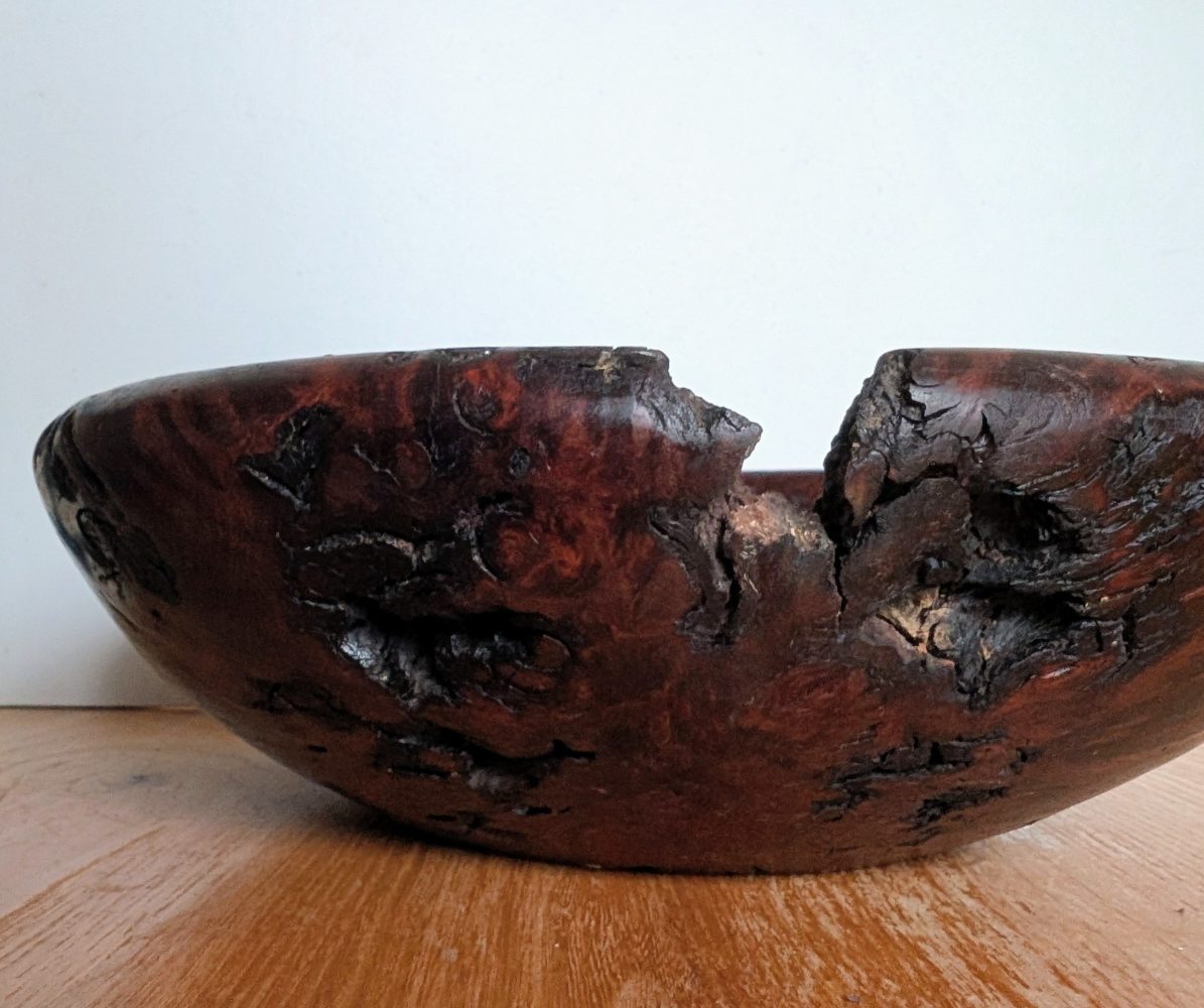 A very attractive handmade wooden bowl made from the root of a tree.
