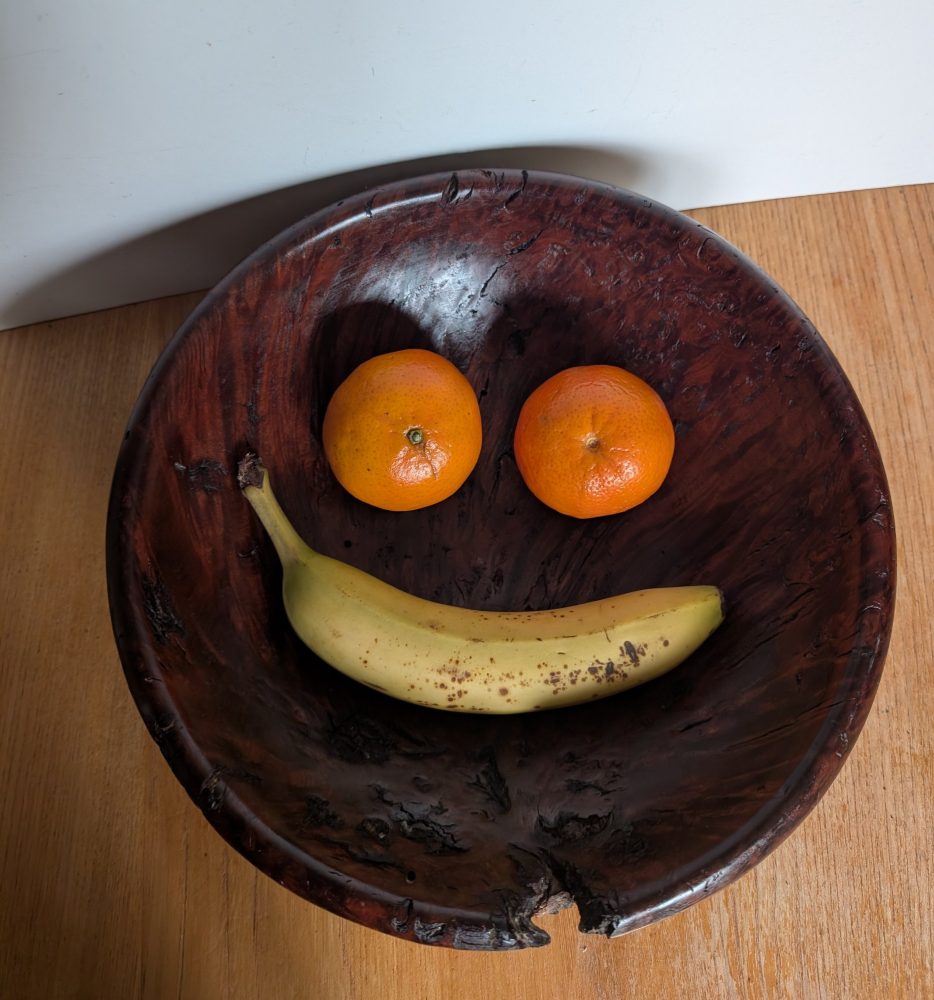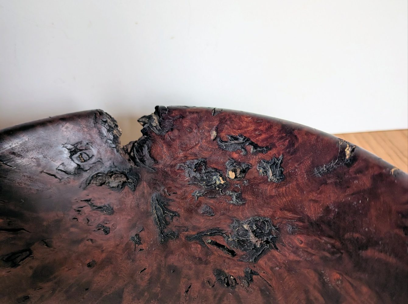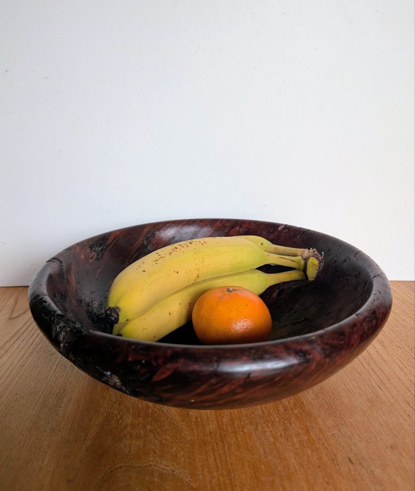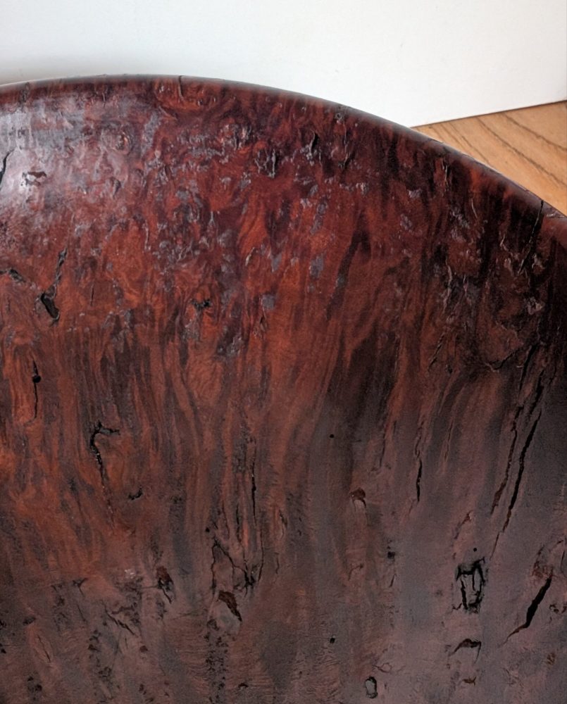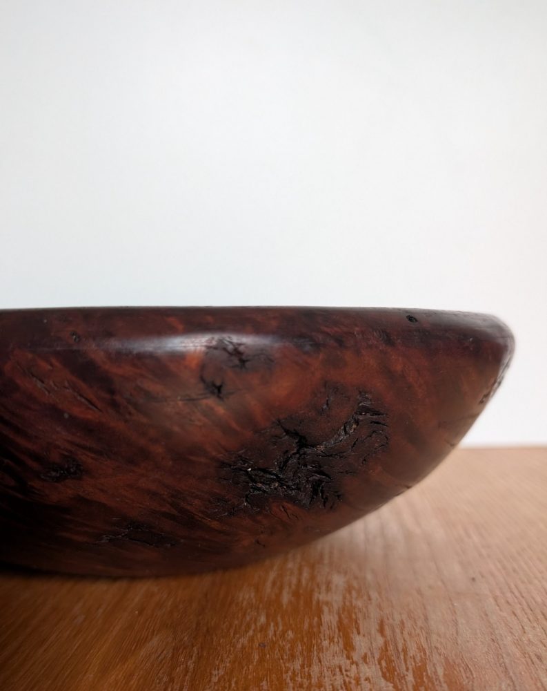 A very attractive handmade wooden bowl made from the root of a tree.