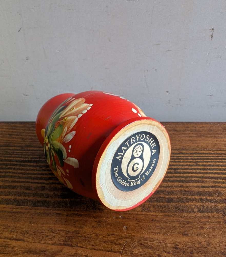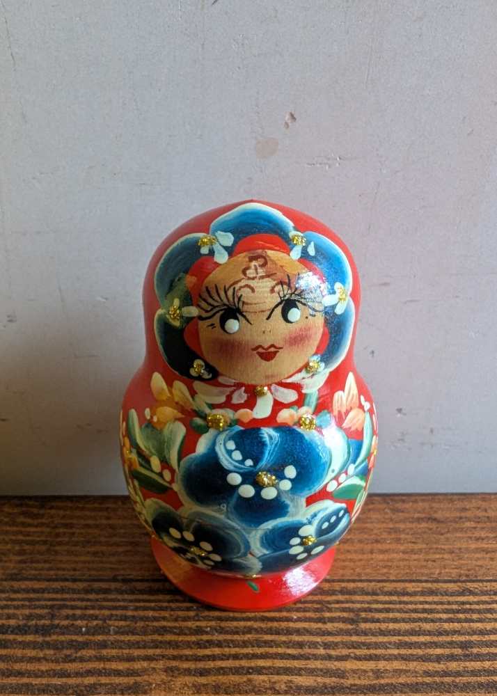 A lovely, ornate set of little hand-painted Russian dolls in excellent condition, with gold and blues on a red ground.