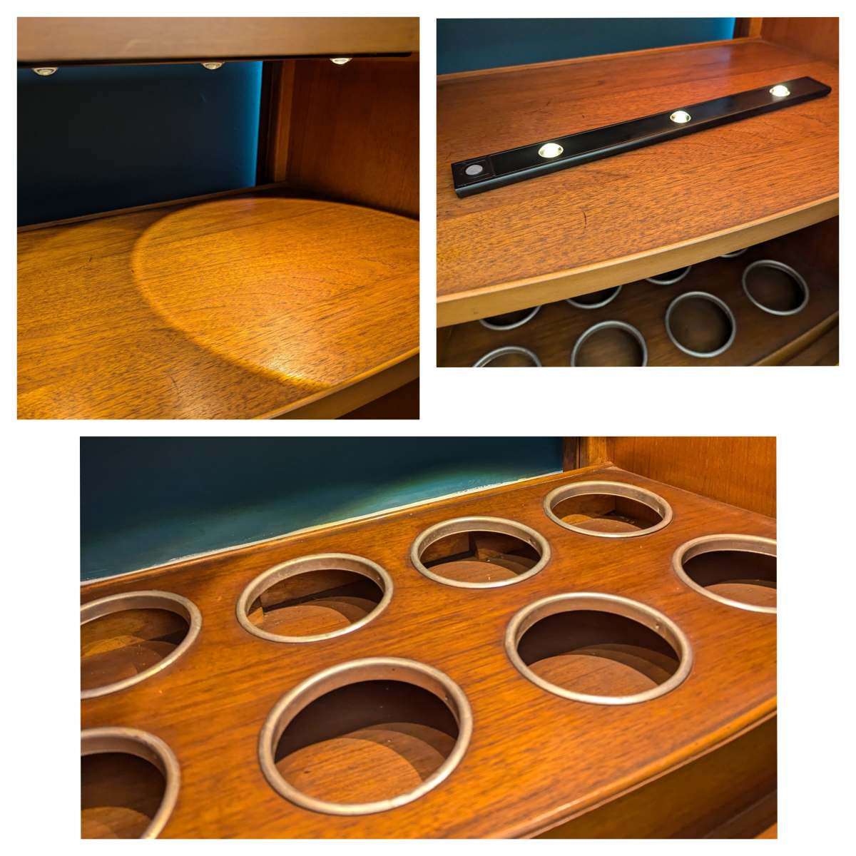 A new, USB chargeable motion sensor strip light has been placed beneath the middle shelf. It is attached by magnetic pads so it can easily be removed to charge. Pads have also been placed beneath the lower shelf, if you’d prefer the light to be on your bottles. The light has several brightness and warmth modes you can switch between to find your preference. This will help you locate the glass or bottle you need without fumbling around in the dark. It is shown in photo #5.