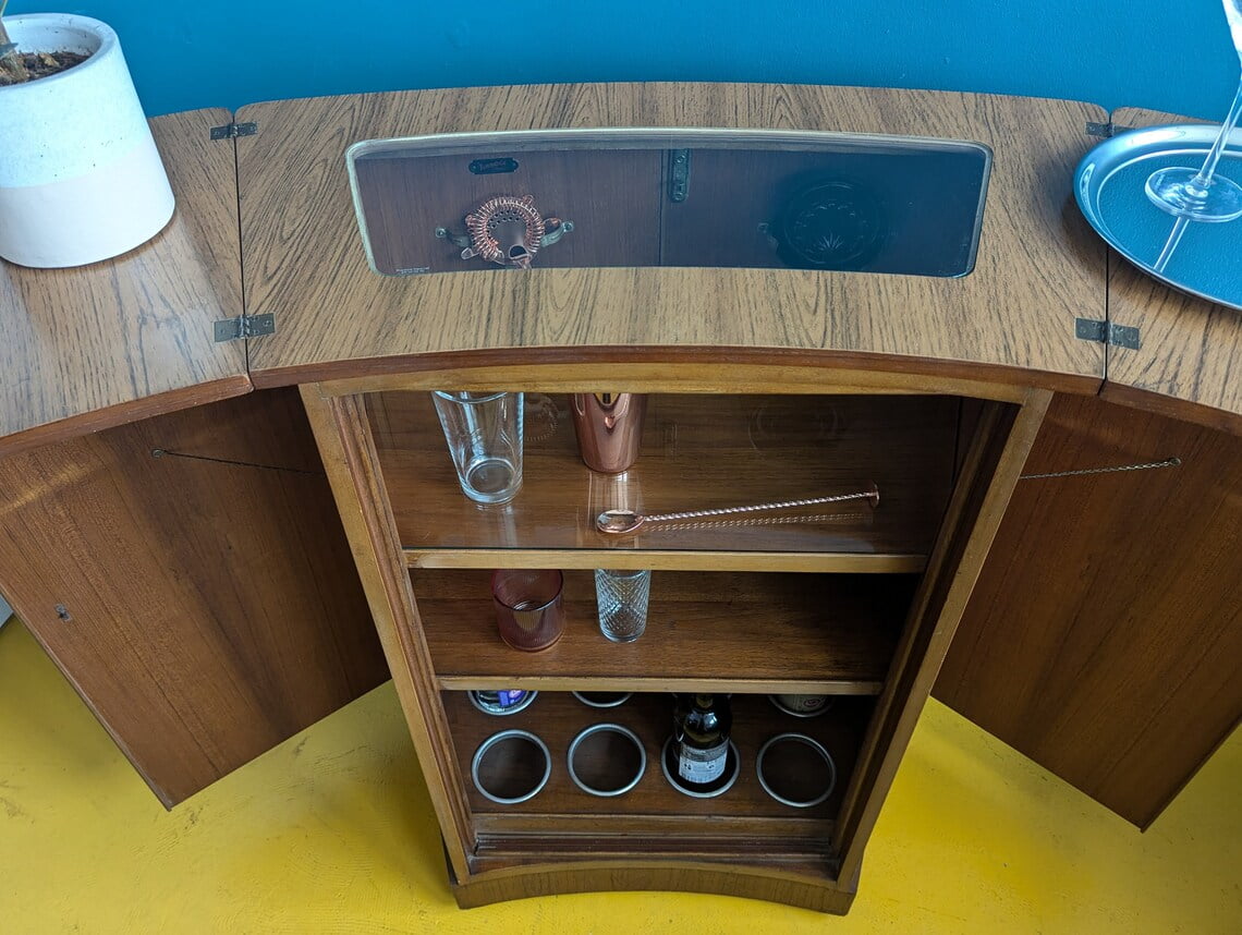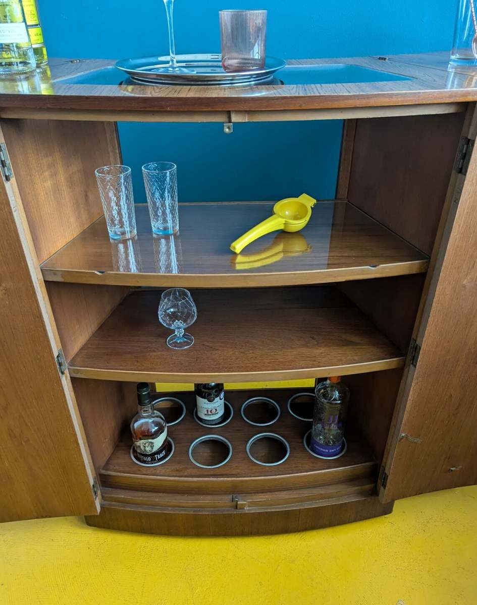 With a base section to hold bottles securely, two shelves above, one with wipe-able glass base. The top has a new thick, curved toughened glass insert alongside the two flaps (topped with wipe-able Formica) that make the curved bar surface to make your cocktails on.