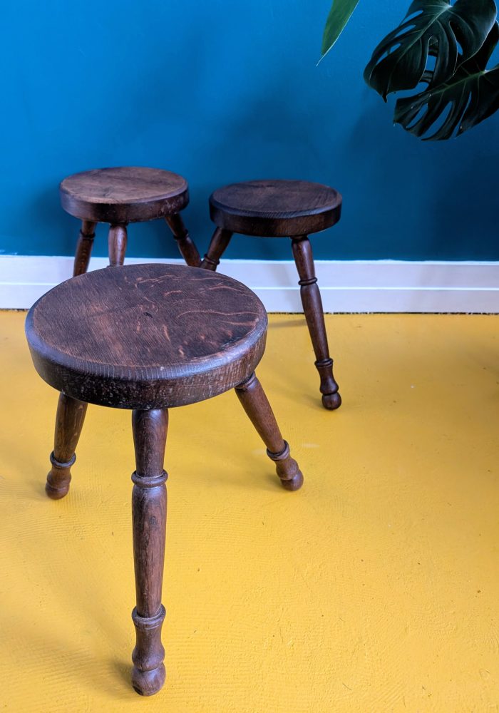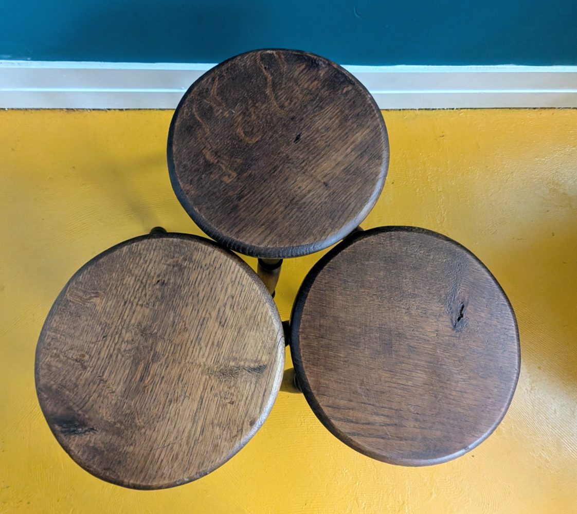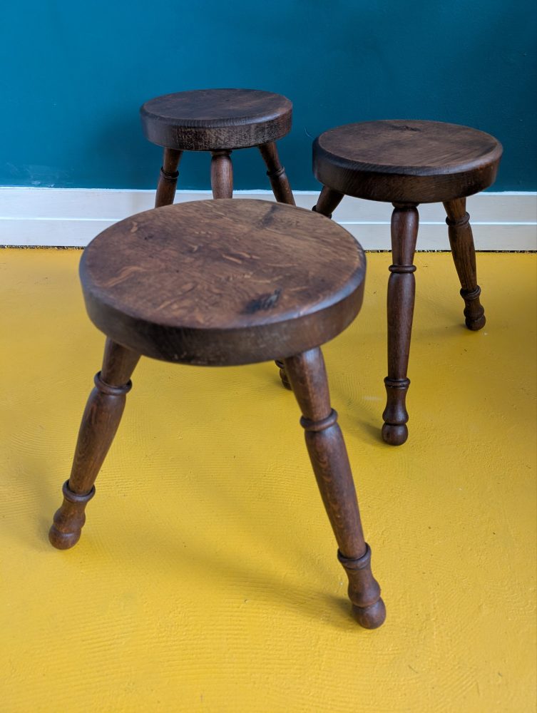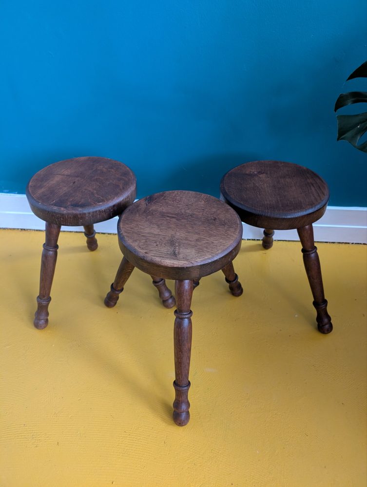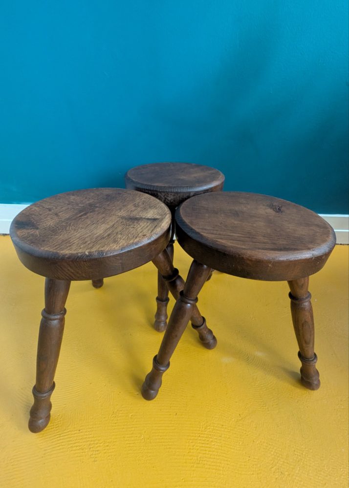 A lovely trio of French oak round stools, on turned tripod legs. These were originally sourced from Brittany.