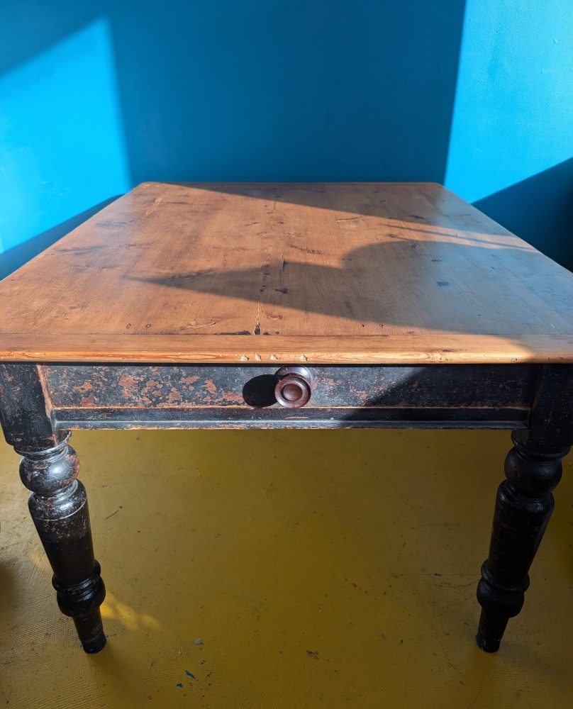 A fantastic mid-Victorian pine scrub top kitchen table with ebonised painted large baluster turned legs and a large drawer with original knob. ***Shipping is not included, it is by collection or courier. Please read details at the bottom of this section*** With its original black paint to the legs and frame, lightly bubbling and textured in places, worn in and out in others, this table is oozing character and originality and a glimpse into over 150 years of history. The large pine top is in excellent, worked condition, with a few light knocks and scrapes as to be expected. One corner is a little gnarly. The drawer with its original central knob runs the full width of the table and is perfect for cutlery and utensils. Scrub top tables would originally have been used as worktops are now, for food preparation, and as such this is quite wide. In a working kitchen which would have been regularly mopped or scrubbed over the many decades, the feet of the legs will have degraded and been cut down. More recently cylindrical wooden black pieces have been attached to raise these back ~4cm to standard table height. These are the only things which … Continue reading Victorian scrub top pine table with drawer
