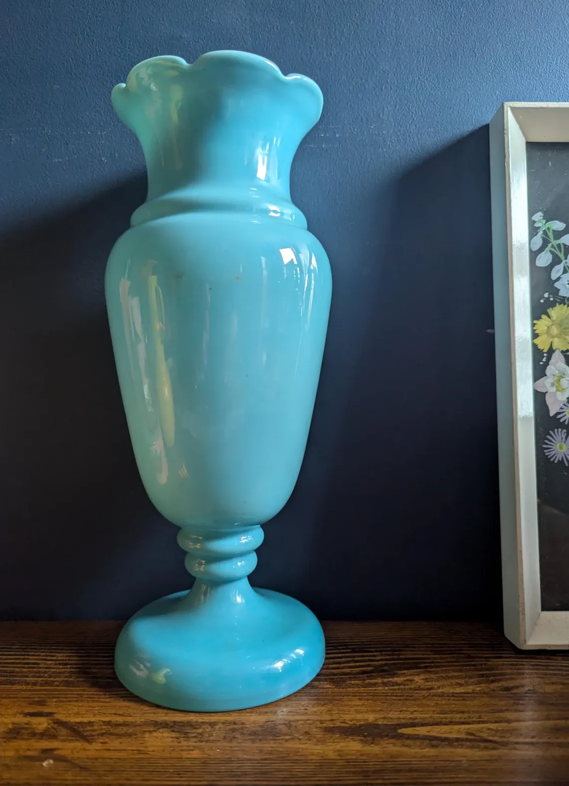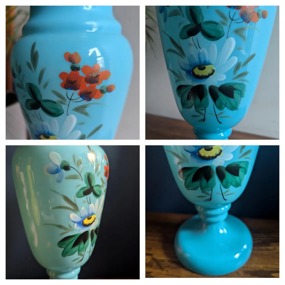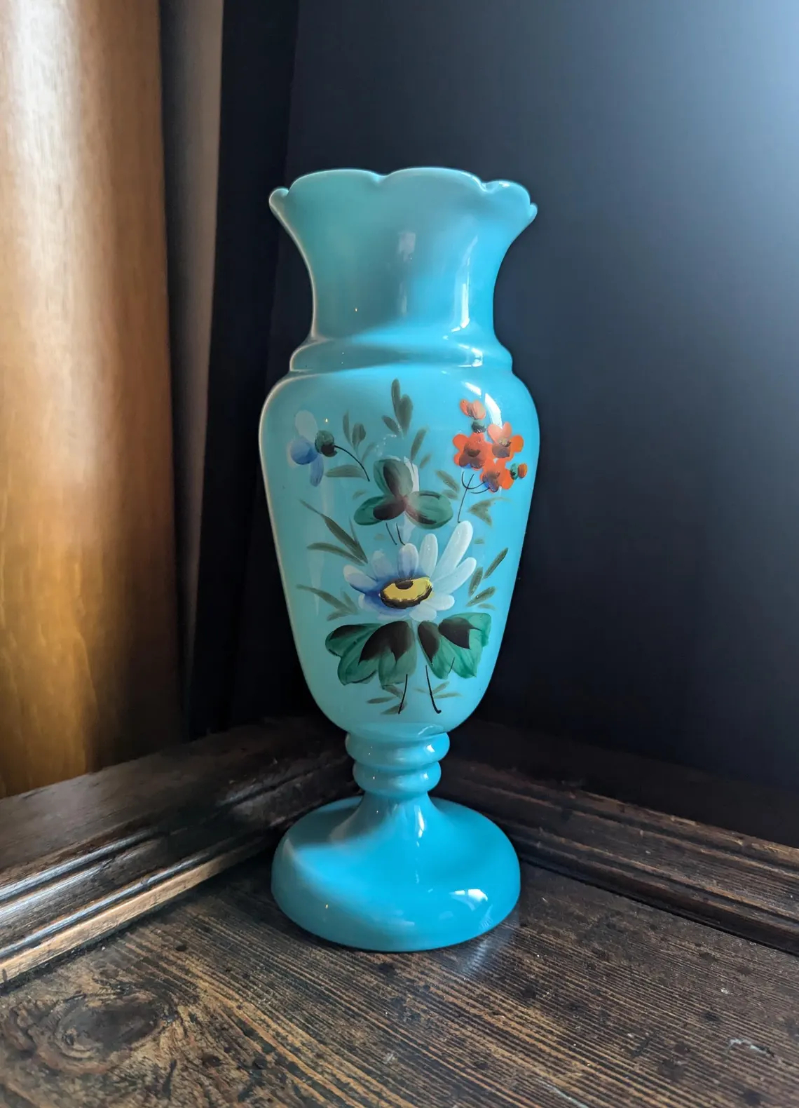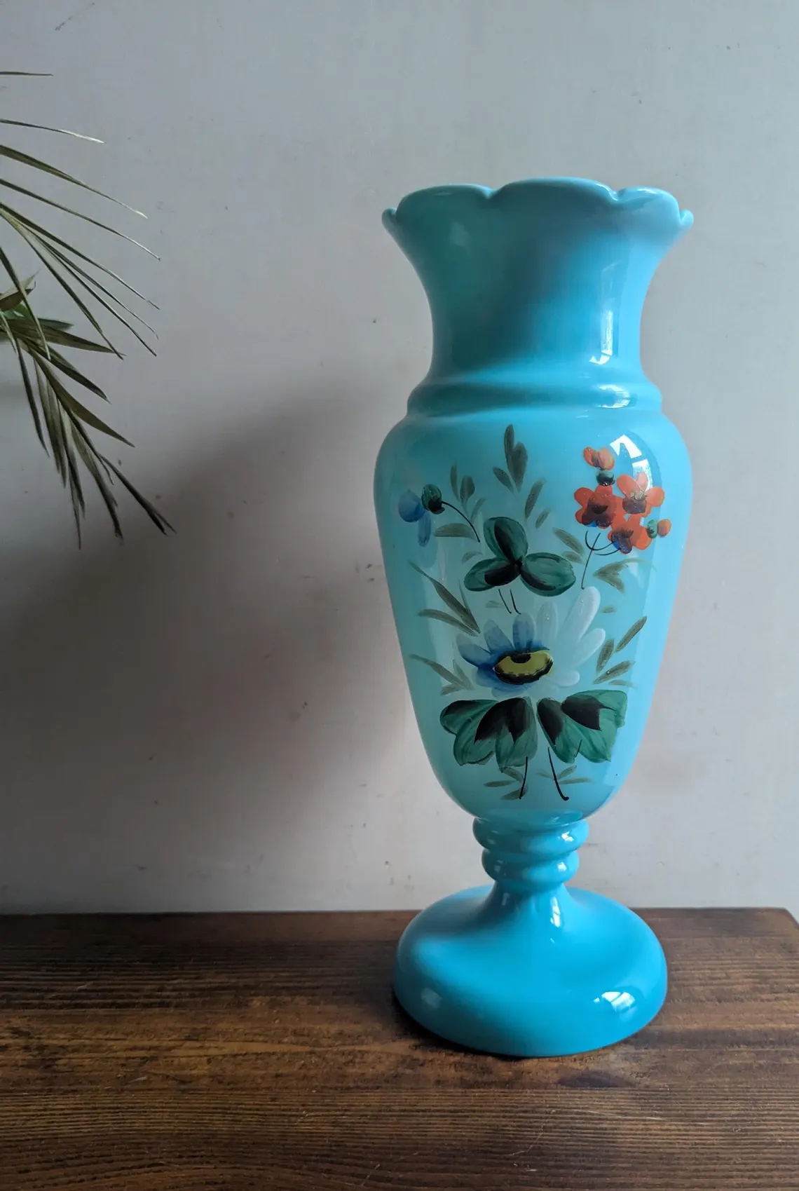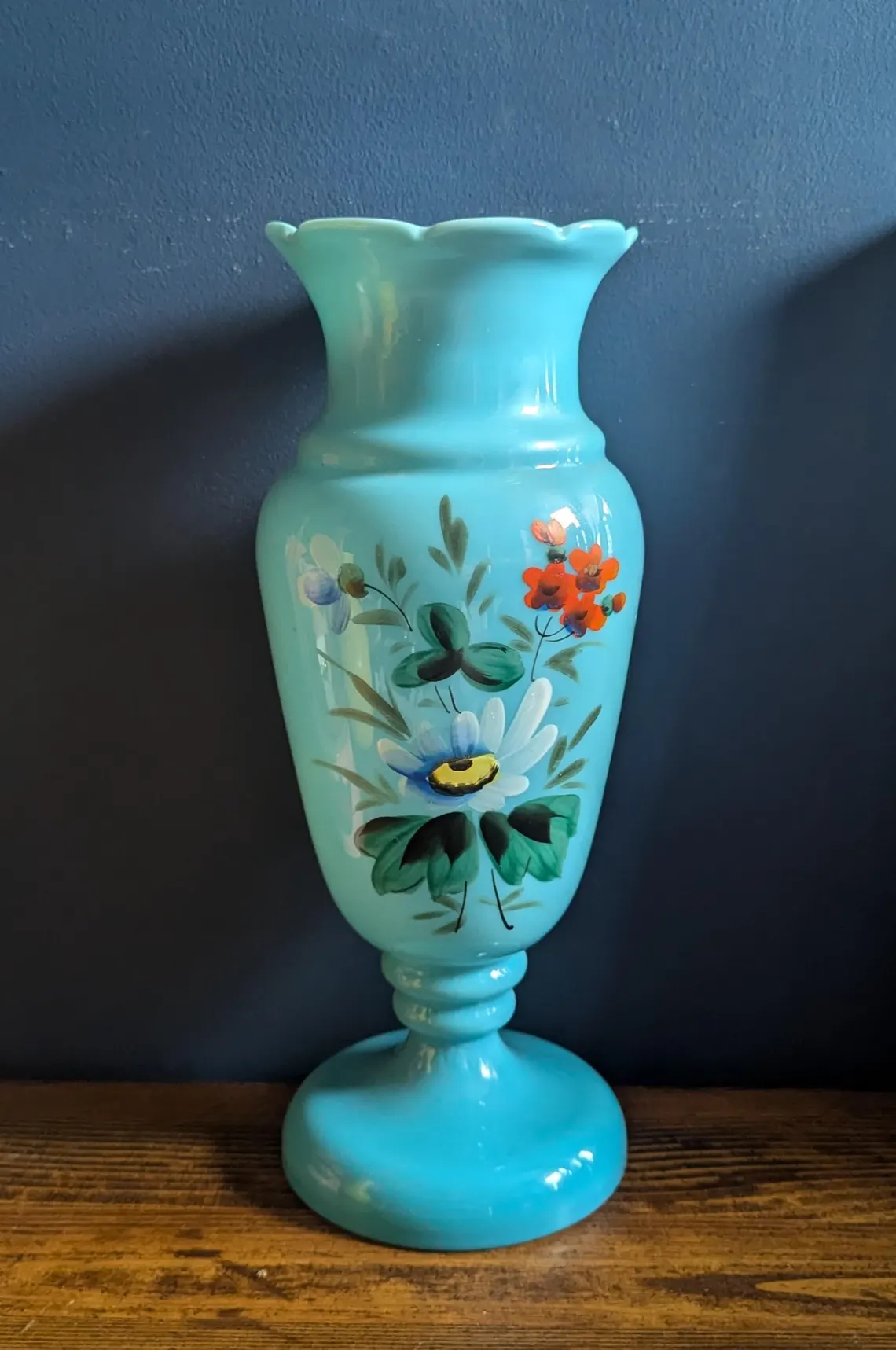 Victorian blue opaline glass vase with hand-painted flowers