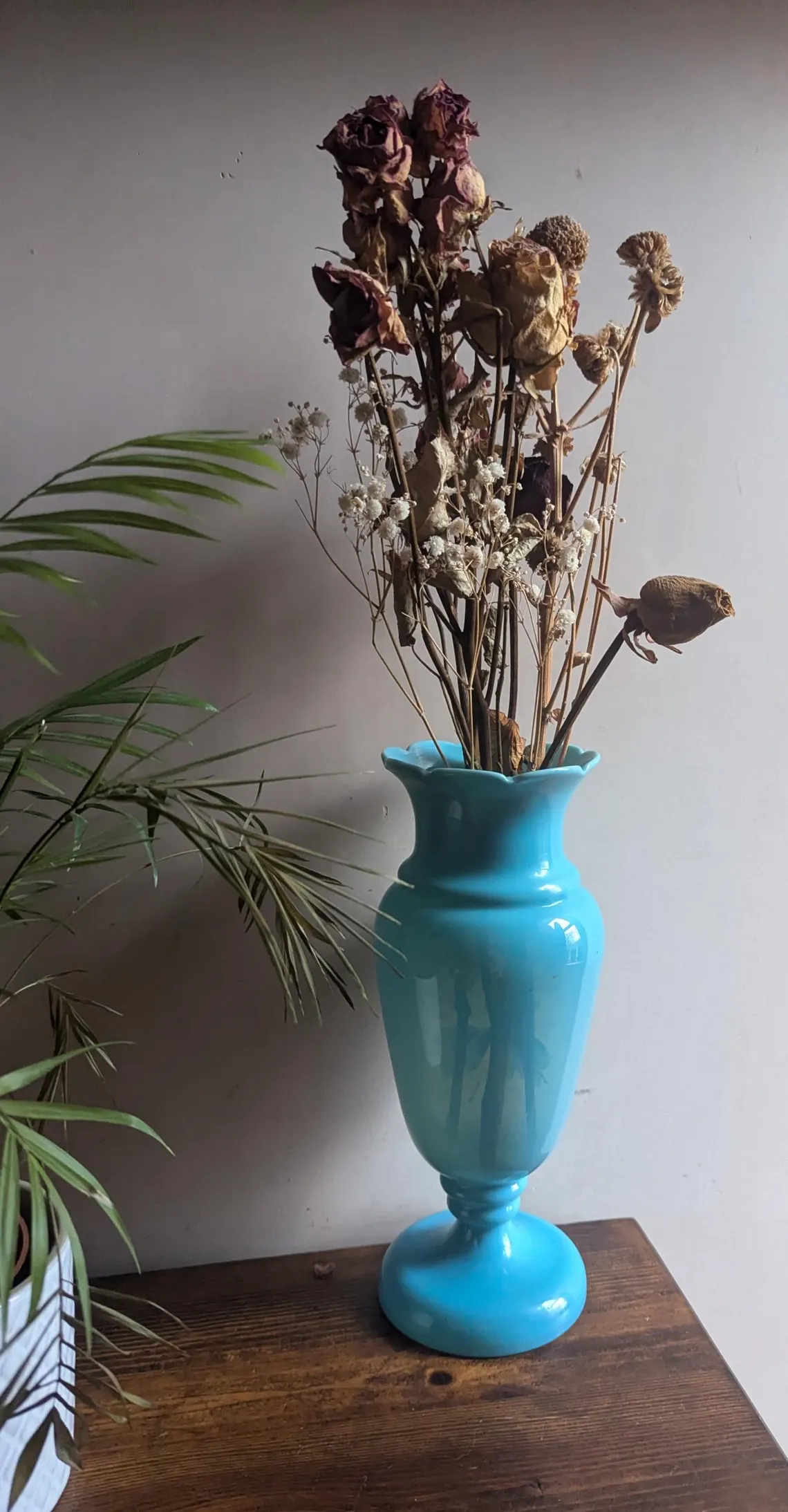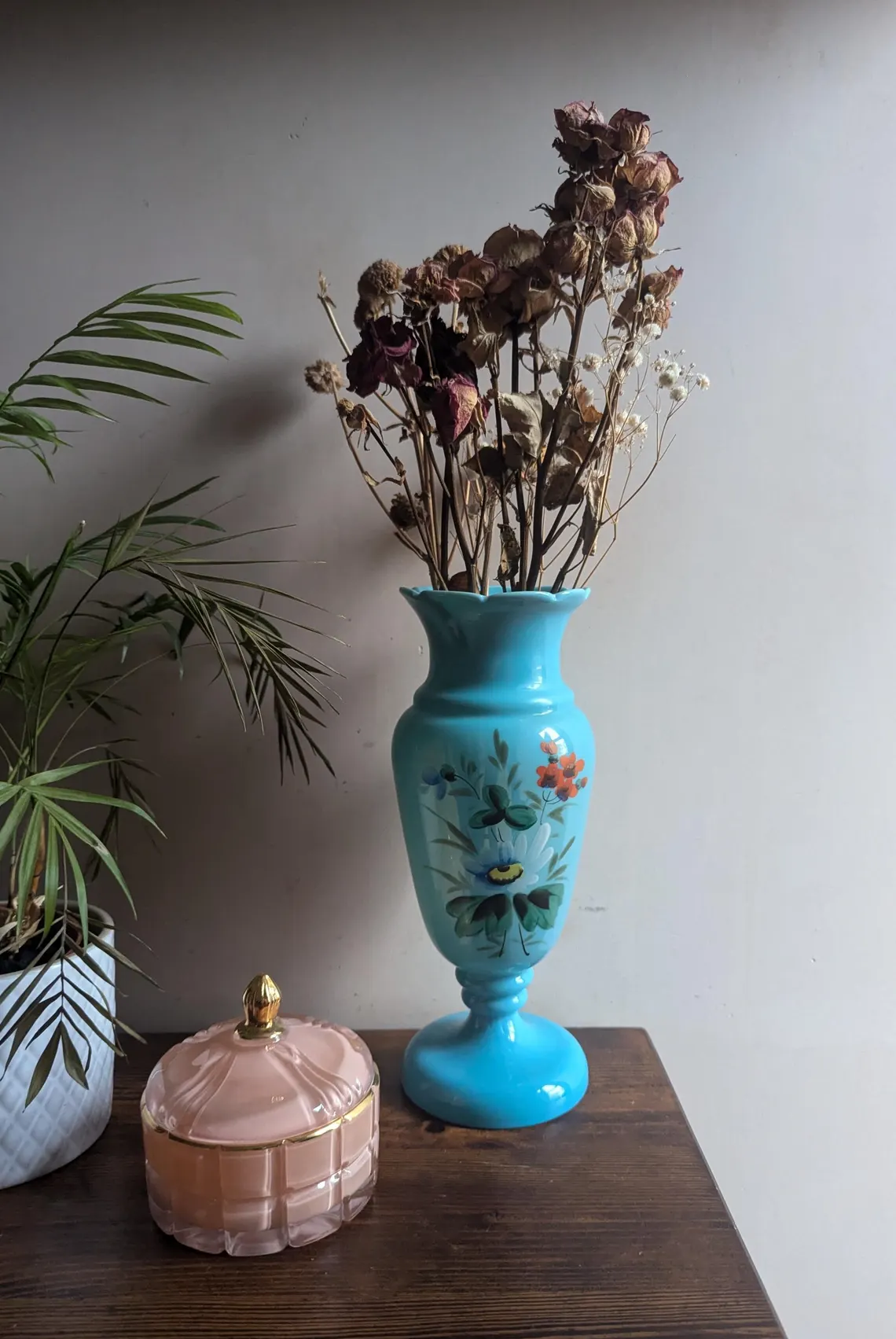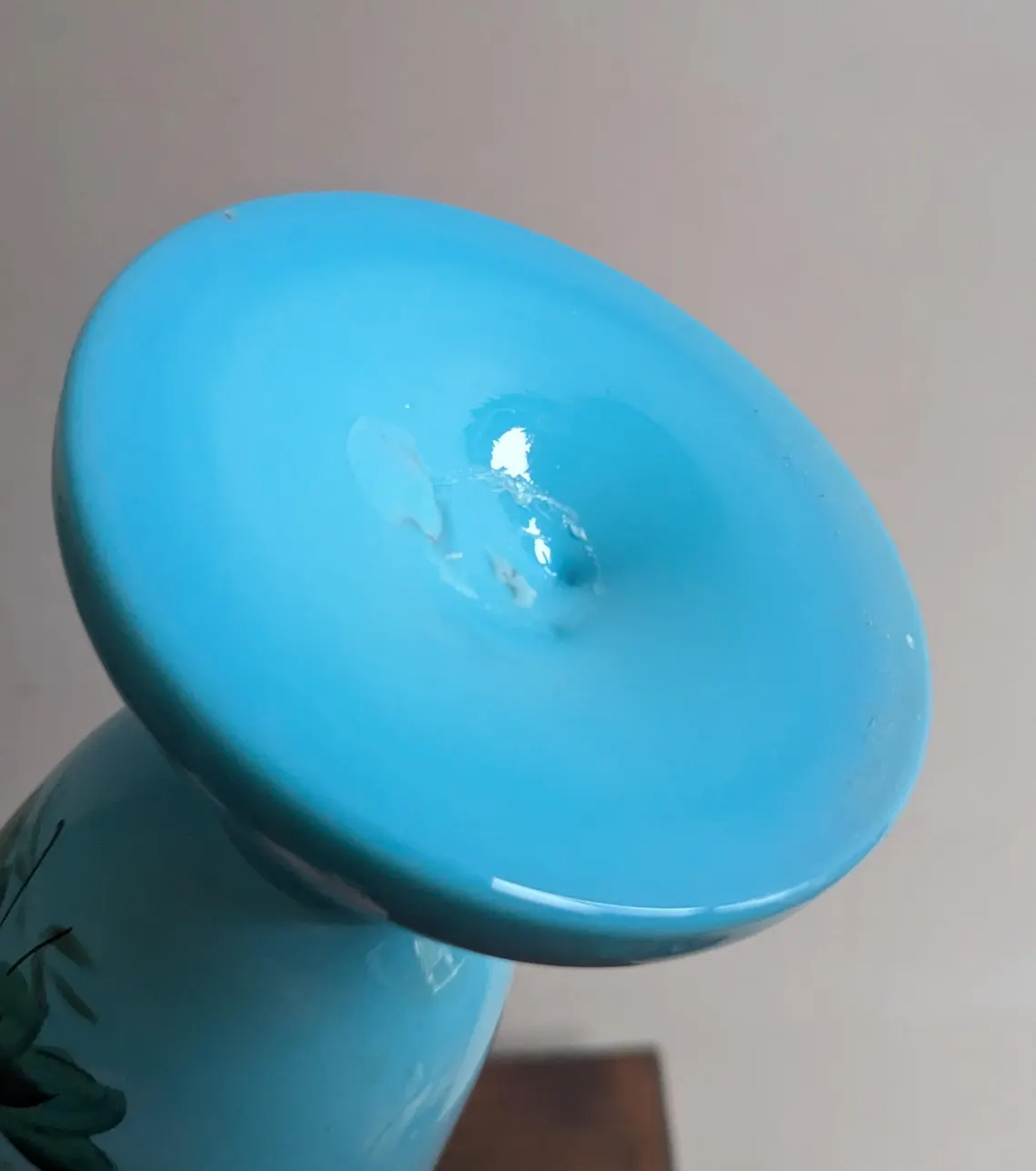 Also looks great with the decoration turned to the wall with the simple pale blue opaque emphasising the form rather than the painted flowers.