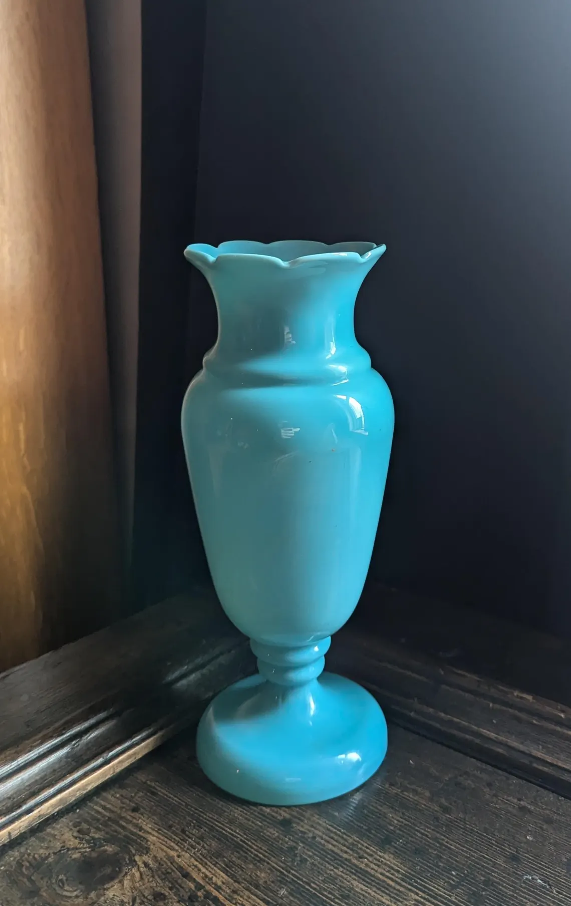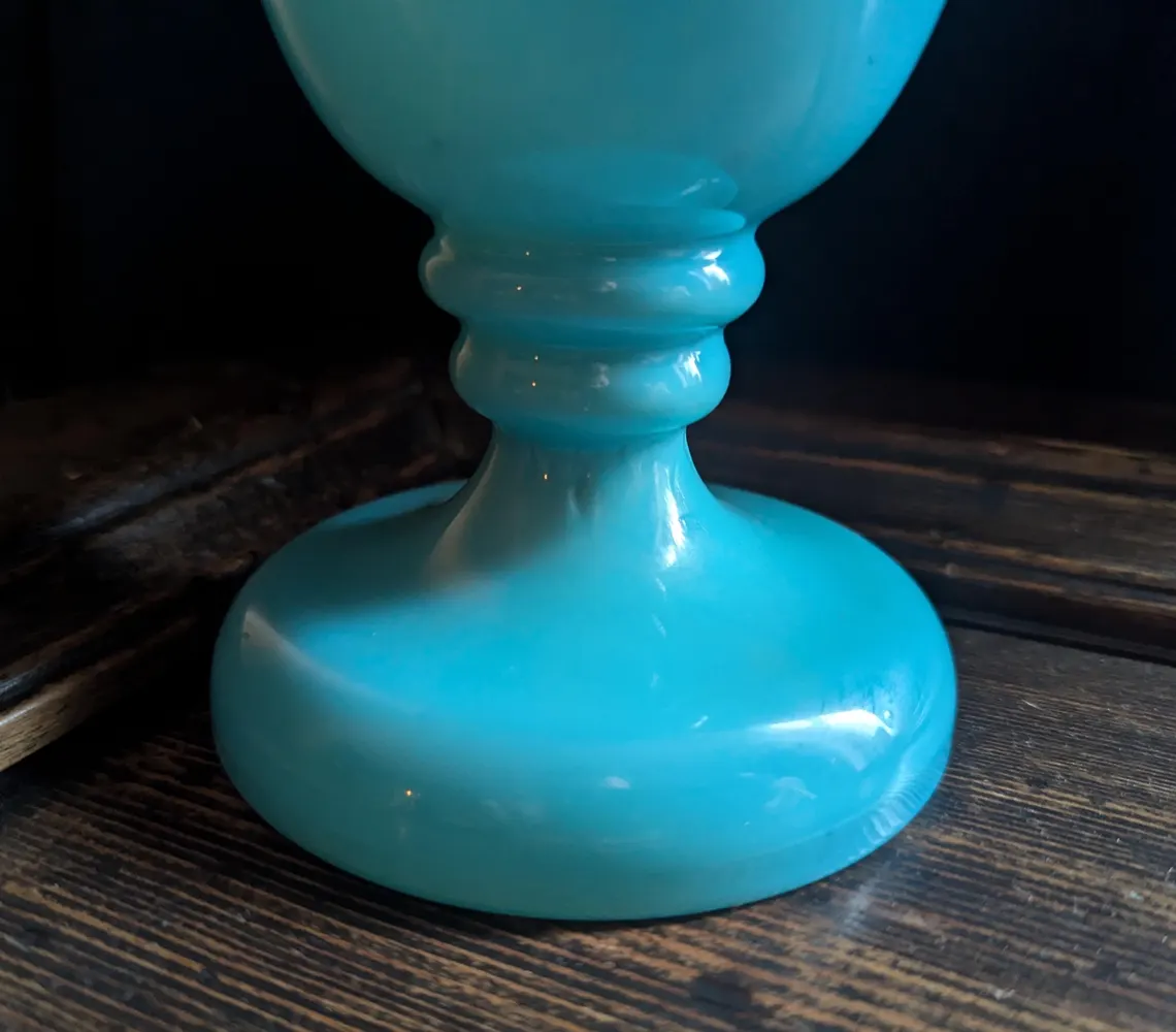 A lovely opaline blue glass Victorian vase with hand-painted flowers to one side.