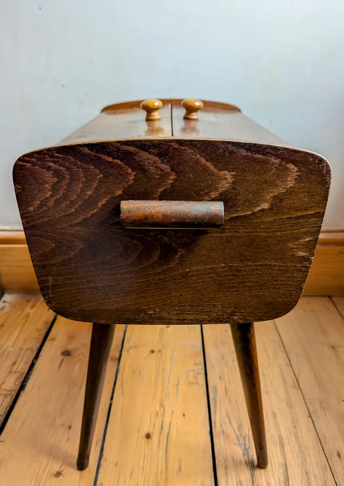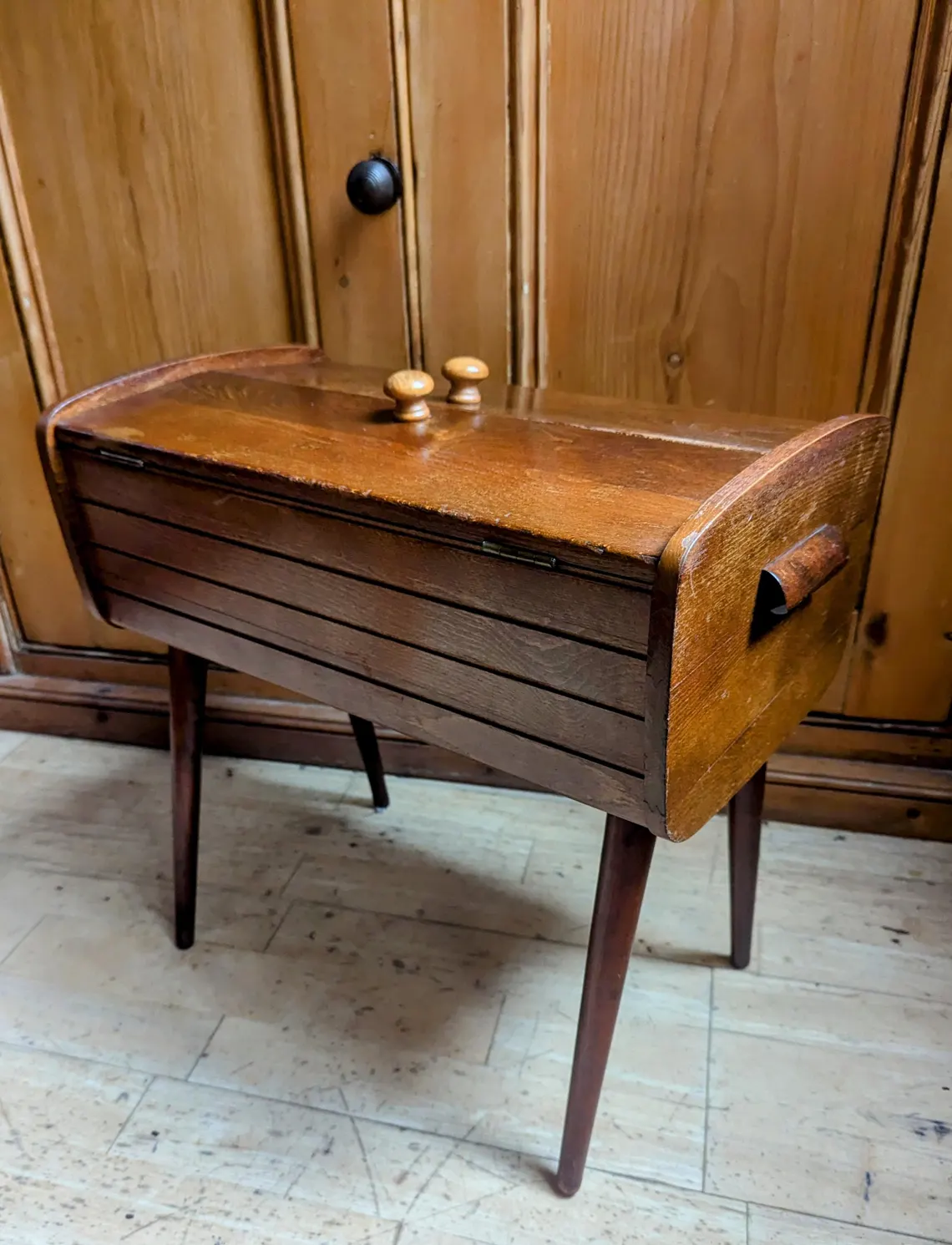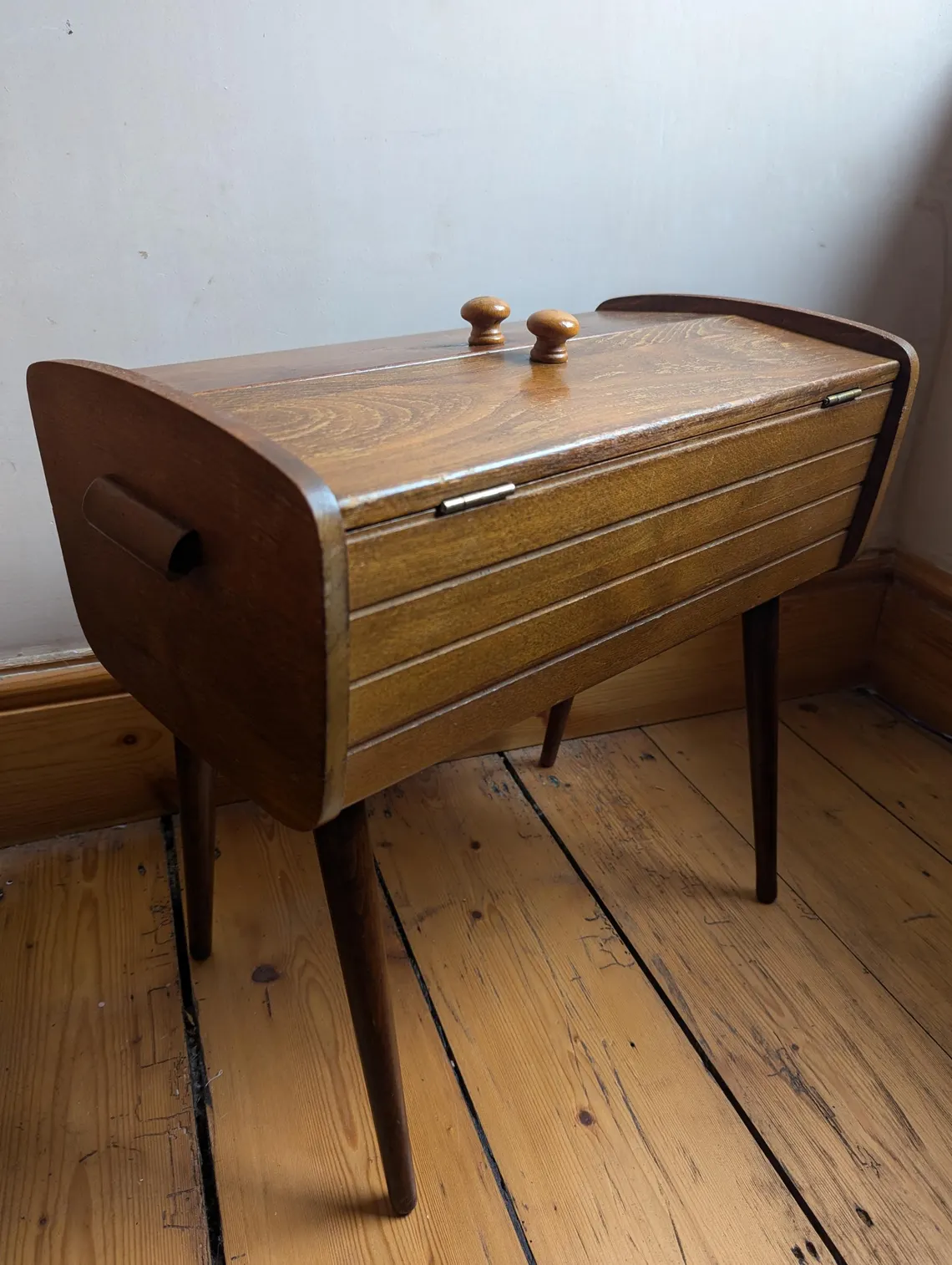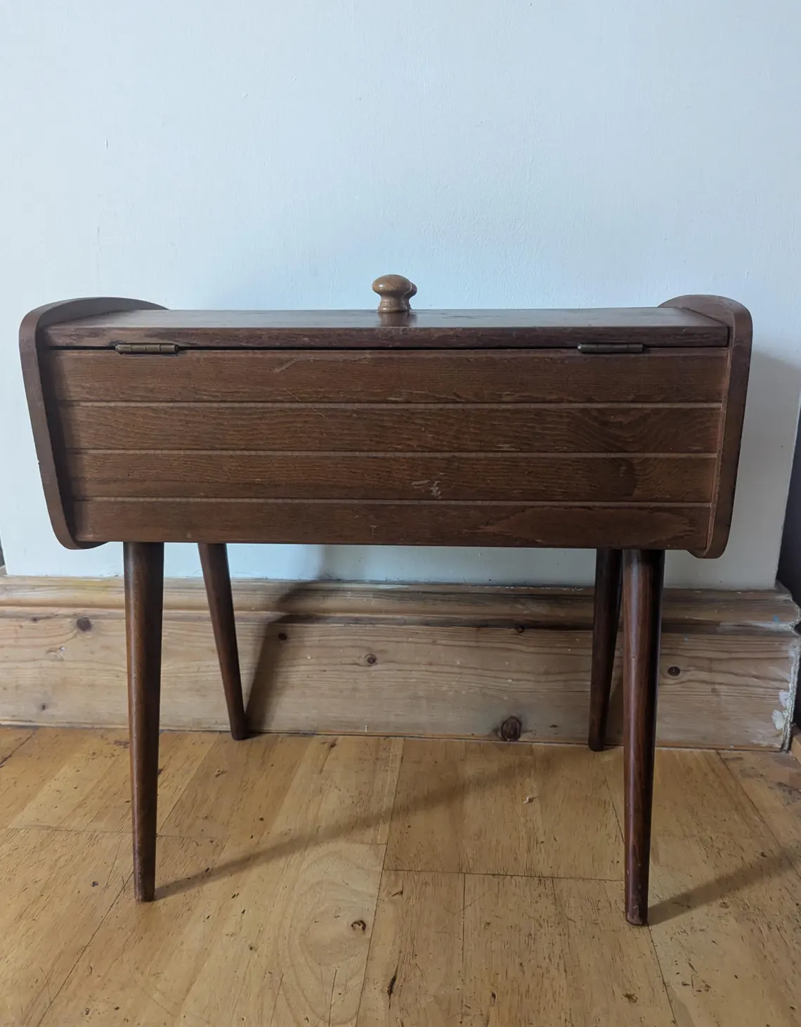 A stylish 1960s vintage sewing, needlework or crafts storage box on rounded tapered dark wood legs.