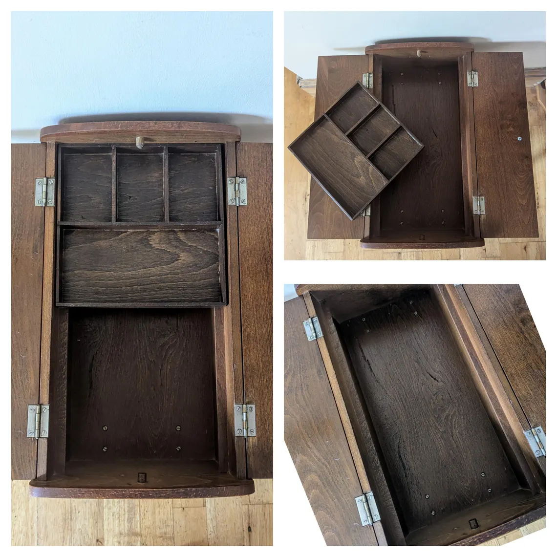 Inside is one large compartment and there is a sliding, removable wooden tray for small bits.