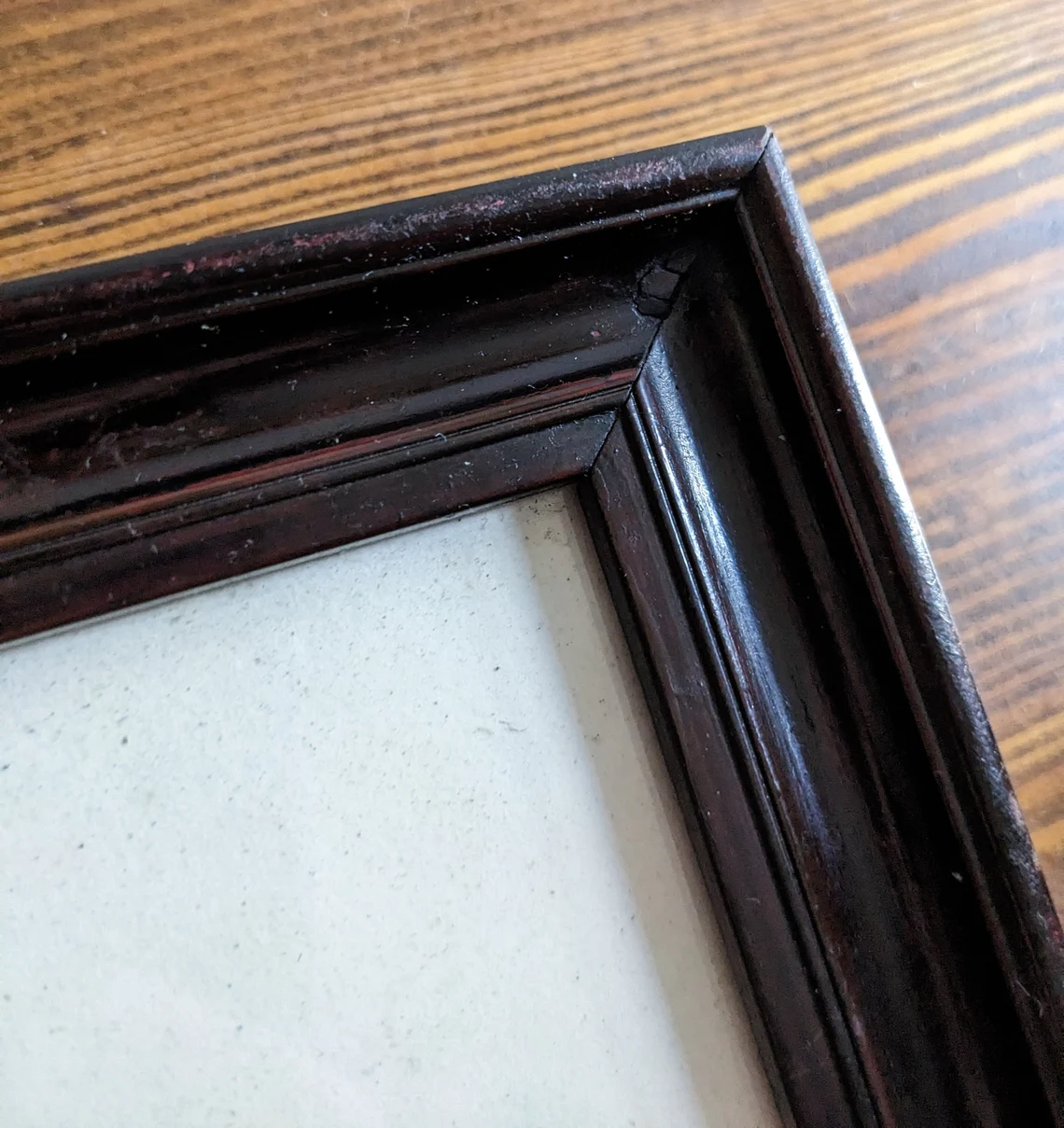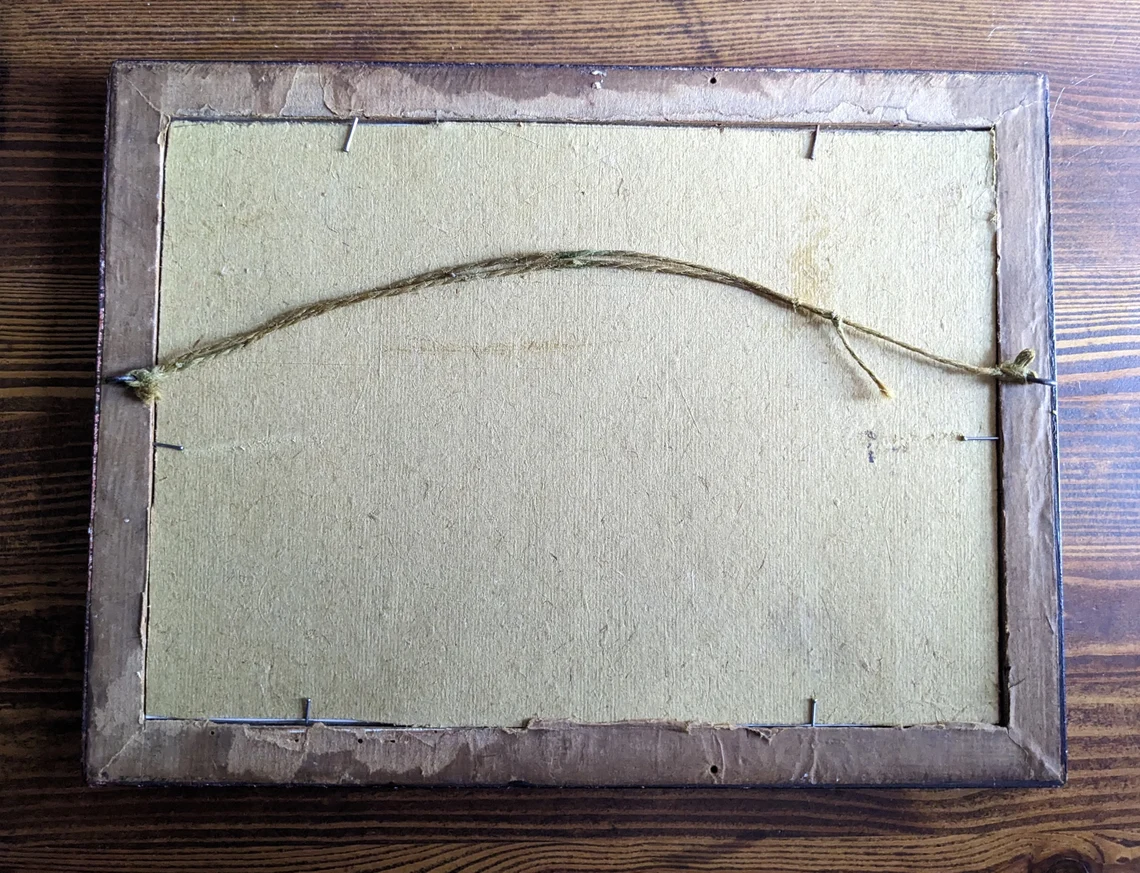 Comes strung and ready to hang in its original vintage solid dark wood glazed frame.