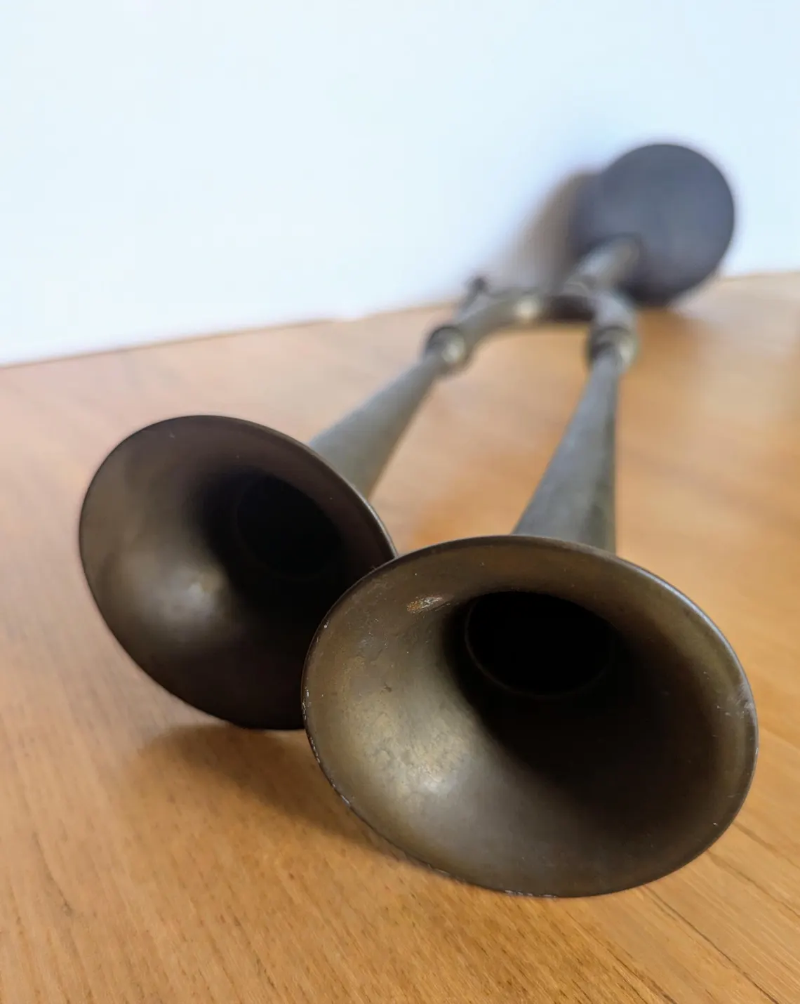 The horn has a great warm golden brass tone and would also look great hung over the fire or by the backdoor to scare off seagulls or the neighbour’s cat who just won’t stop soiling in your garden despite your countless expressions of disdain.
