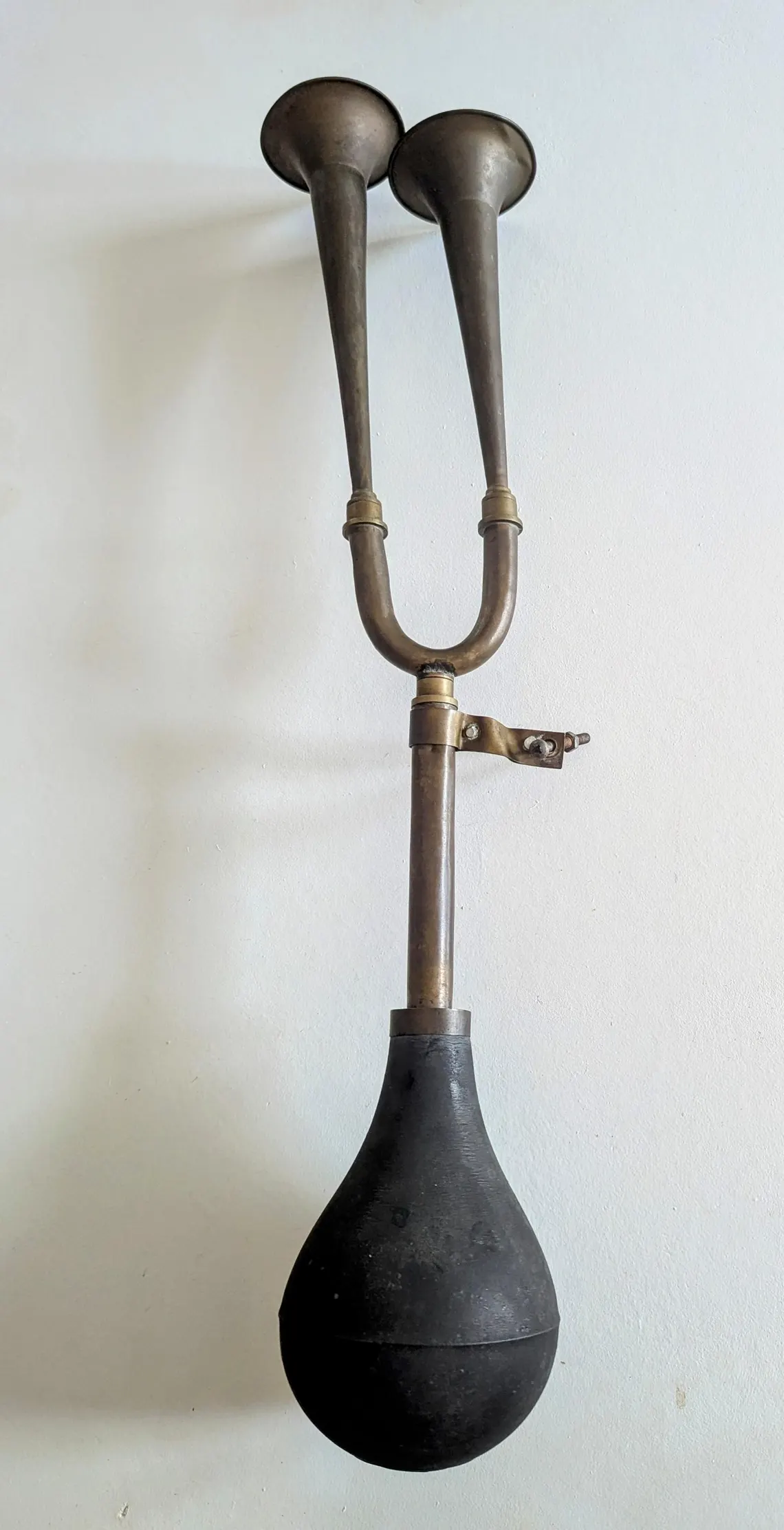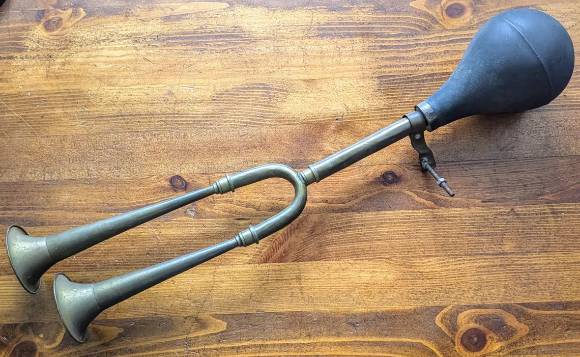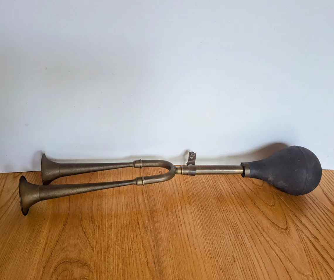A fantastic vintage brass car horn, unusually with twin horns for a two-pitch chord.