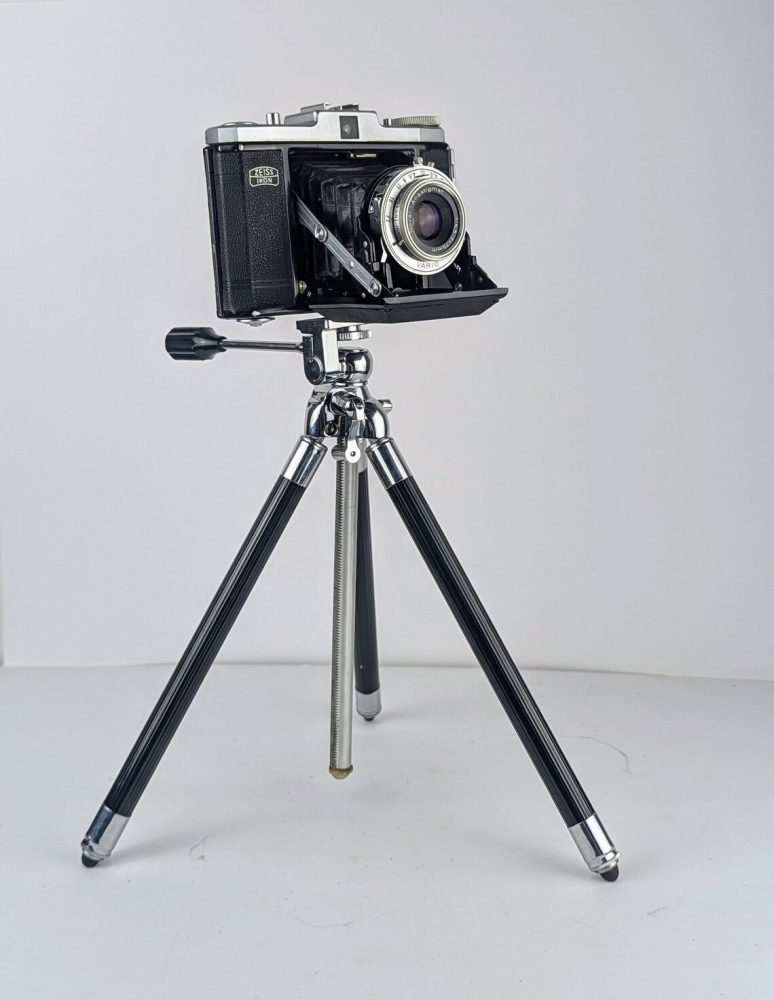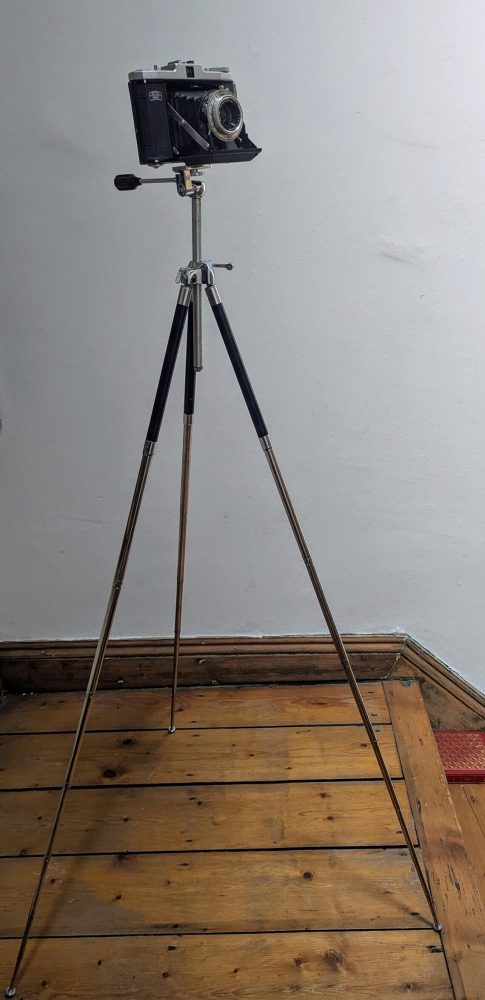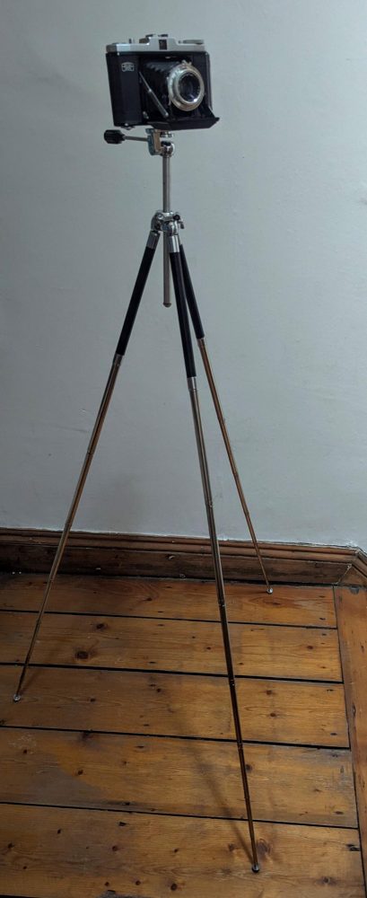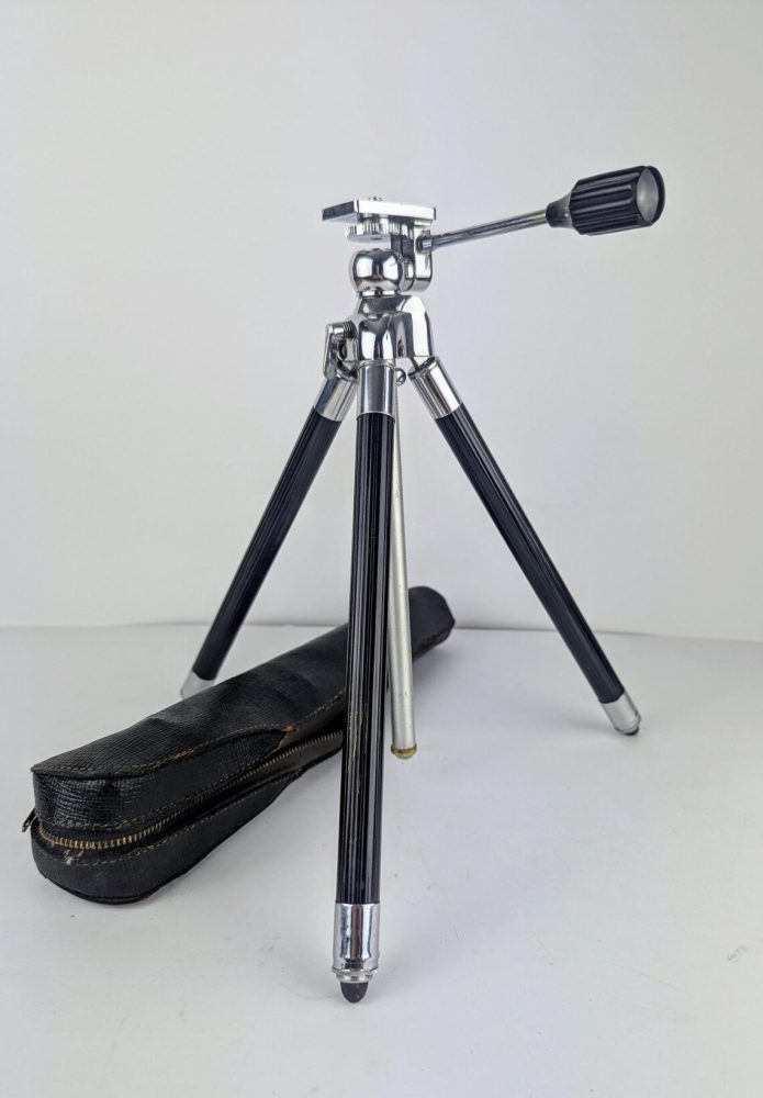 A wonderful looking extending tripod with vertically extending top section, angling handle and extendable legs.