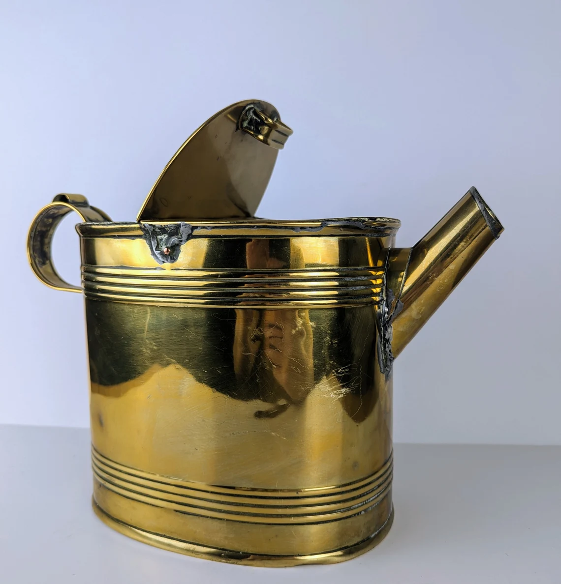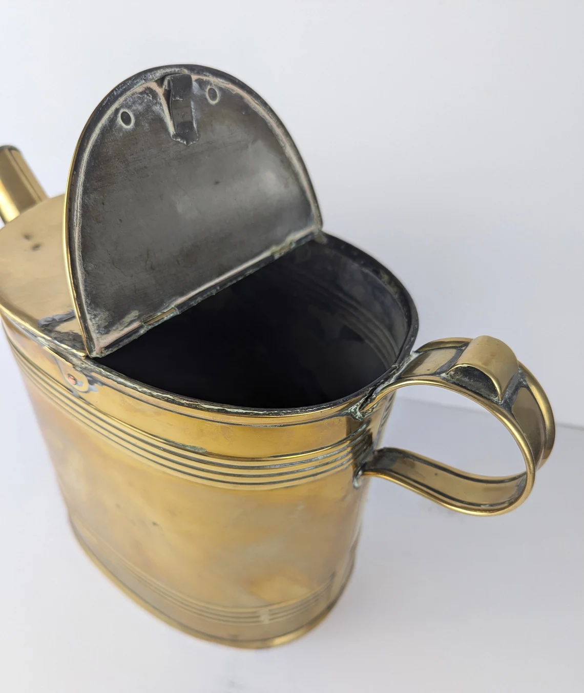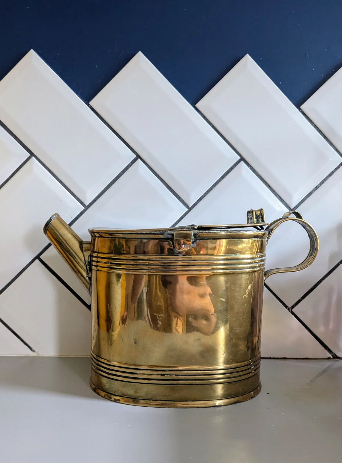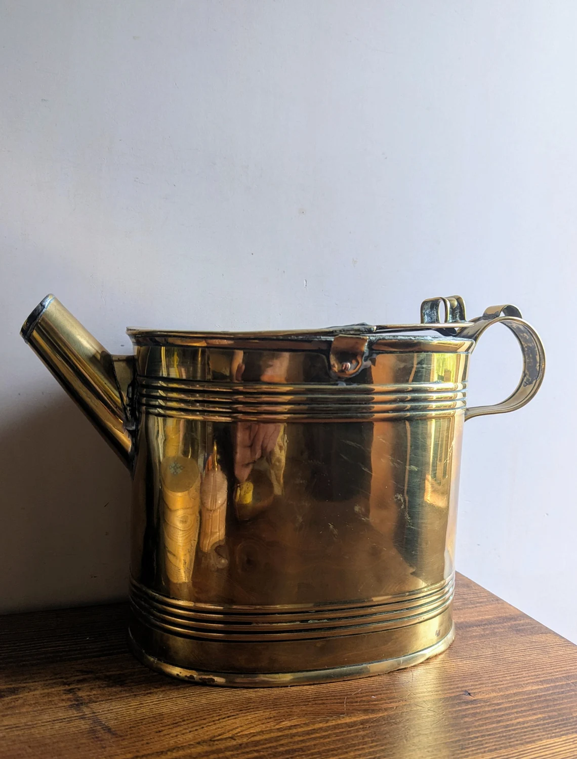This is a delightful brass watering can with an oval form with attractive horizontal bands.