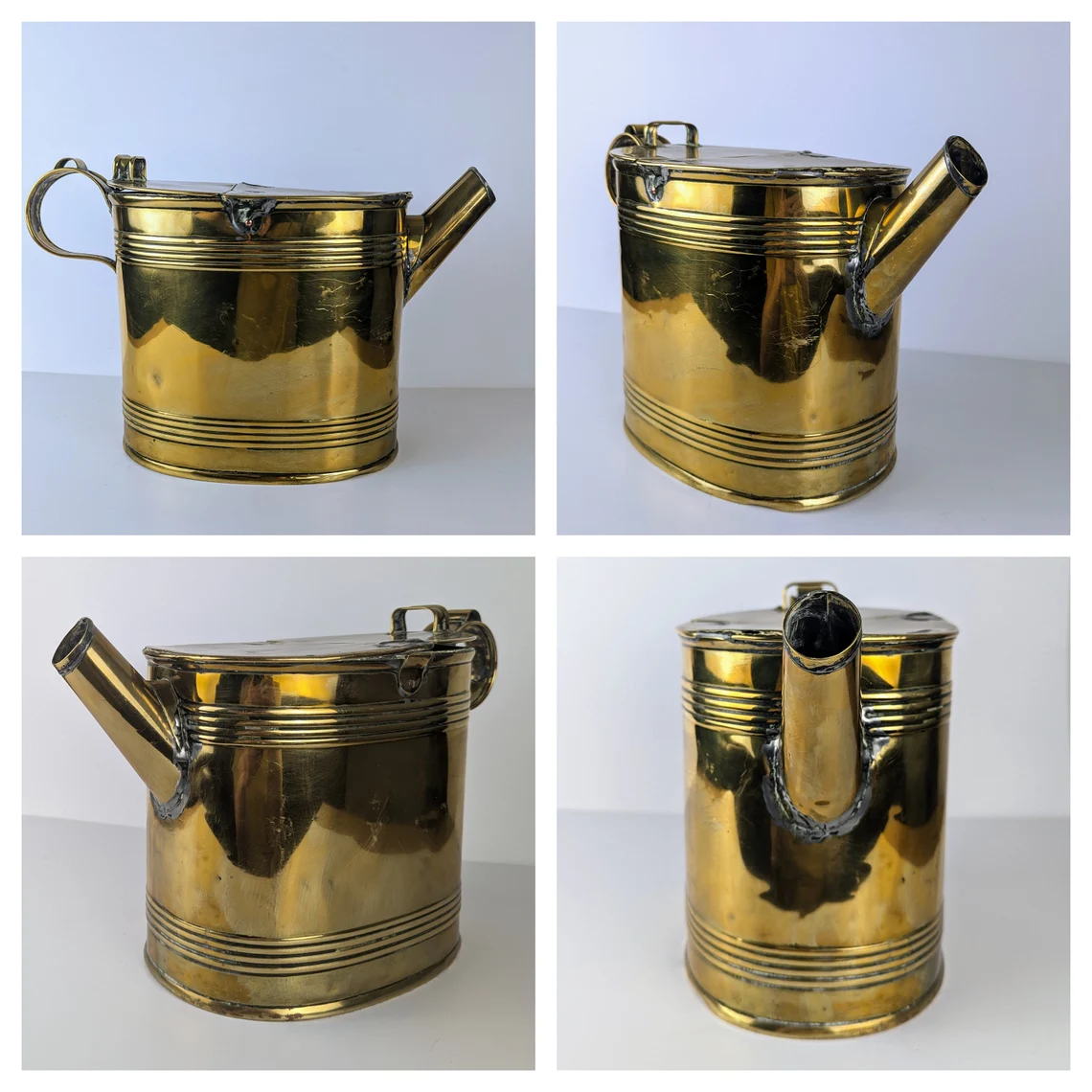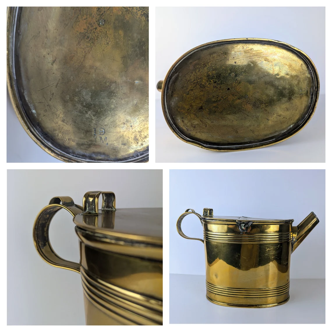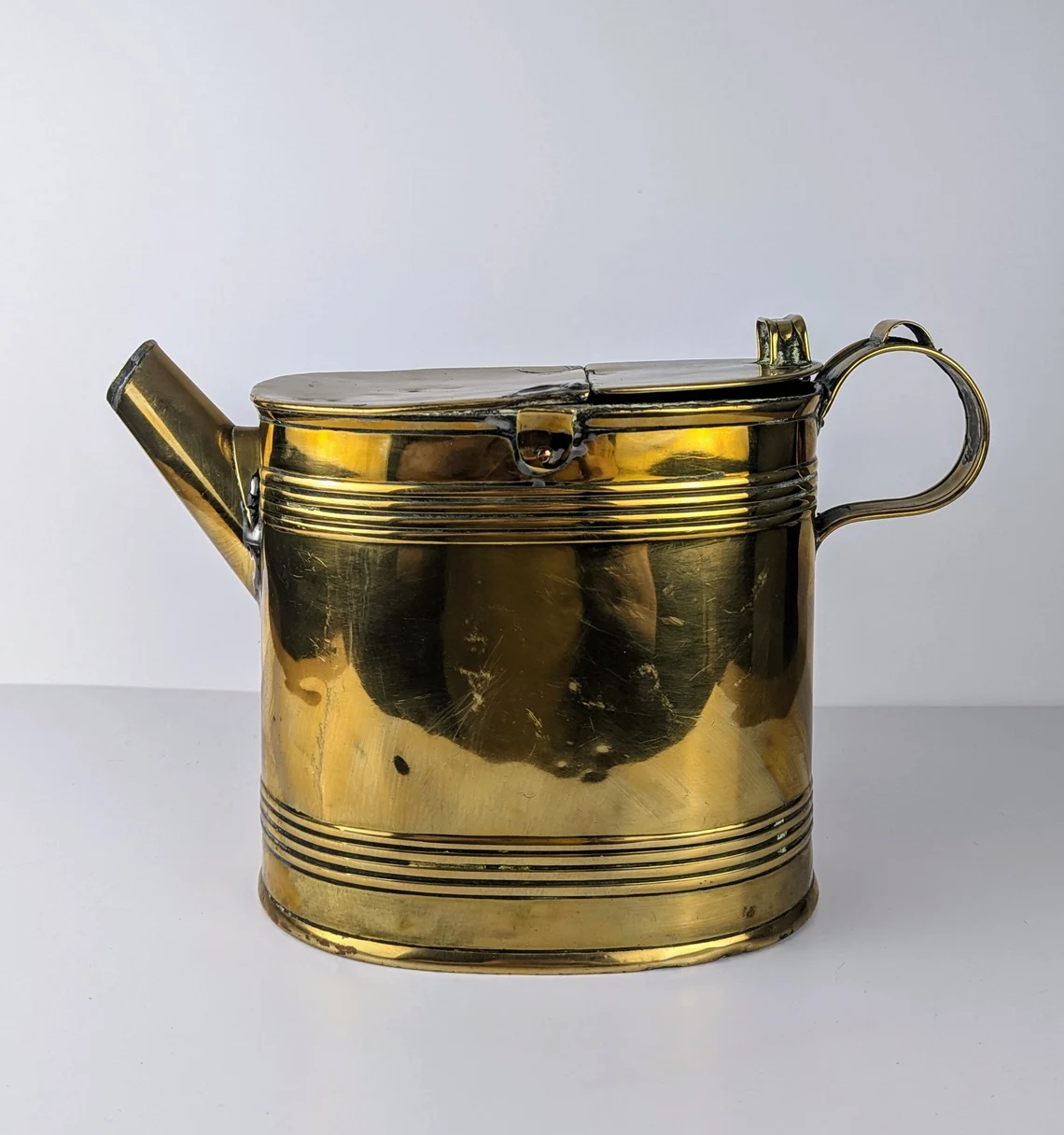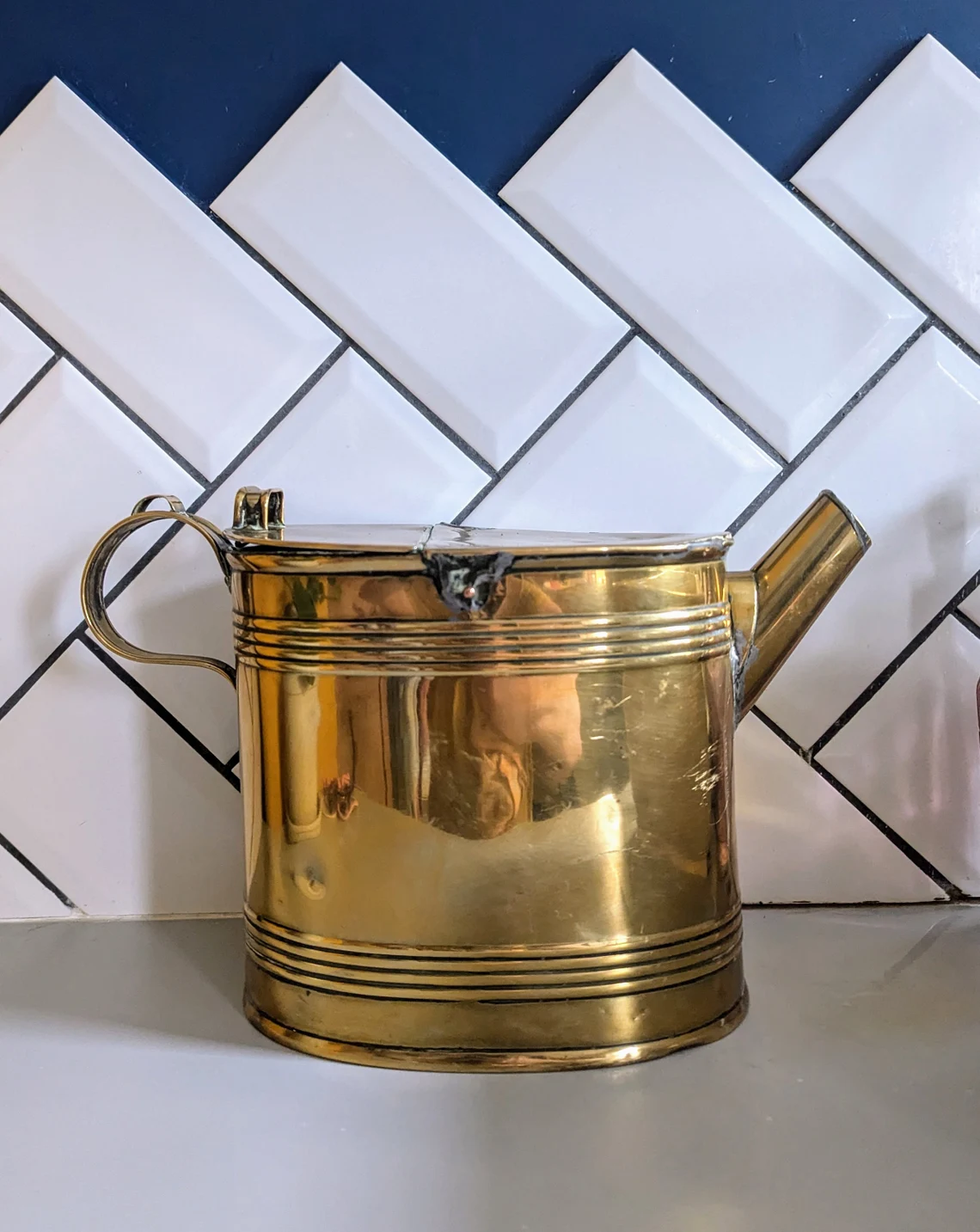 This is a delightful brass watering can with an oval form with attractive horizontal bands.