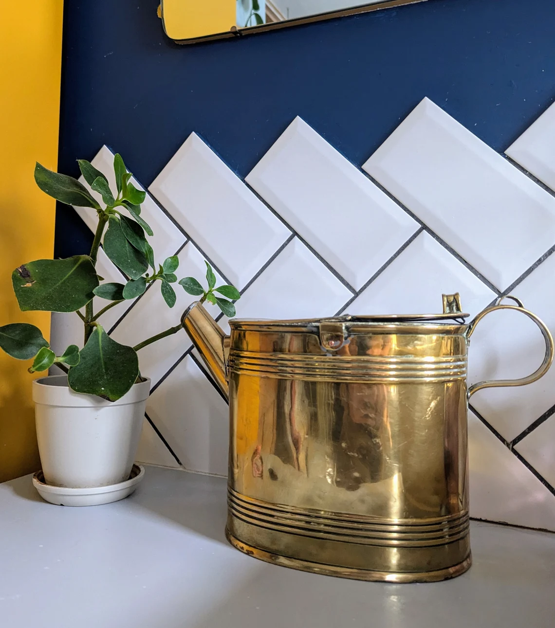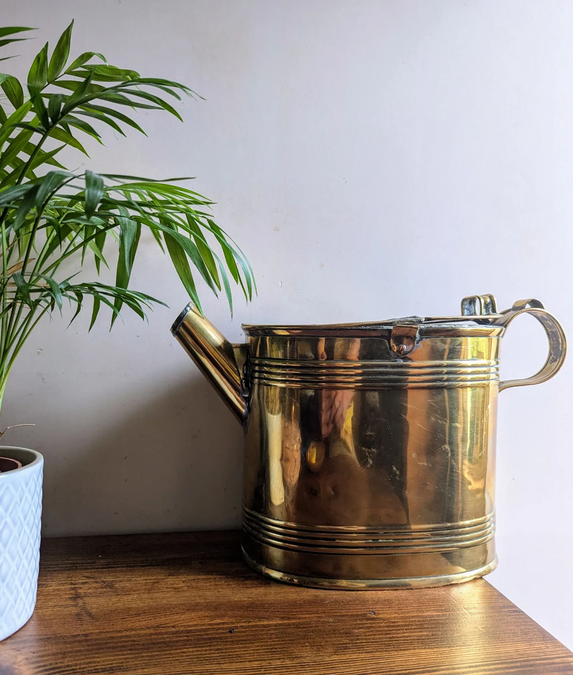 The top is raised a little on one side and the main handle no longer present, but the can functions perfectly well and is a lovely warm, shiny vintage piece to nestle amongst your house plants.