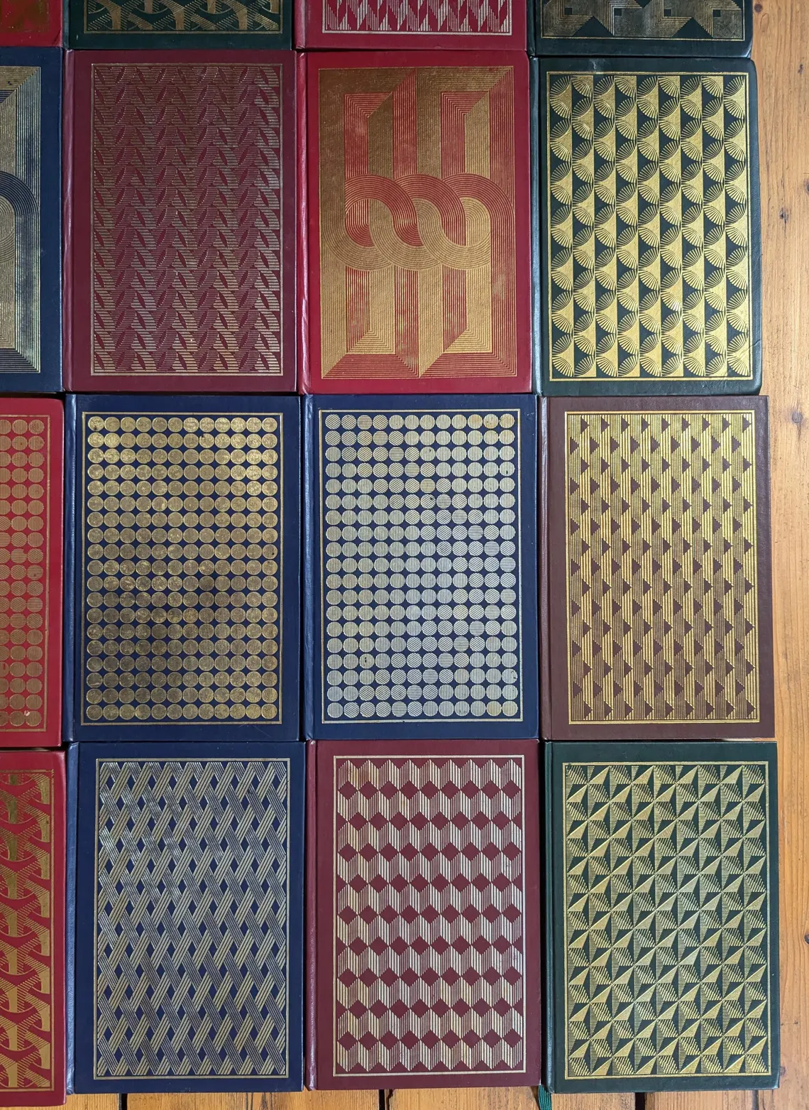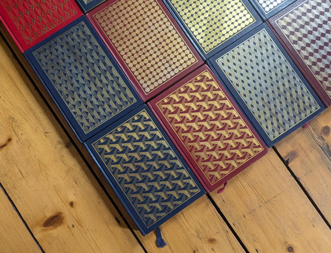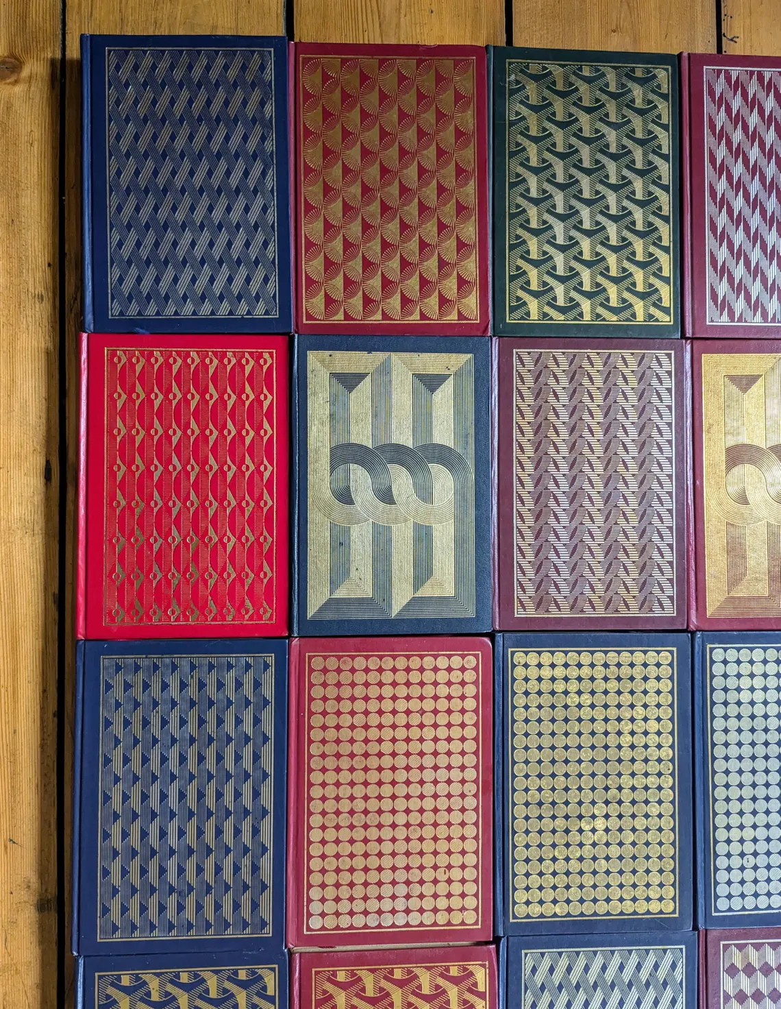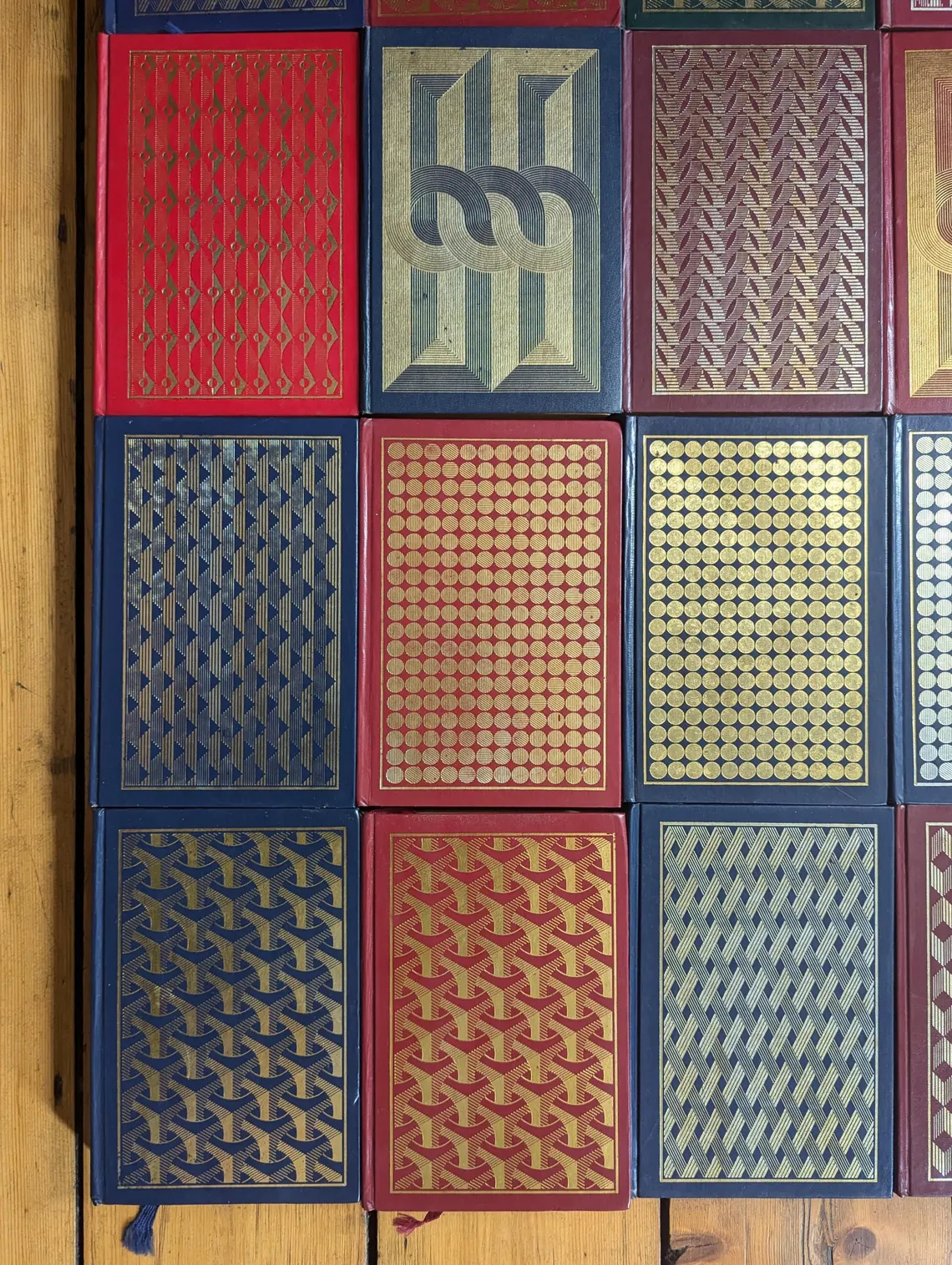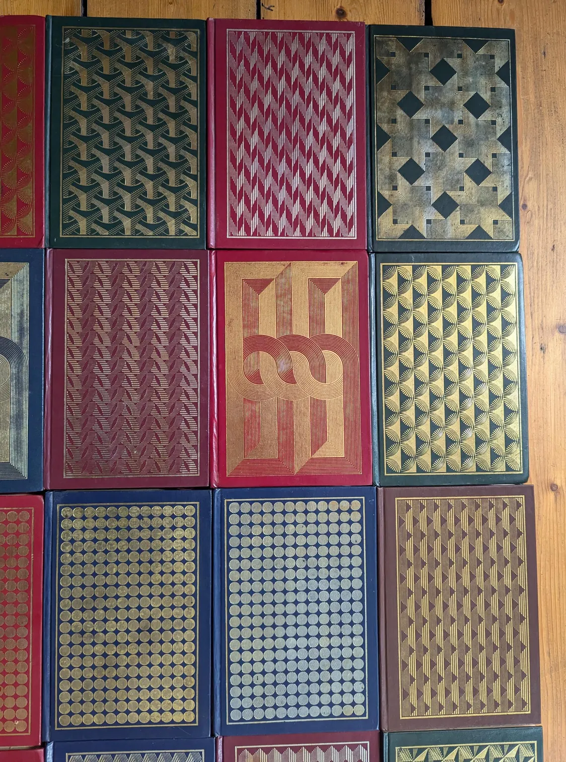 With fantastic hardcovers and very attractive and decorative geometric gilt embossed patterns.
